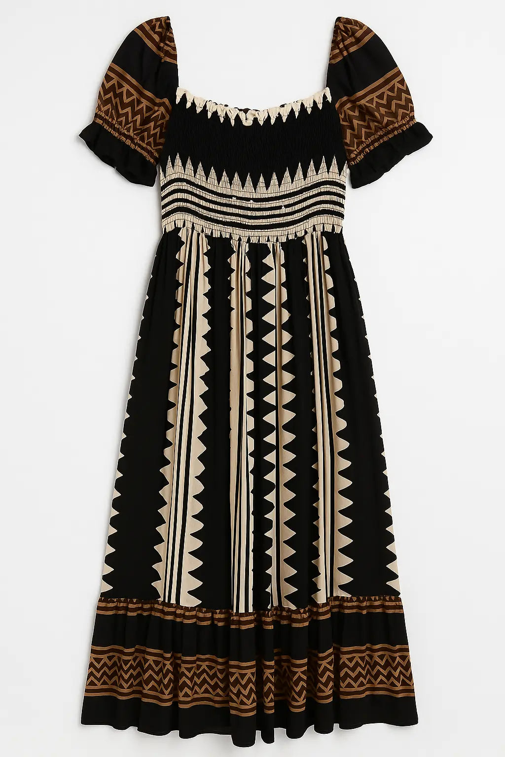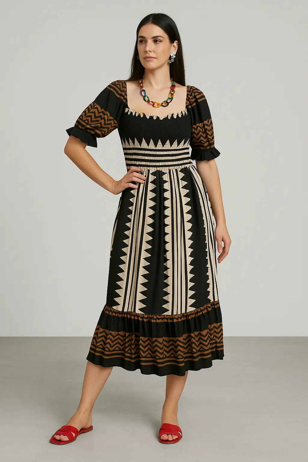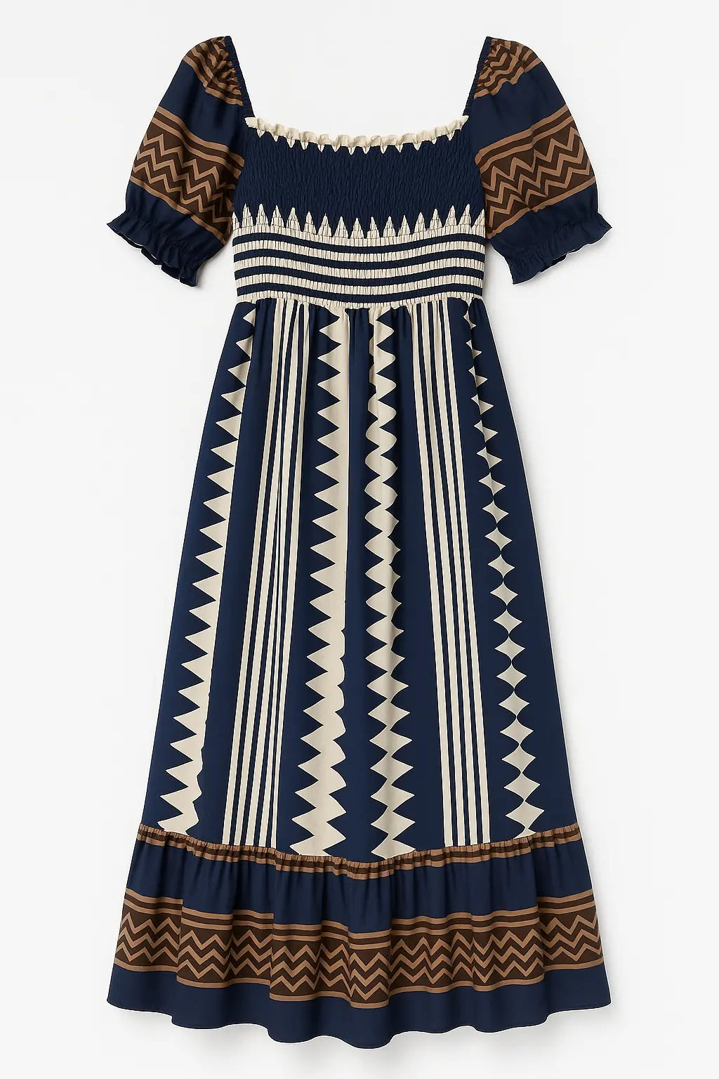 Lasciati avvolgere dallo stile boho chic con questo abito lungo in tessuto fluido stampato, perfetto per la stagione calda. Il corpino a fascia elasticizzato in punto smock valorizza la silhouette garantendo comfort e aderenza, mentre le mezze maniche a palloncino con elastico in cuffia e delicata rouche aggiungono un tocco femminile e romantico. La stampa geometrica nei toni del blu navy, beige e marrone richiama suggestioni etniche, rendendolo ideale per le vacanze, il tempo libero o un look urbano disinvolto ma ricercato.