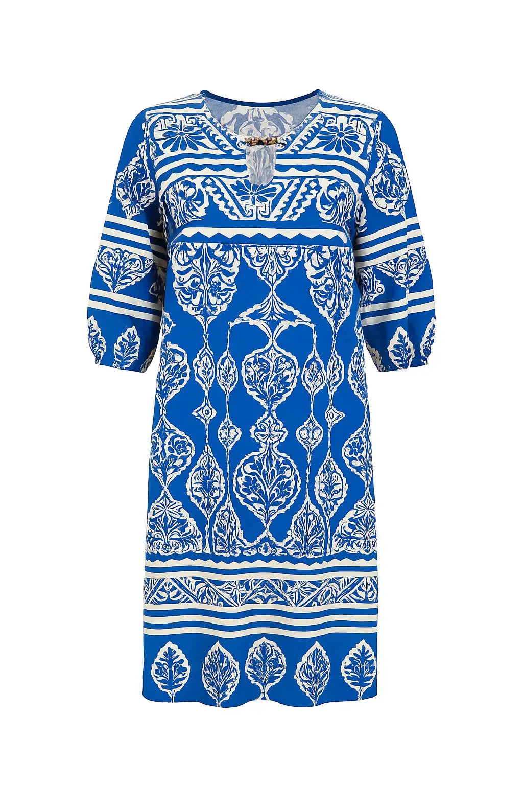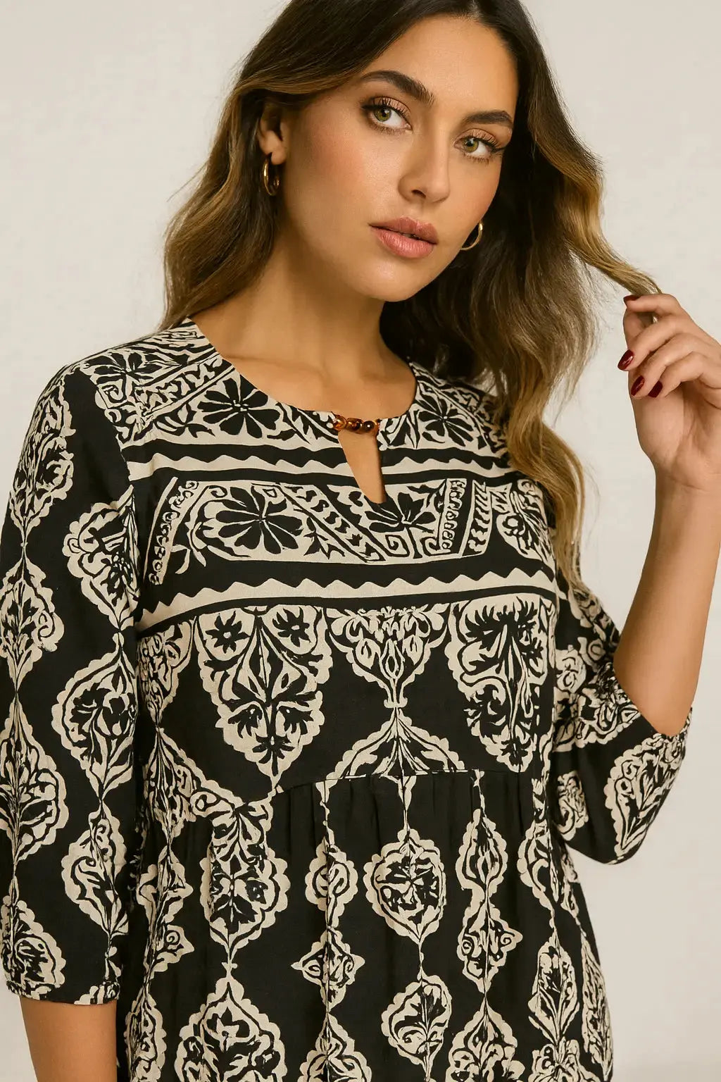 Scopri l’eleganza senza tempo di questo abito chemisier con stampa etnica in bianco e nero, perfetto per aggiungere un tocco sofisticato e originale al tuo guardaroba. Il modello presenta una vestibilità comoda e fluida, con una gonna leggermente arricciata che cade morbida lungo la figura. Il dettaglio del collo a contrasto in tessuto bianco, arricchito da una piccola scollatura a goccia e bottoncini effetto perla, dona al capo un accento raffinato. Le maniche corte con leggero arricciamento al fondo aggiungono volume e femminilità. Ideale da abbinare sia con sandali bassi che con sneakers per un look day-to-night.