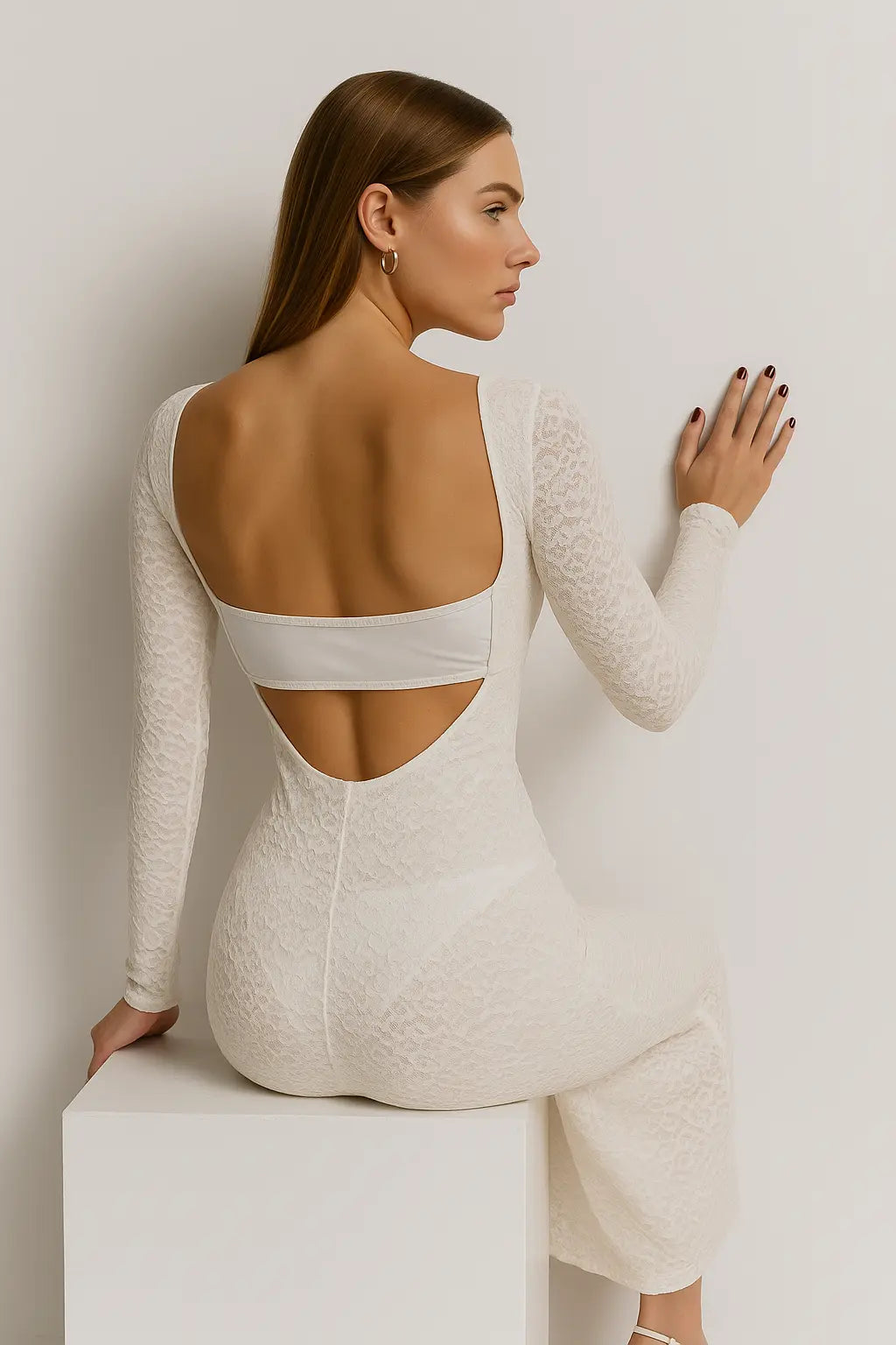 Composizione outfit: Set coordinato composto da abito lungo in pizzo e bikini due pezzi