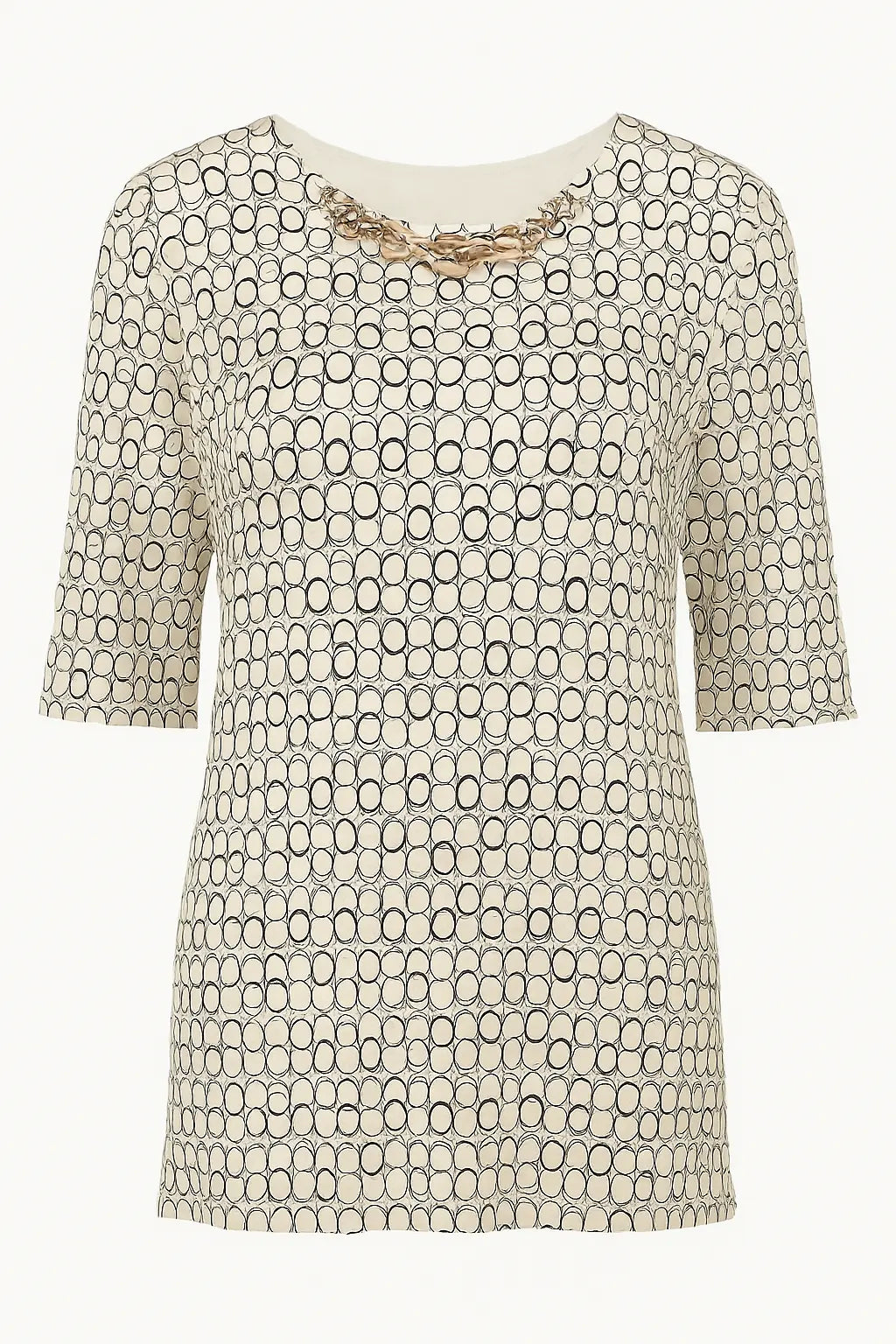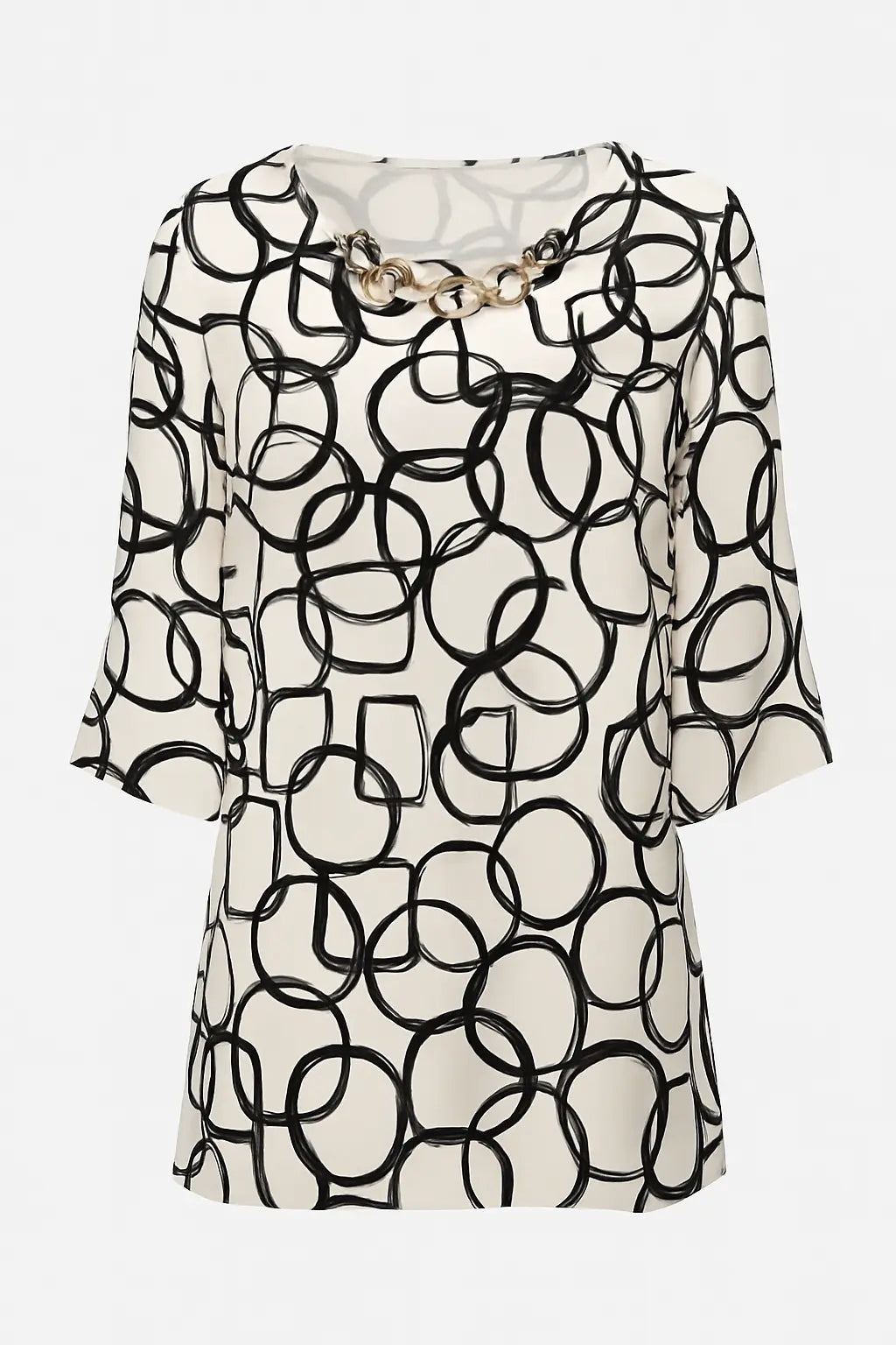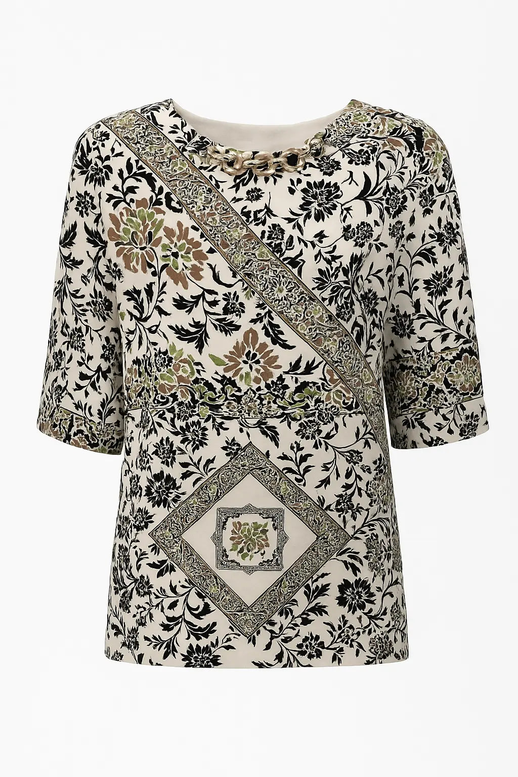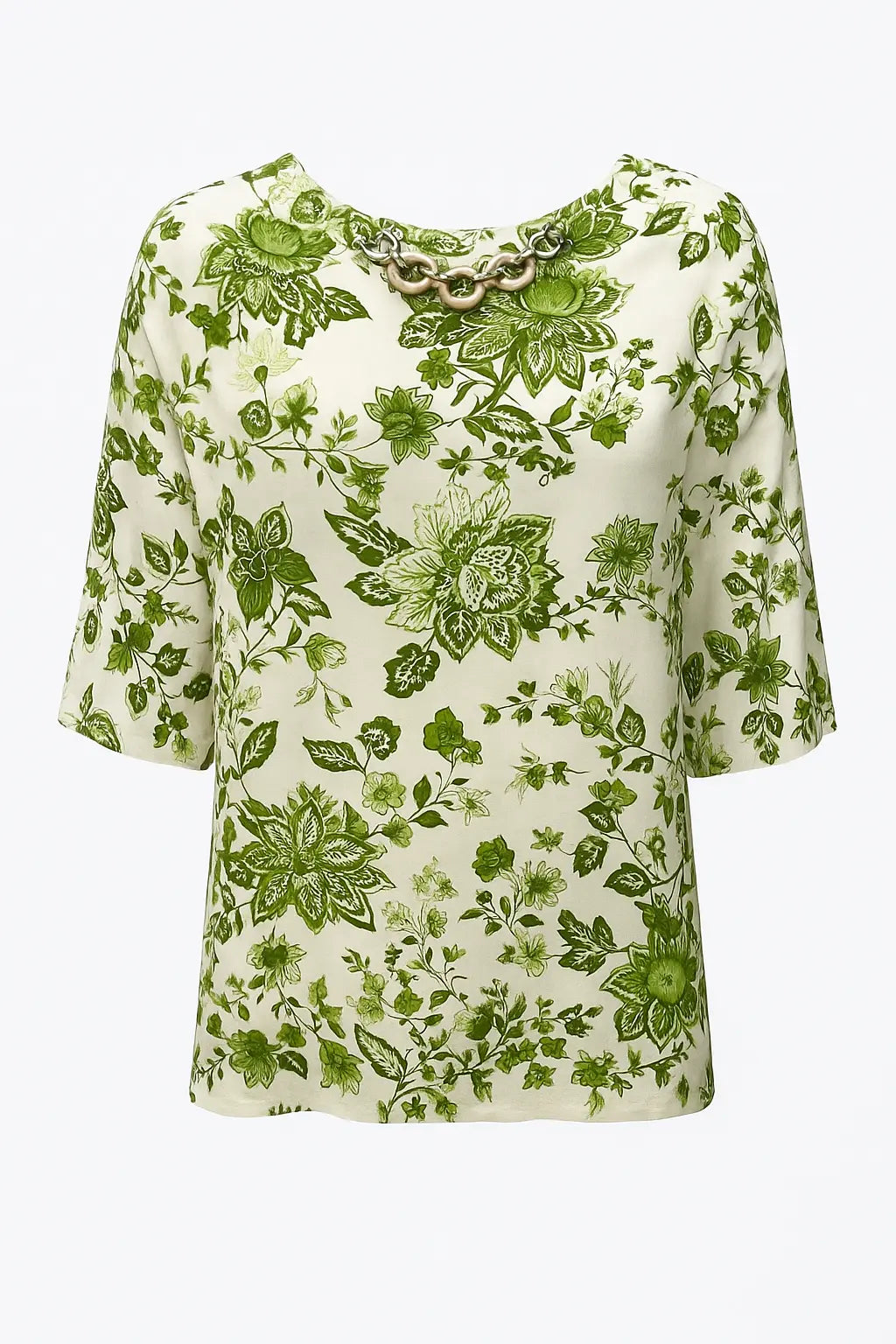 Eleganza e stile si intrecciano in questa blusa in viscosa fluida stampata. Il design è raffinato, cosi come le stampe proposte per questo modello. Il fit viene impreziosito da un dettaglio gioiello in catena smaltata e dorata sullo scollo. Il taglio morbido, unito alla manica ampia e al tessuto leggero, rende questo capo ideale per un look ricercato ma comodo. Perfetta da abbinare a pantaloni palazzo, jeans bianchi o gonne midi per uno stile elegante e contemporaneo.