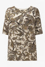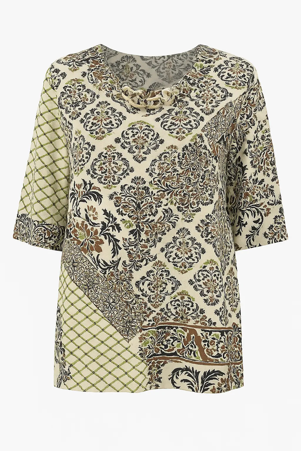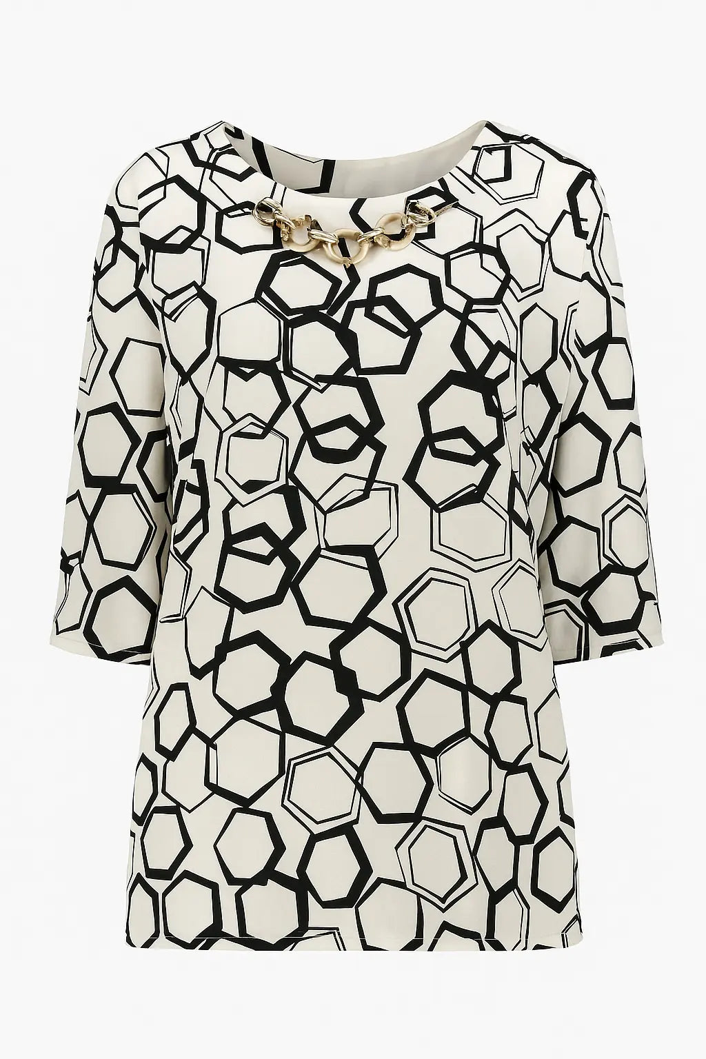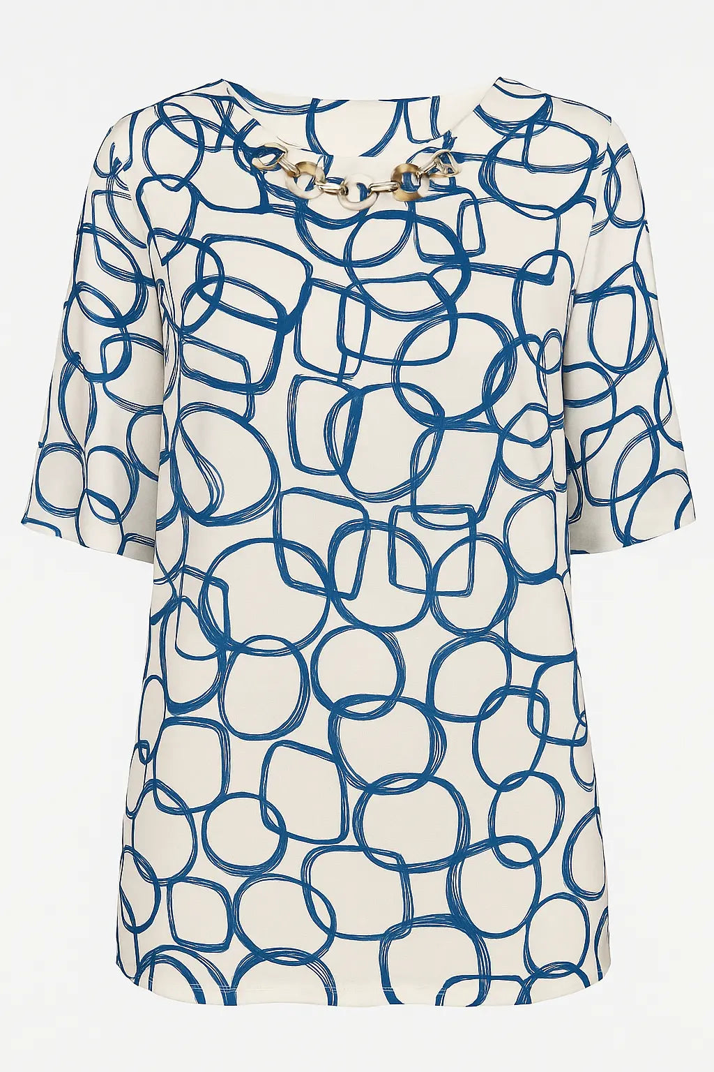 Eleganza e stile si intrecciano in questa blusa in viscosa fluida stampata. Il design è raffinato, cosi come le stampe proposte per questo modello. Il fit viene impreziosito da un dettaglio gioiello in catena smaltata e dorata sullo scollo. Il taglio morbido, unito alla manica ampia e al tessuto leggero, rende questo capo ideale per un look ricercato ma comodo. Perfetta da abbinare a pantaloni palazzo, jeans bianchi o gonne midi per uno stile elegante e contemporaneo.