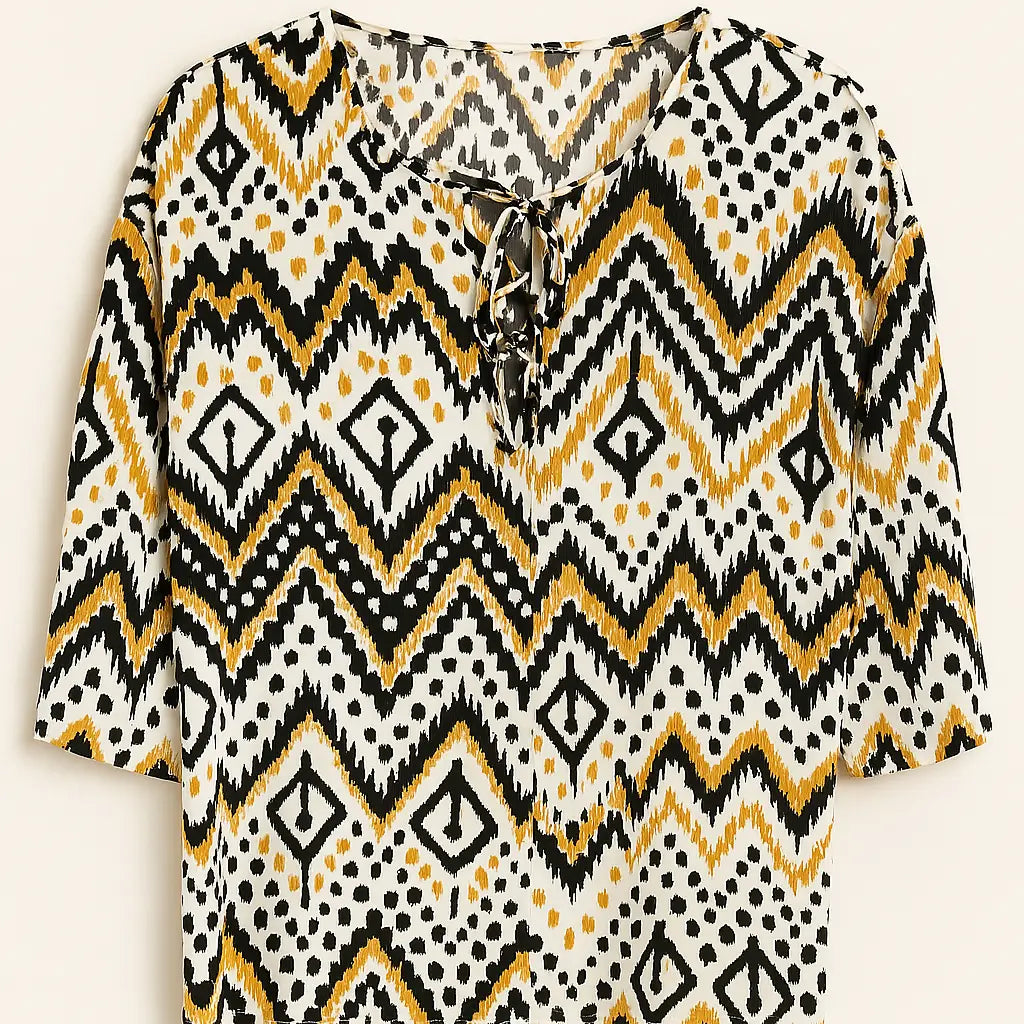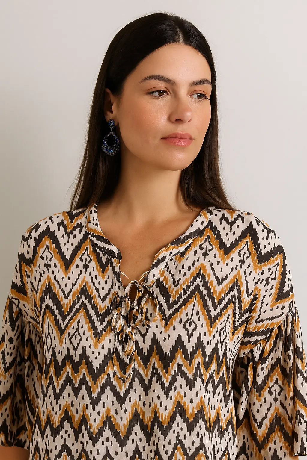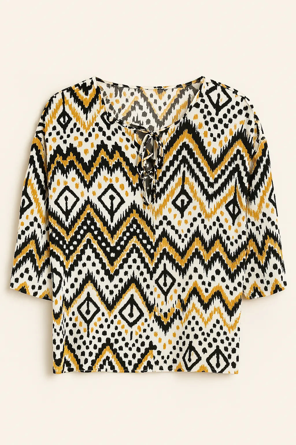 La blusa con laccetti in fantasia etno è perfetta per chi cerca uno stile ricercato e un mood estivo quotidiano. Grazie alla fantasia etnica all over e al tessuto in viscosa, ti sentirai sempre fresca e alla moda. Aggiungi un tocco etnico al tuo guardaroba e sfoggia un look unico e raffinato.