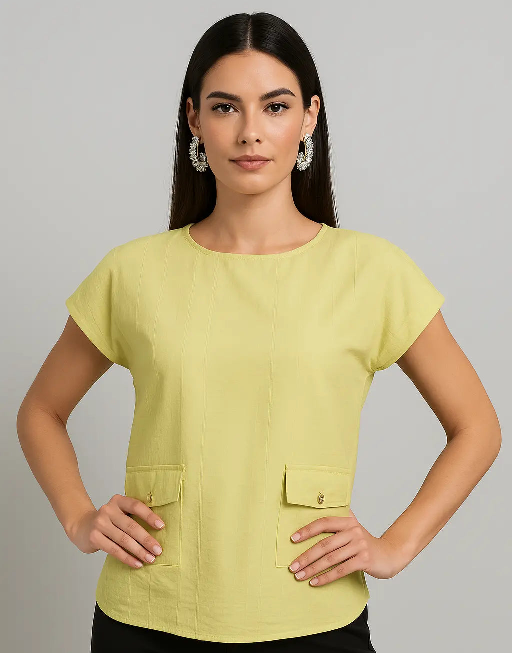 Questa blusa girocollo realizzata in viscosa è perfetta per un look quotidiano. Le tasche frontali aggiungono comodità e stile, mentre la viscosa garantisce freschezza e traspirabilità. Ideale per il lavoro o il tempo libero.