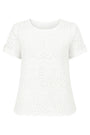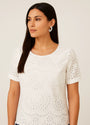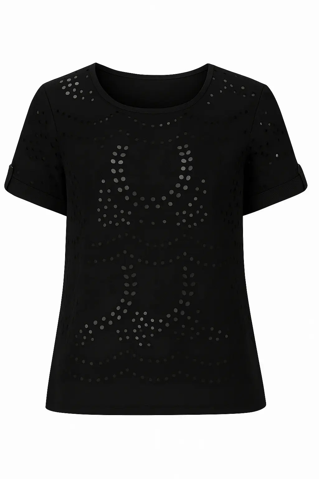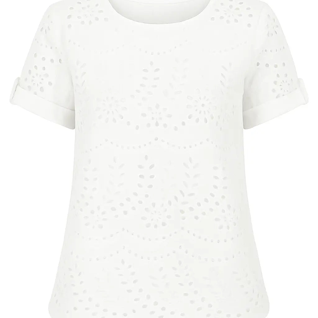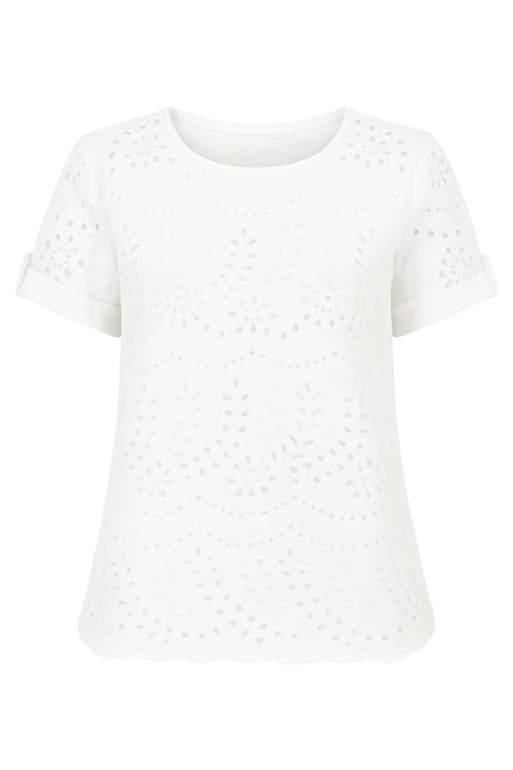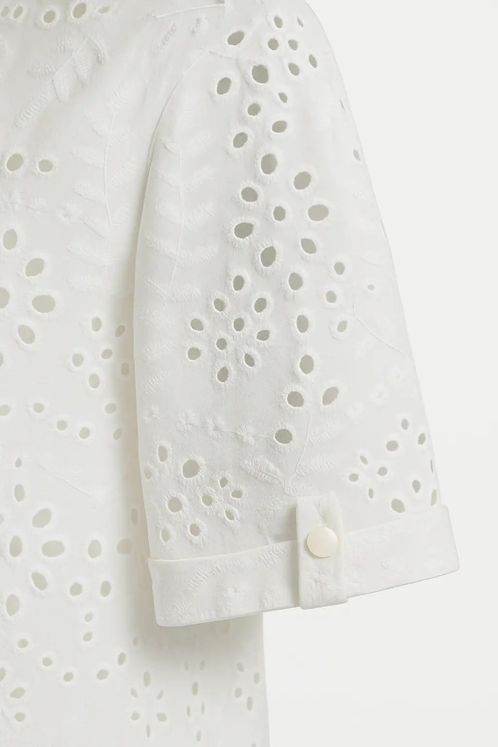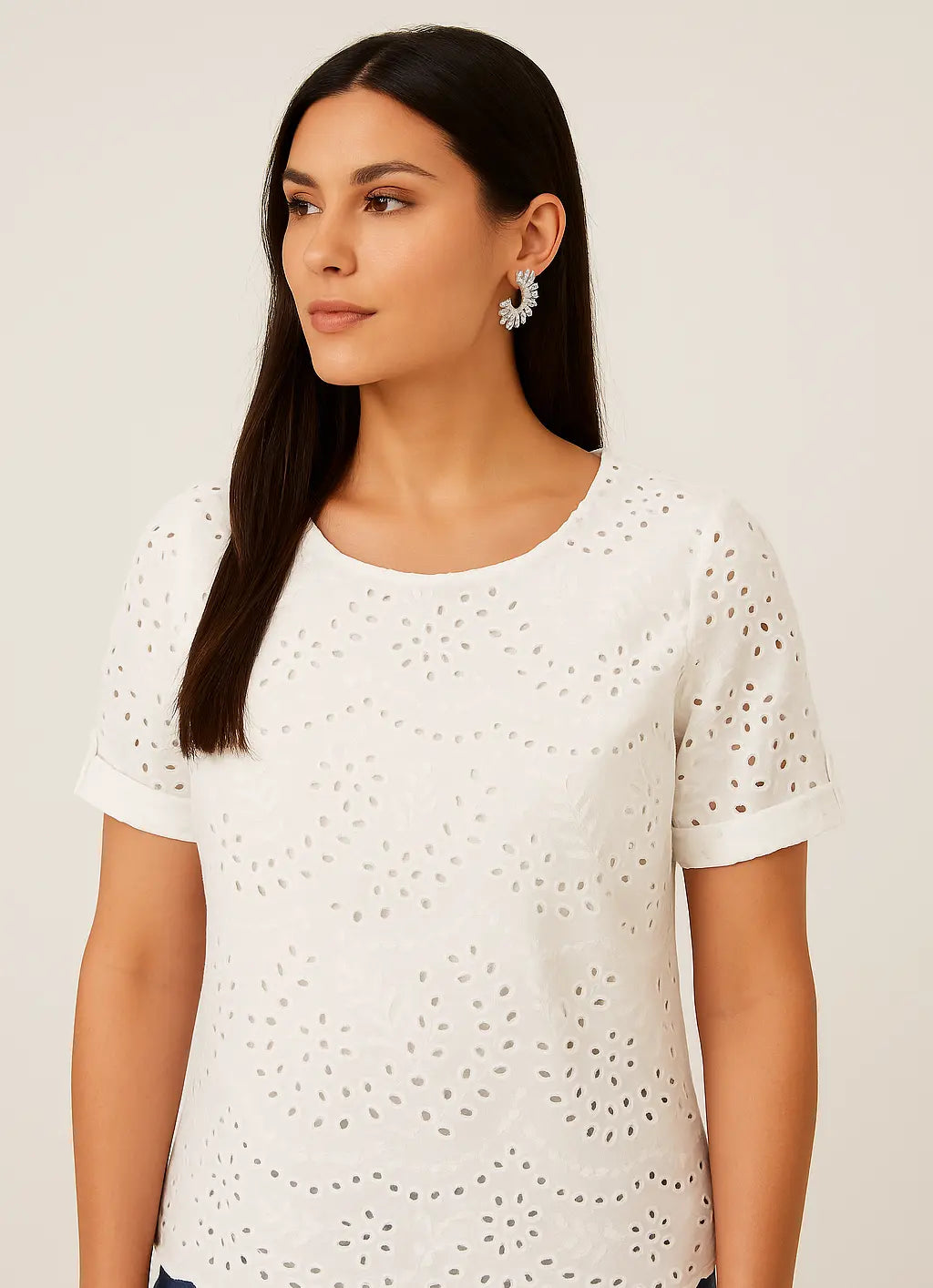 Raffinata e femminile, questa blusa in 100% cotone sangallo coniuga freschezza e stile con un tocco romantico. Il tessuto traforato ricamato valorizza il look grazie ai motivi floreali e geometrici che decorano l'intero capo. Le maniche corte sono rifinite da un risvolto con bottone e passante, per un dettaglio curato e pratico. Un capo ideale da indossare con pantaloni ampi o jeans per un outfit quotidiano elegante e disinvolto.