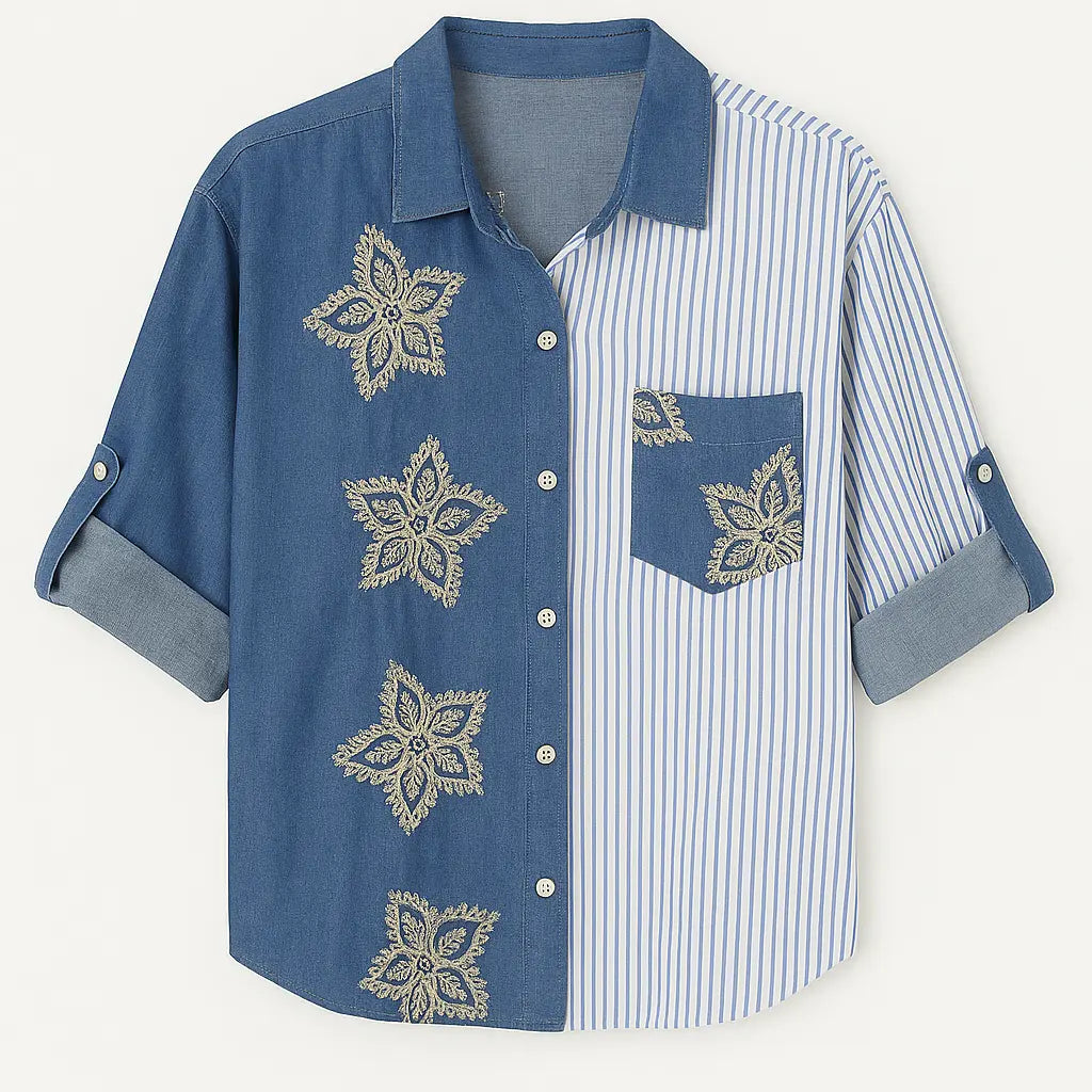 Camicia con inserti in chambray ricamati e popeline a righe