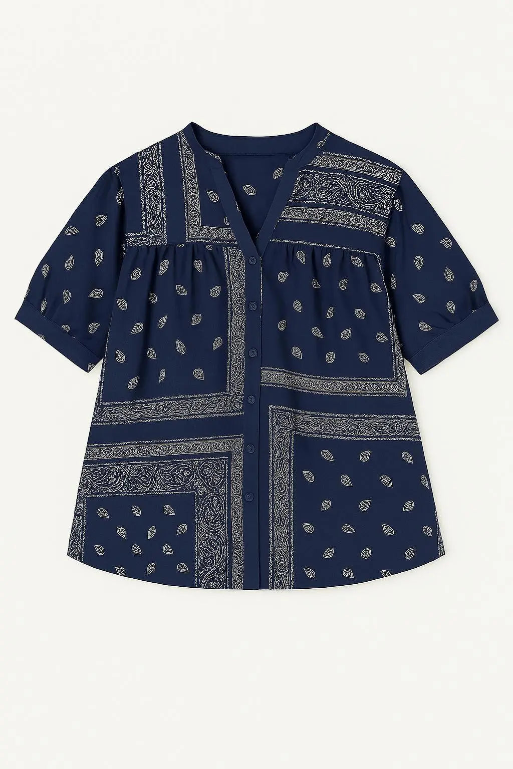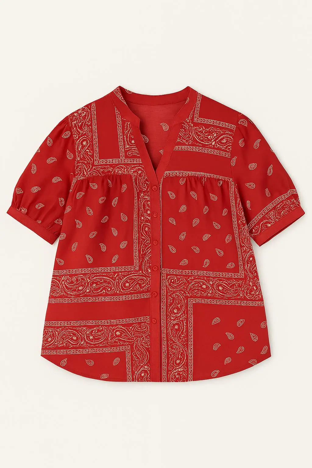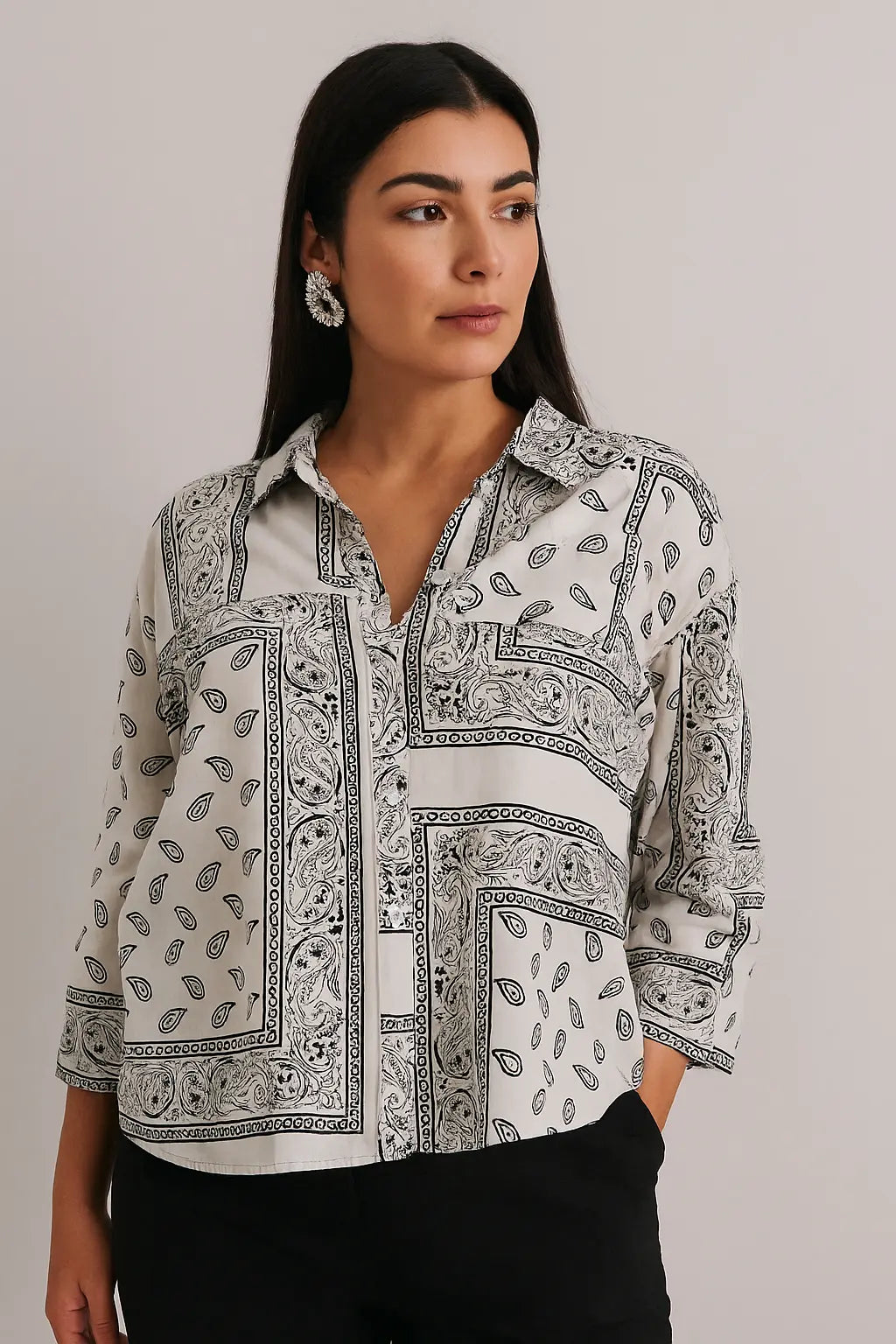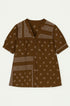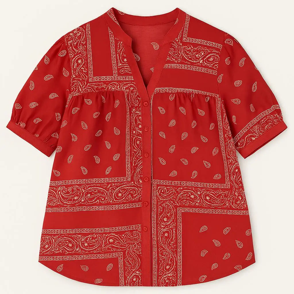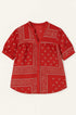 La camicia con maniche ampie e fantasia bandiera è comoda e chic, perfetta da abbinare a pantaloni coordinati o a pants a tinta unita. La stampa bandana segue le ultime tendenze di moda, rendendo questo capo un must-have per ogni guardaroba.