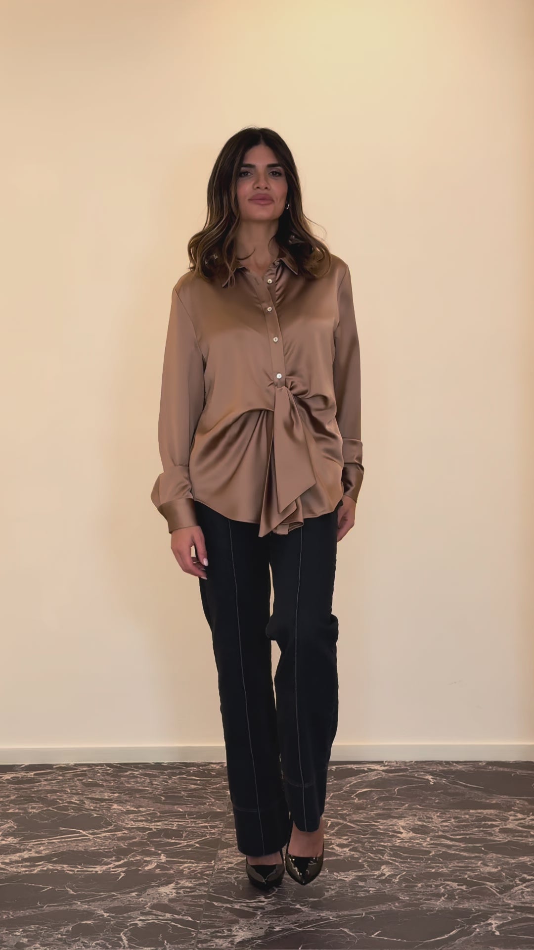 Una camicia in raso che conquista al primo sguardo: luminosa, morbida e super chic. Il dettaglio del nodo frontale crea un drappeggio raffinato che valorizza la figura e trasforma un capo classico in un pezzo davvero speciale. Perfetta per look da ufficio, serate e occasioni eleganti. ✨🤎💼