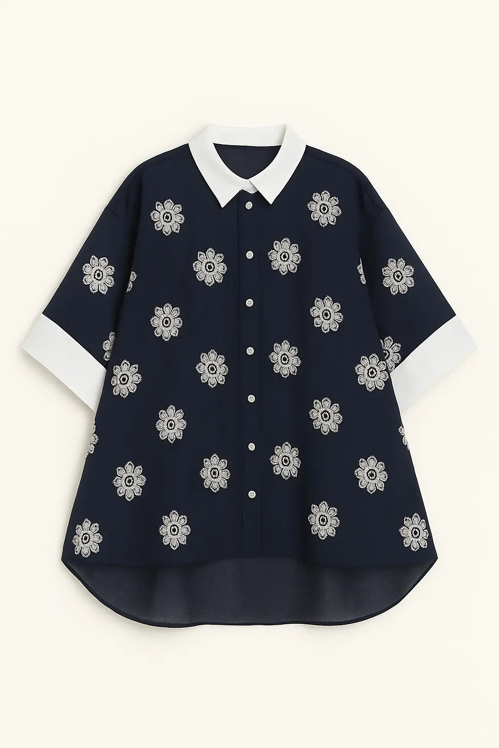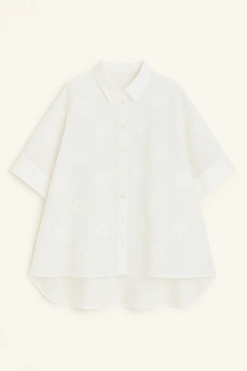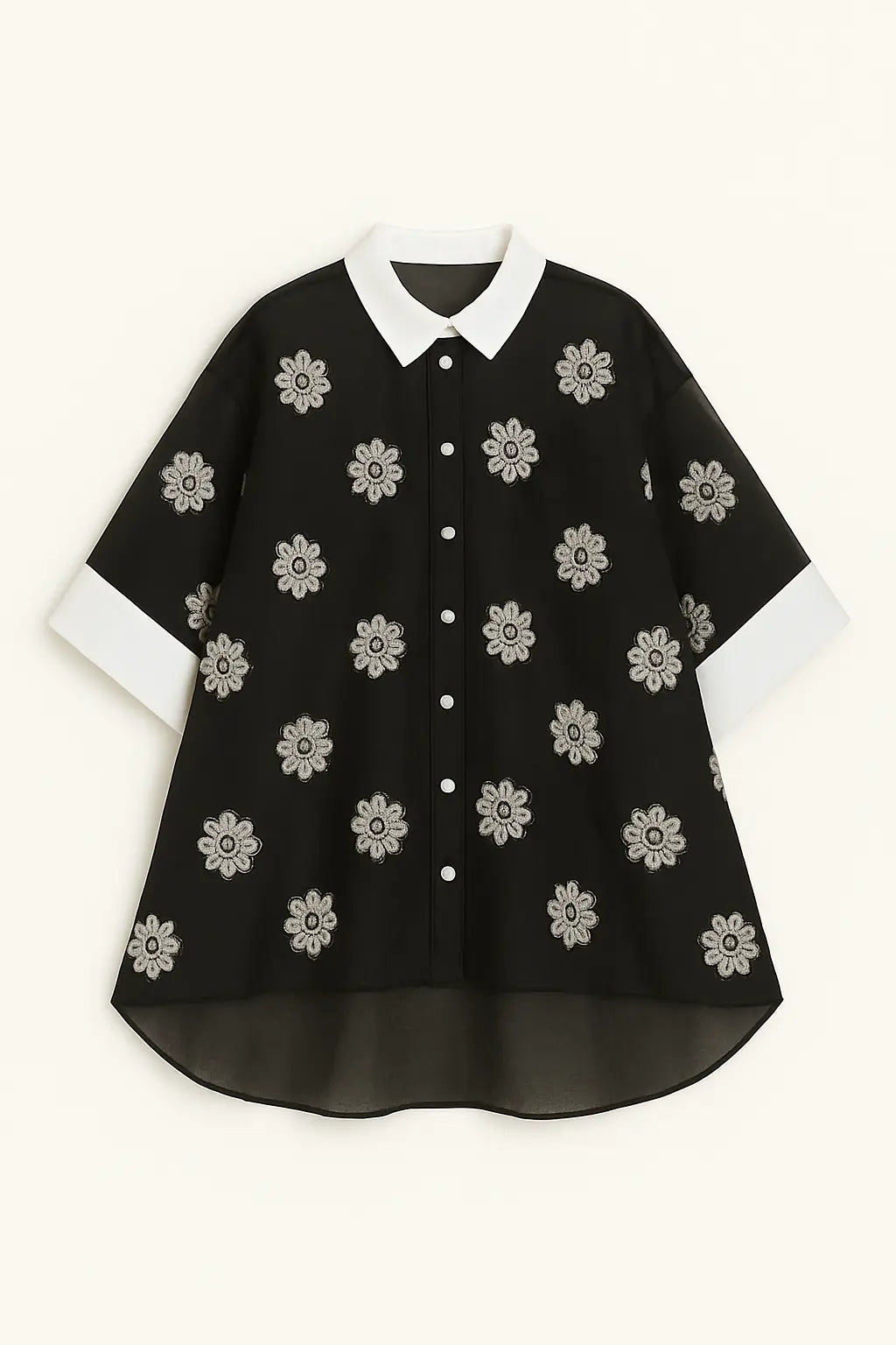 Camicia oversize in organza con motivo floreale ricamato a contrasto. Il design è ispirato alla vestibilità ampia e fluida dei kimono, con maniche larghe al gomito e taglio svasato che conferisce leggerezza e movimento. Il colletto bianco a punta e i polsi coordinati aggiungono un tocco di eleganza grafica, mentre il tessuto semi-trasparente valorizza la texture e i ricami del capo. Ideale per look sofisticati ma originali, da indossare sia aperta che abbottonata.