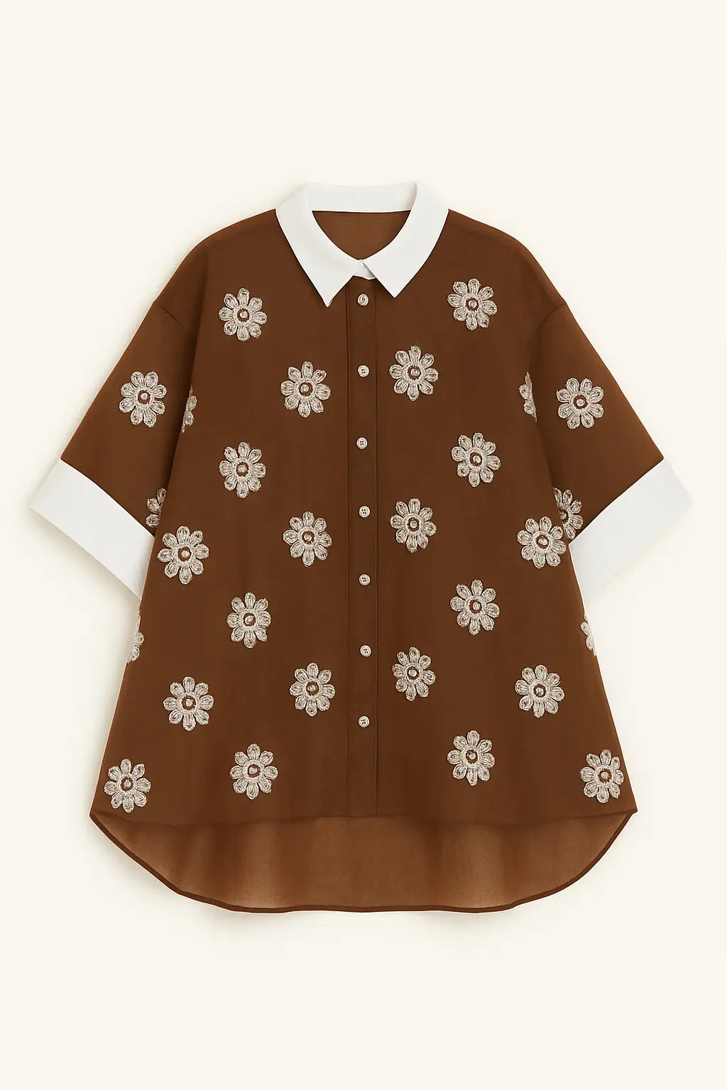 Camicia oversize organza con ricami e polsi e colletto a contrasto