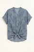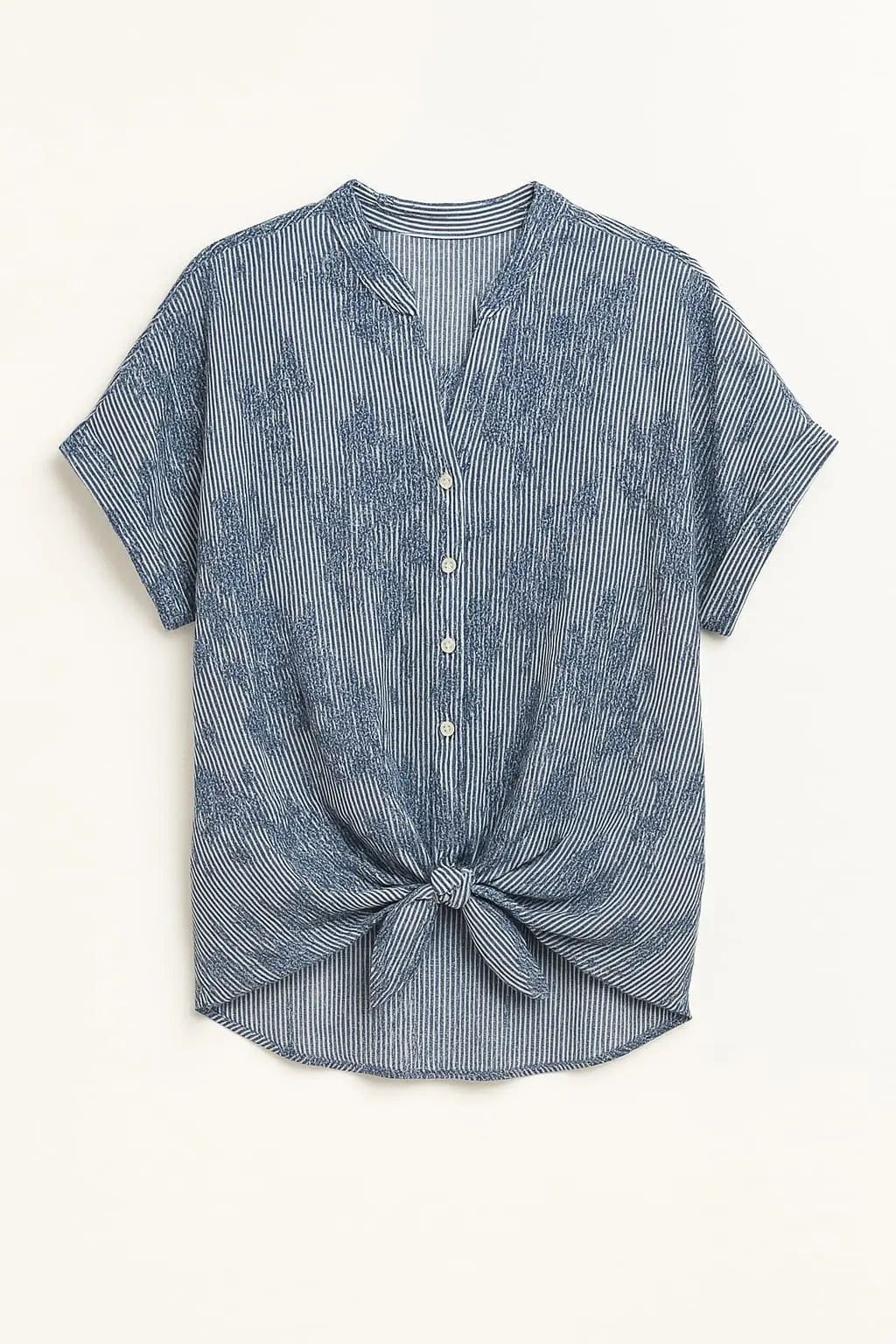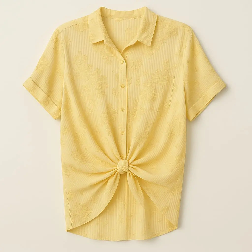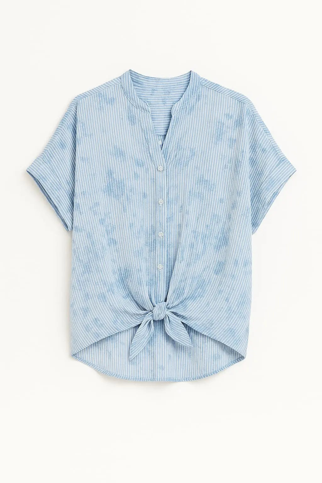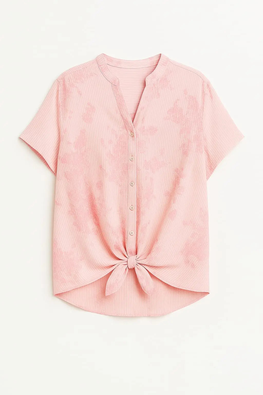 Camicia in tessuto leggero con lavorazione a coste sottili e delicato ricamo floreale in tono su tono. Le nuance nitide e pastellate donano al capo un aspetto solare e sofisticato, ideale per la stagione primaverile ed estiva. Il taglio morbido con abbottonatura e nodo centrale sul fondo, creano una silhouette fluida e femminile, perfetta da abbinare sia con pantaloni che con gonne.