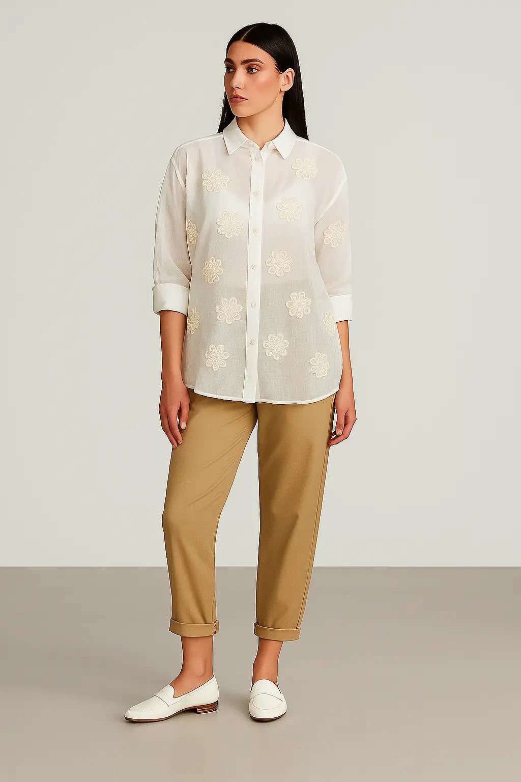 Camicia oversize organza con ricami e polsi e colletto a contrasto