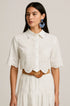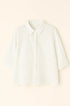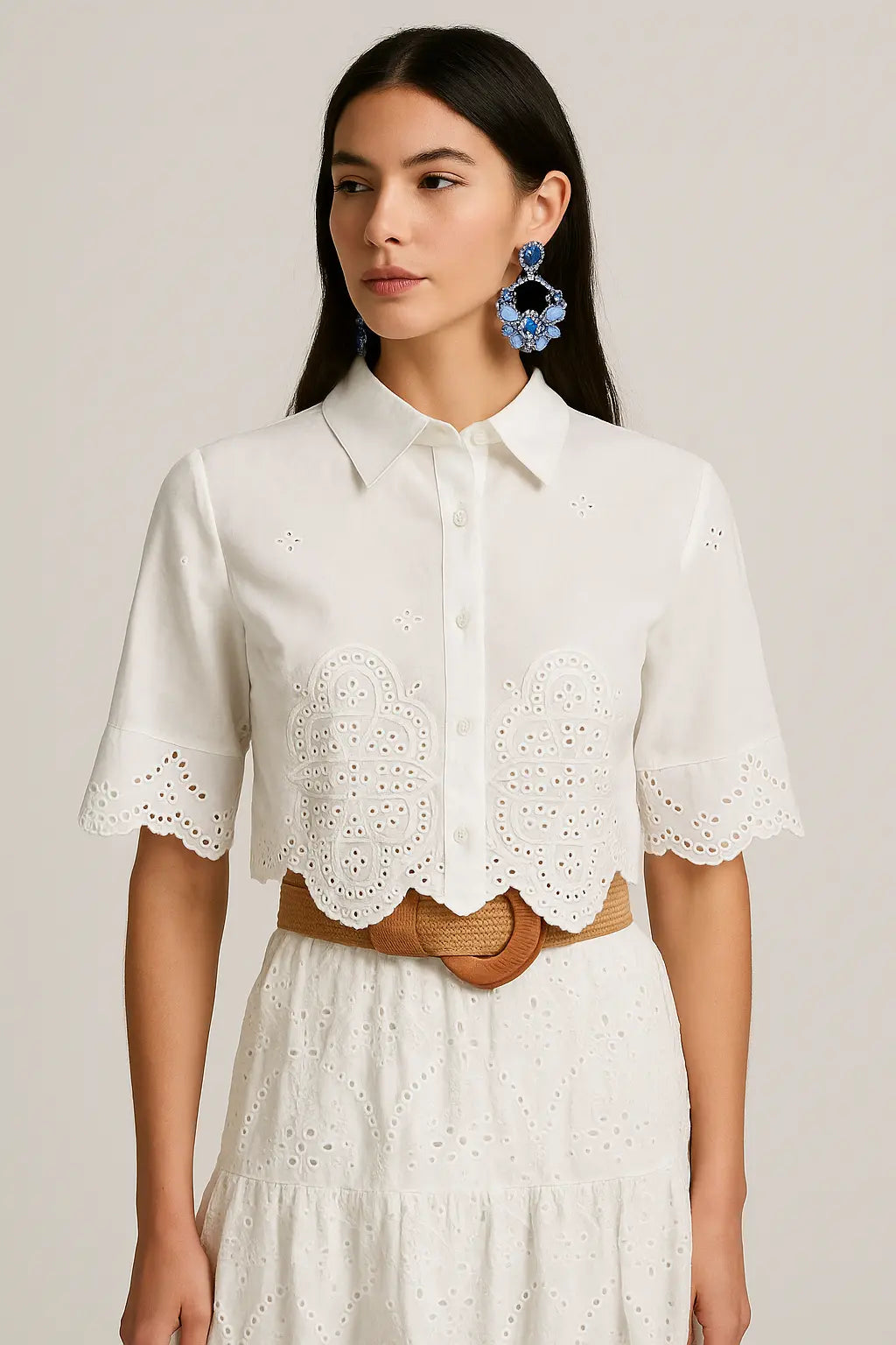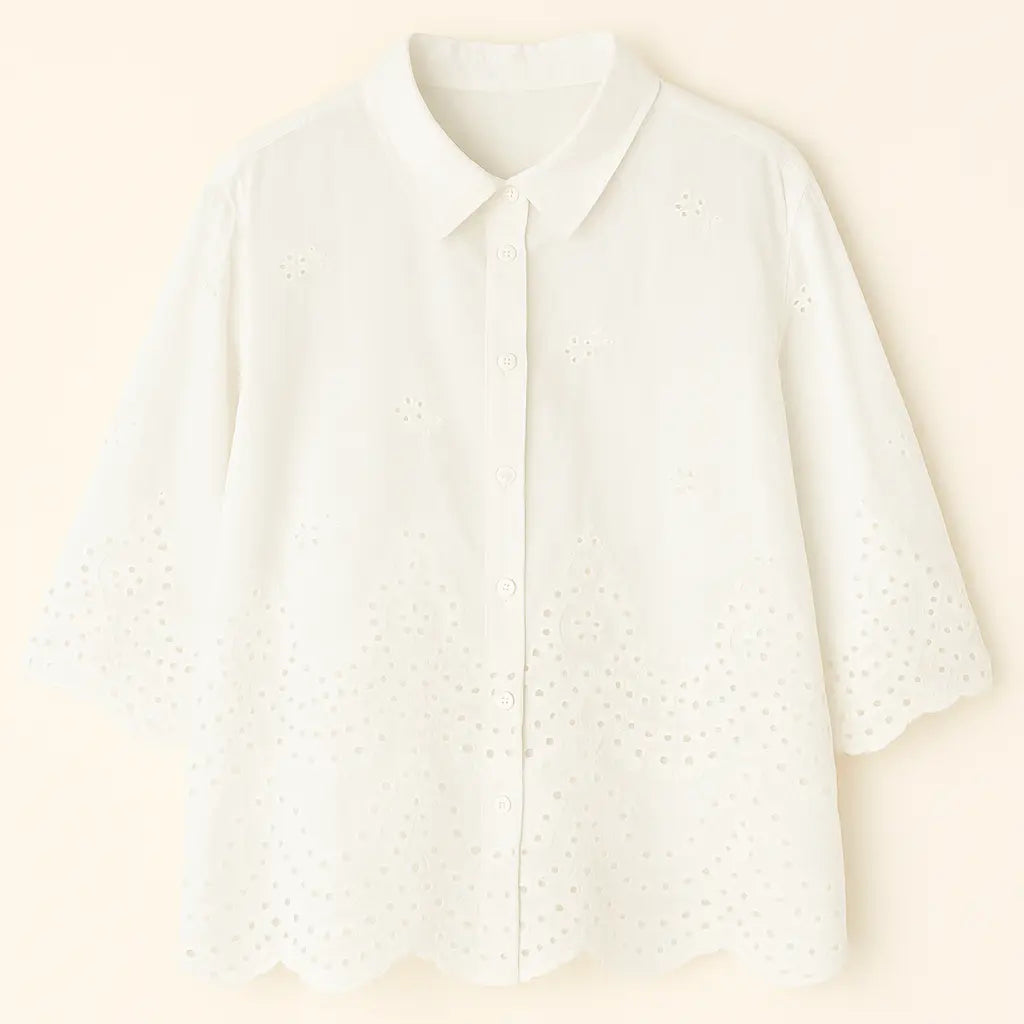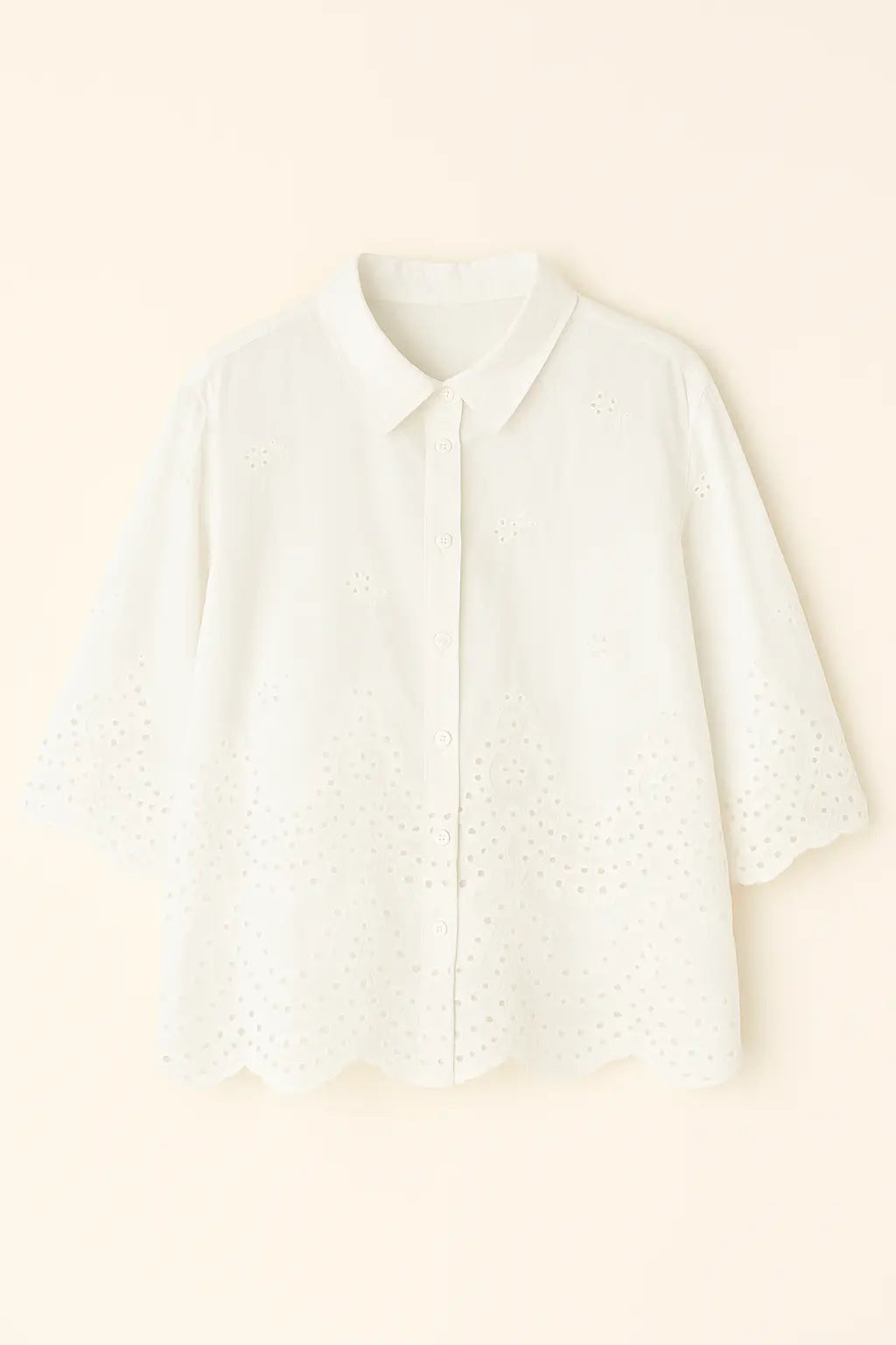 Camicia in 100% cotone leggero, chiusura frontale con bottoni tono su tono. con dettagli in ricamo sangallo su fondo e maniche. Il taglio è morbido e svasato, con maniche 3/4 e colletto classico a punta. La parte inferiore presenta una finitura a bordo smerlato, riccamente lavorato. Perfetta da indossare con jeans, gonne ampie o pantaloni a vita alta per un look fresco e femminile.