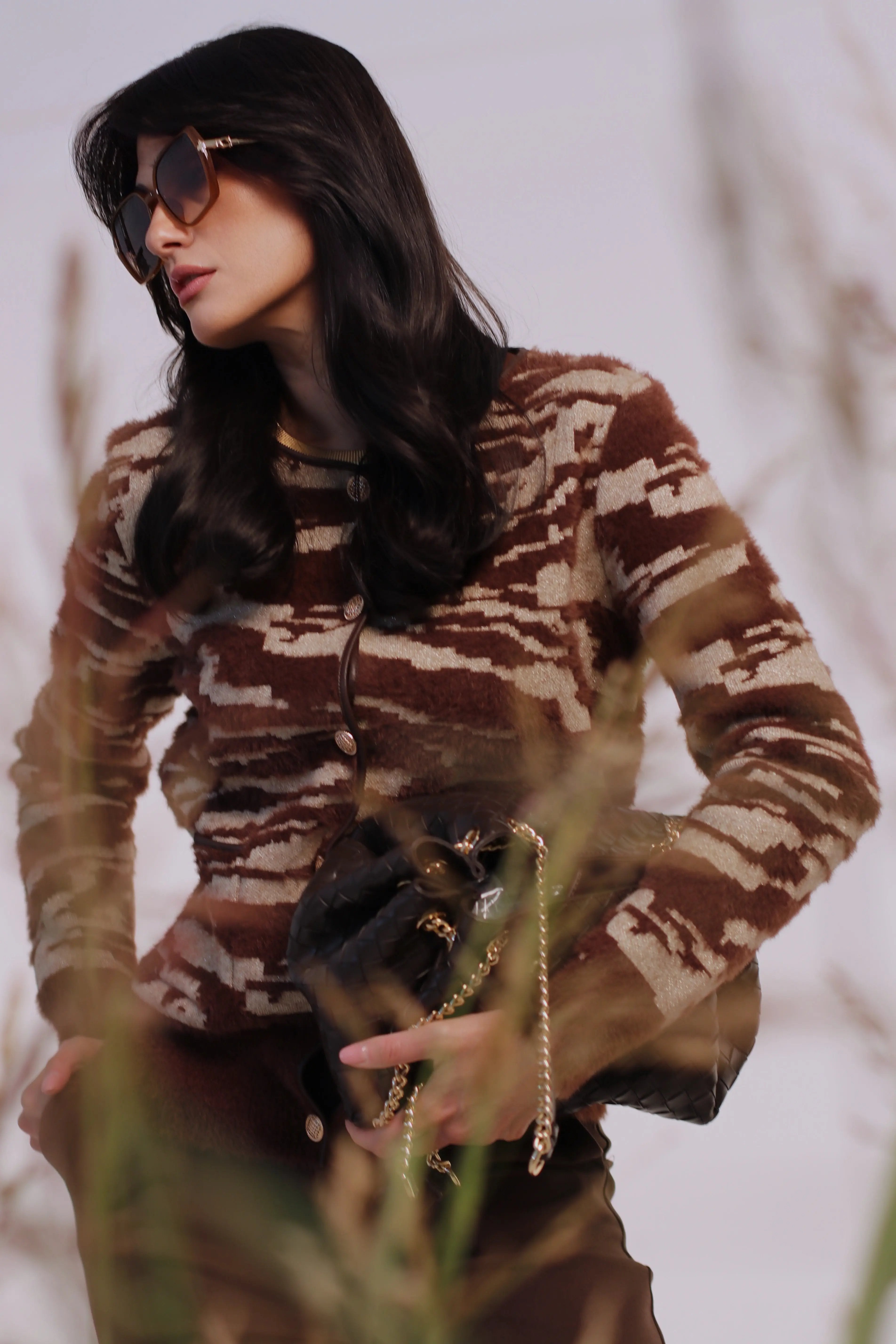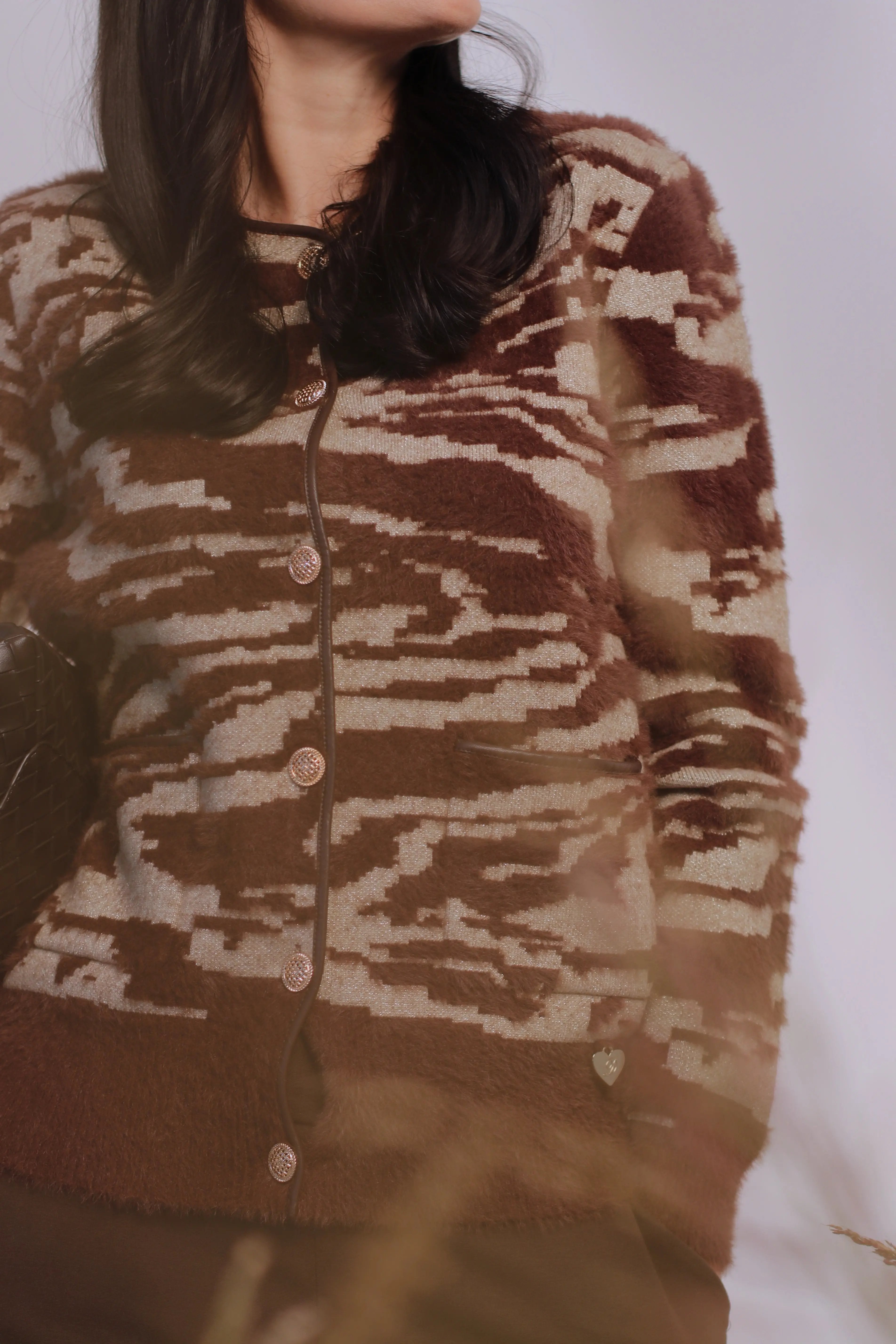 Un cardigan elegante e grintoso, perfetto per dare carattere ai tuoi outfit quotidiani. Realizzato in maglia morbida e calda, è impreziosito da bottoni gioiello e rifinito con dettagli in ecopelle che lo rendono un capo raffinato e contemporaneo.