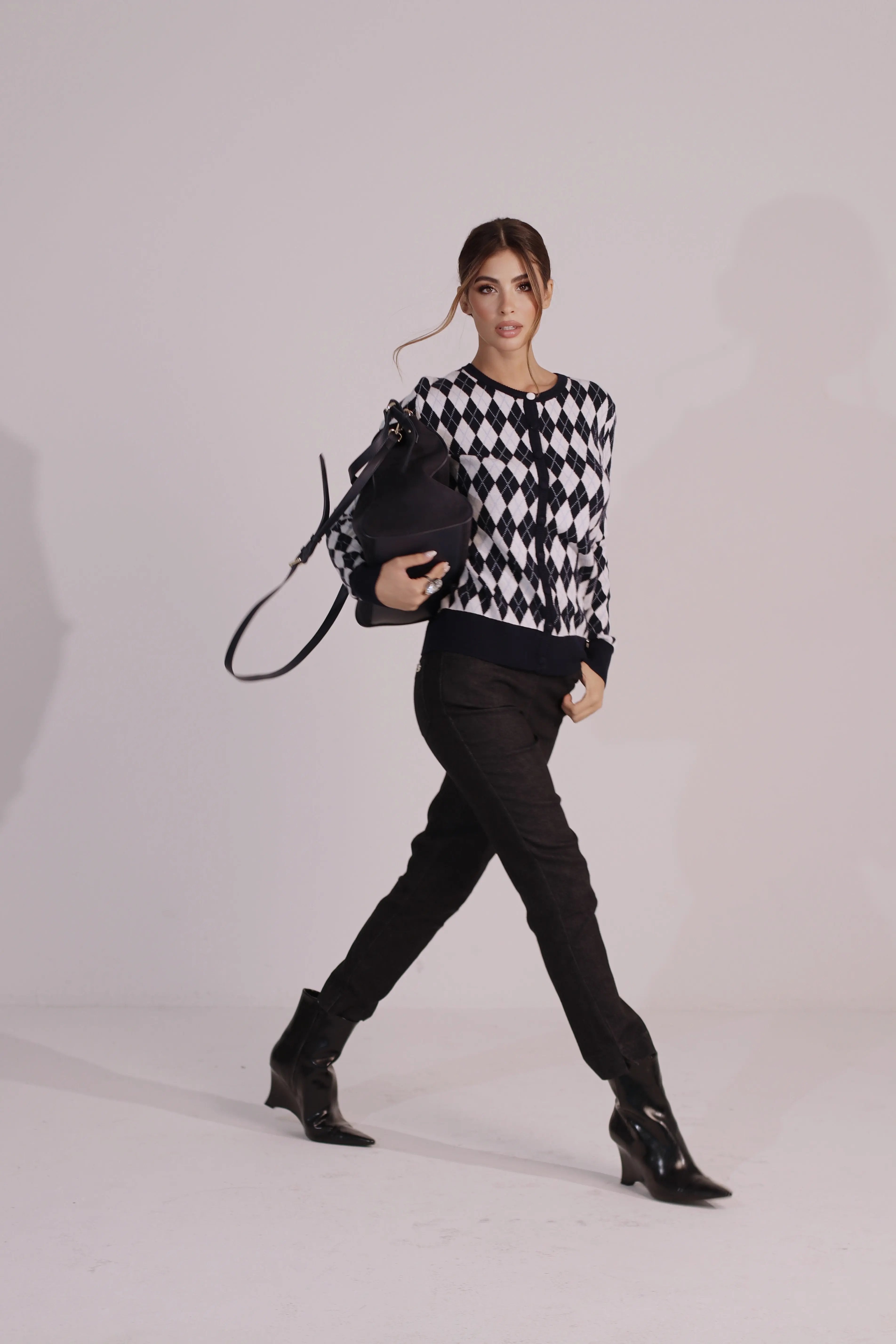 Un cardigan dal fascino senza tempo che abbina il classico motivo a rombi (argyle) a una vestibilità moderna e confortevole. Perfetto per look casual chic o per completare outfit più eleganti con un tocco preppy.