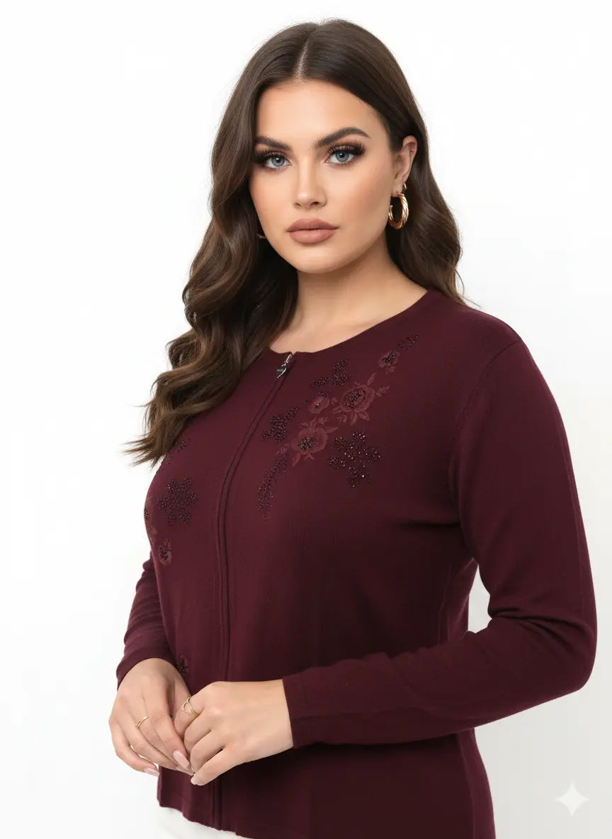 Un cardigan raffinato e femminile, impreziosito da delicati ricami tono su tono e micro-strass che illuminano il look con discrezione. Morbido, confortevole e super chic: perfetto per ogni età e per ogni occasione.