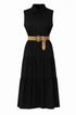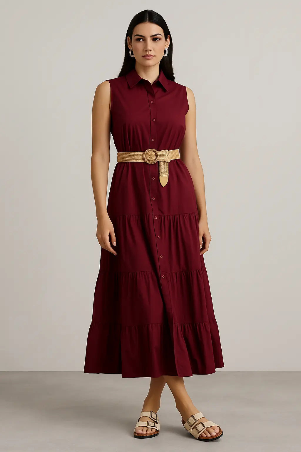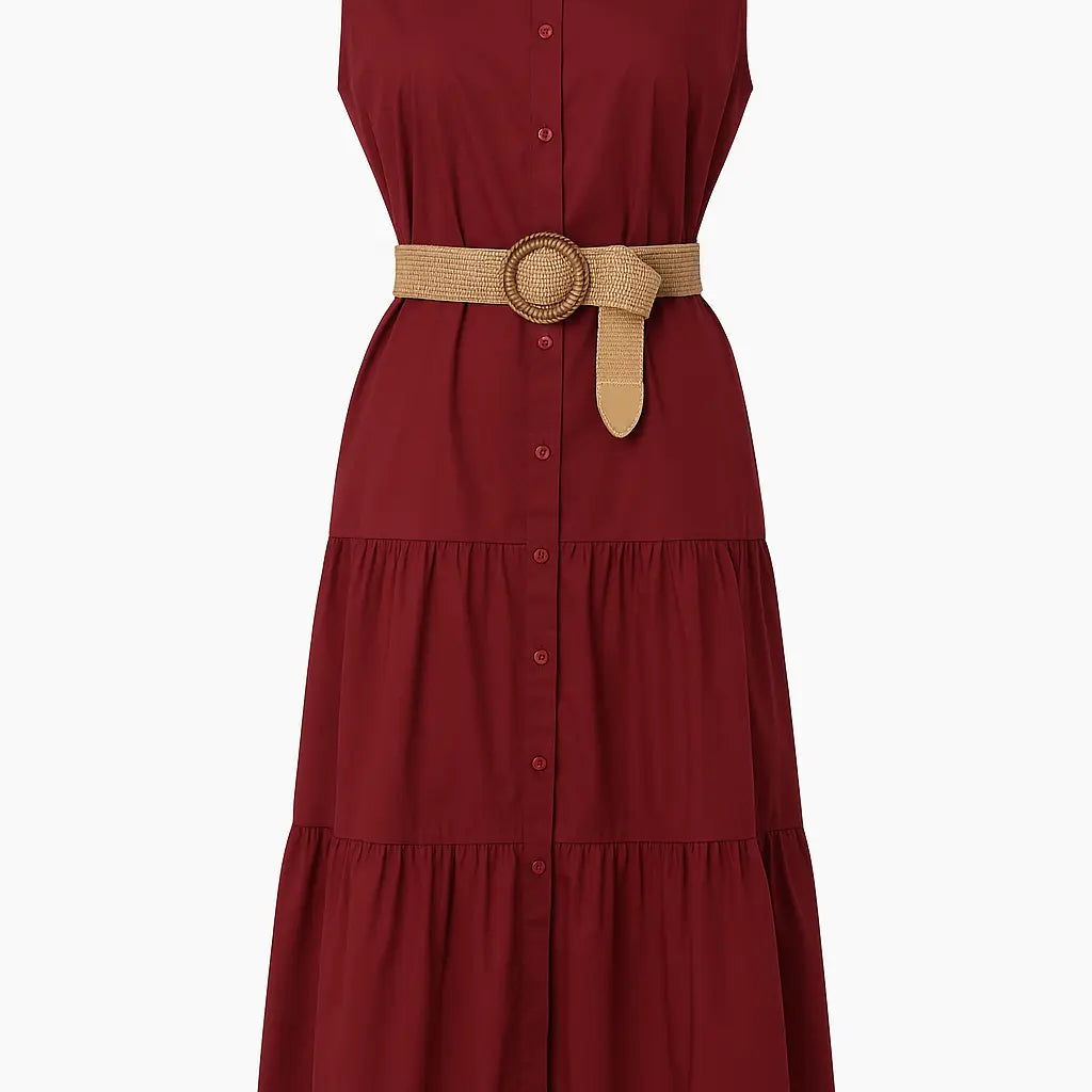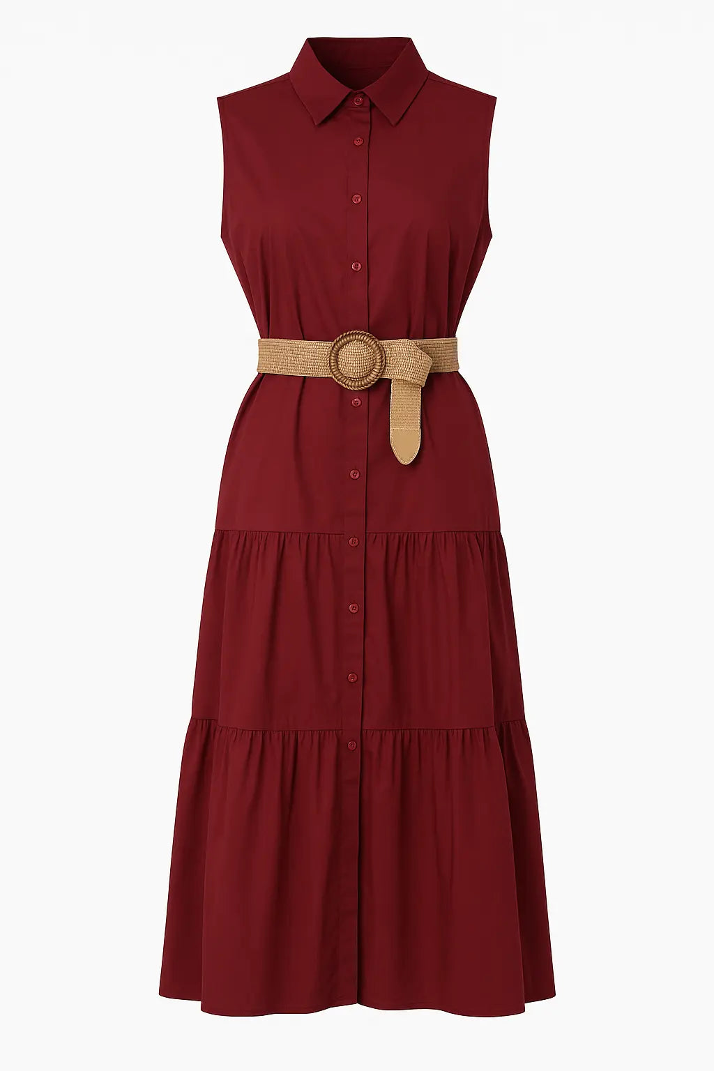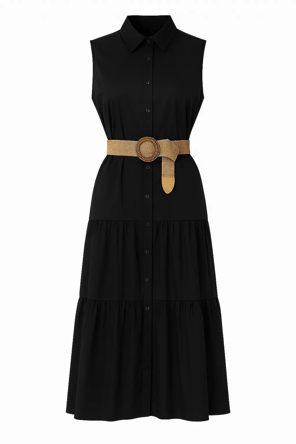 Un capo versatile, fresco e raffinato: questo chemisier lungo senza maniche è la scelta ideale per look estivi casual ma curati. Il design a camicia con abbottonatura frontale si combina con una silhouette ampia e svasata, mentre la cintura in raffia con fibbia decorativa sottolinea delicatamente il punto vita, donando un tocco naturale ed estivo.