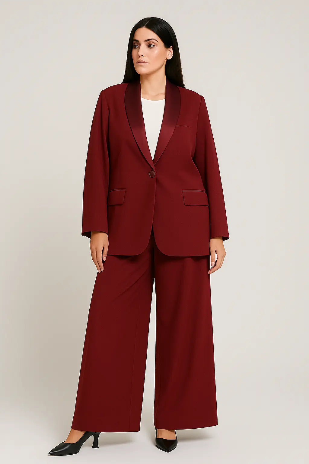 Distinguersi con stile è facile con questo tailleur due pezzi. Composto da una giacca sartoriale con rever sciallato e da pantaloni palazzo ampi, questo completo è l’equilibrio perfetto tra formalità e femminilità. Il tessuto fluido con finitura leggermente satinata dona un tocco sofisticato, ideale per cerimonie, eventi o look da ufficio.