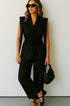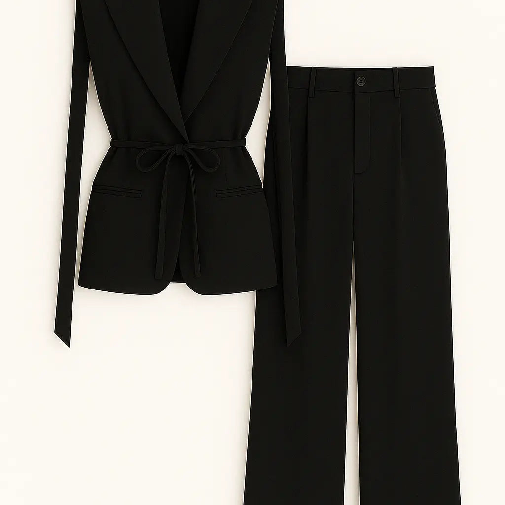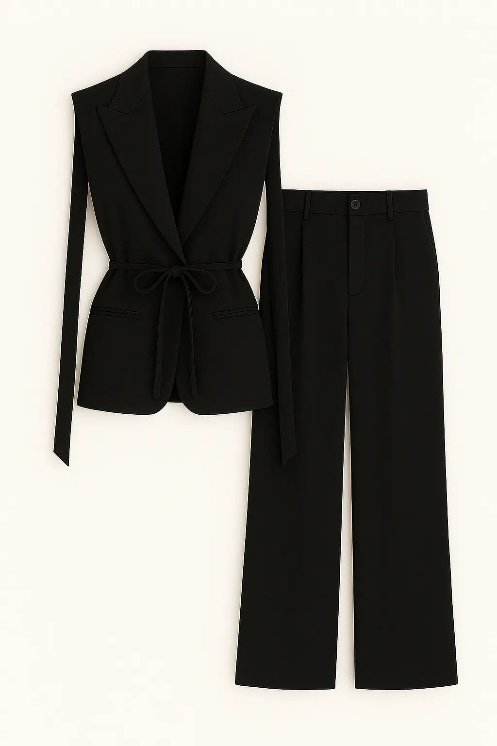 Questo completo ultra trendy è il perfetto mix di eleganza e stile. Le spalline allungate aggiungono un tocco di moda alla giacca con laccetti in vita che simula una cintura. I pantaloni ampi con piccole pinces sotto il bustino sono comodi e chic. Perfetto per l'ufficio, la città o una vacanza.