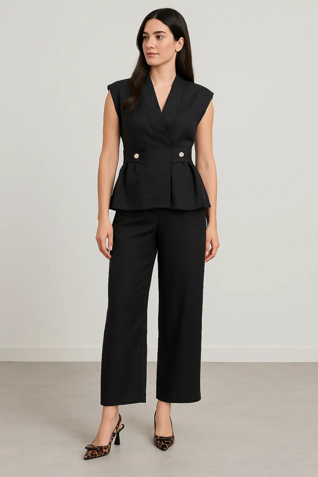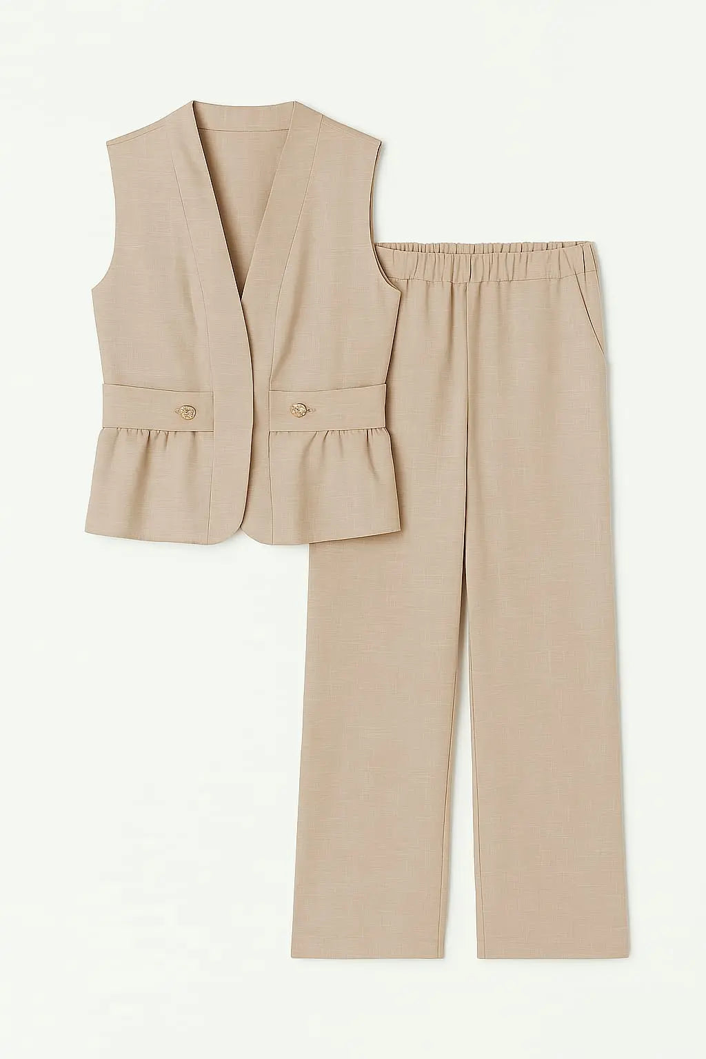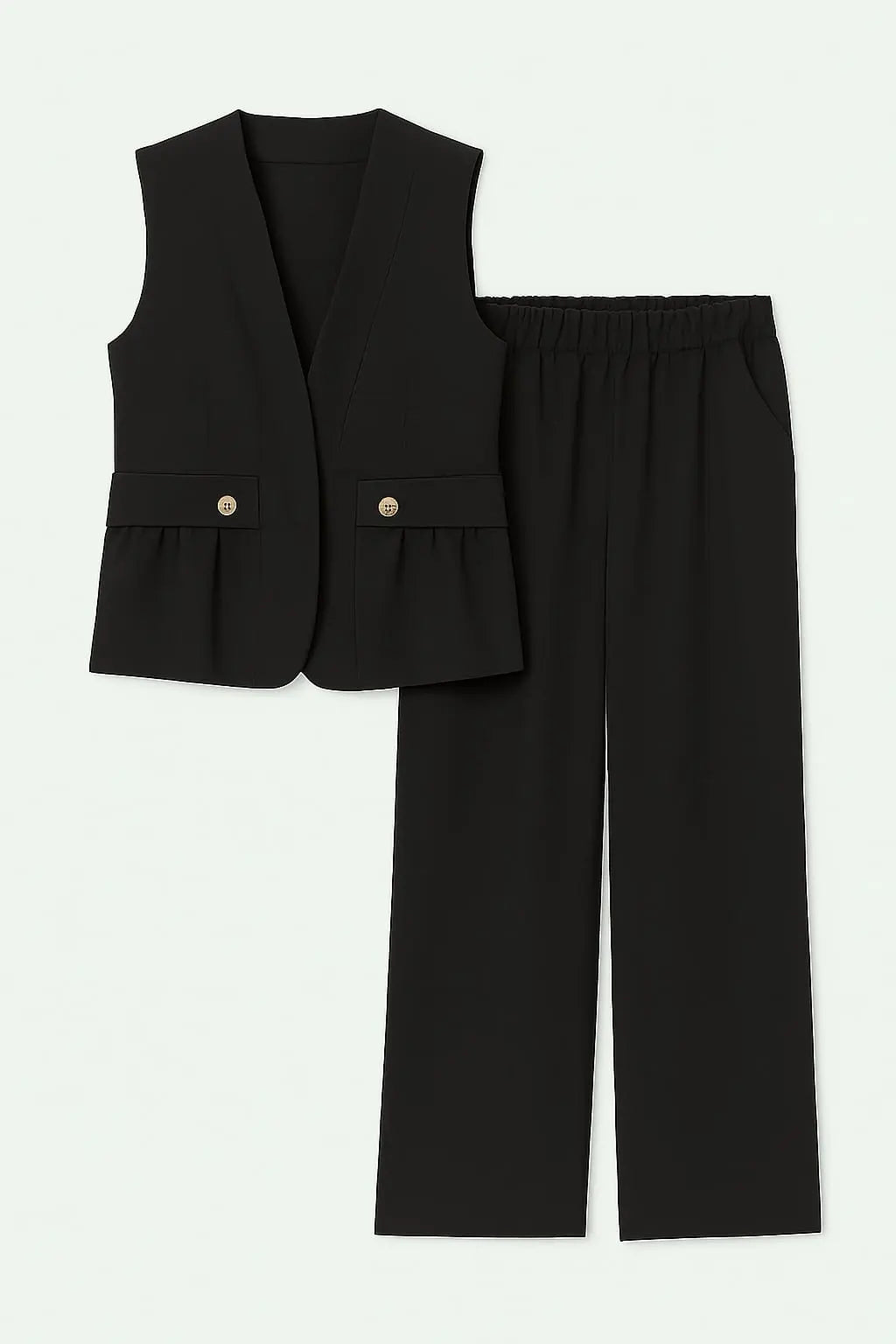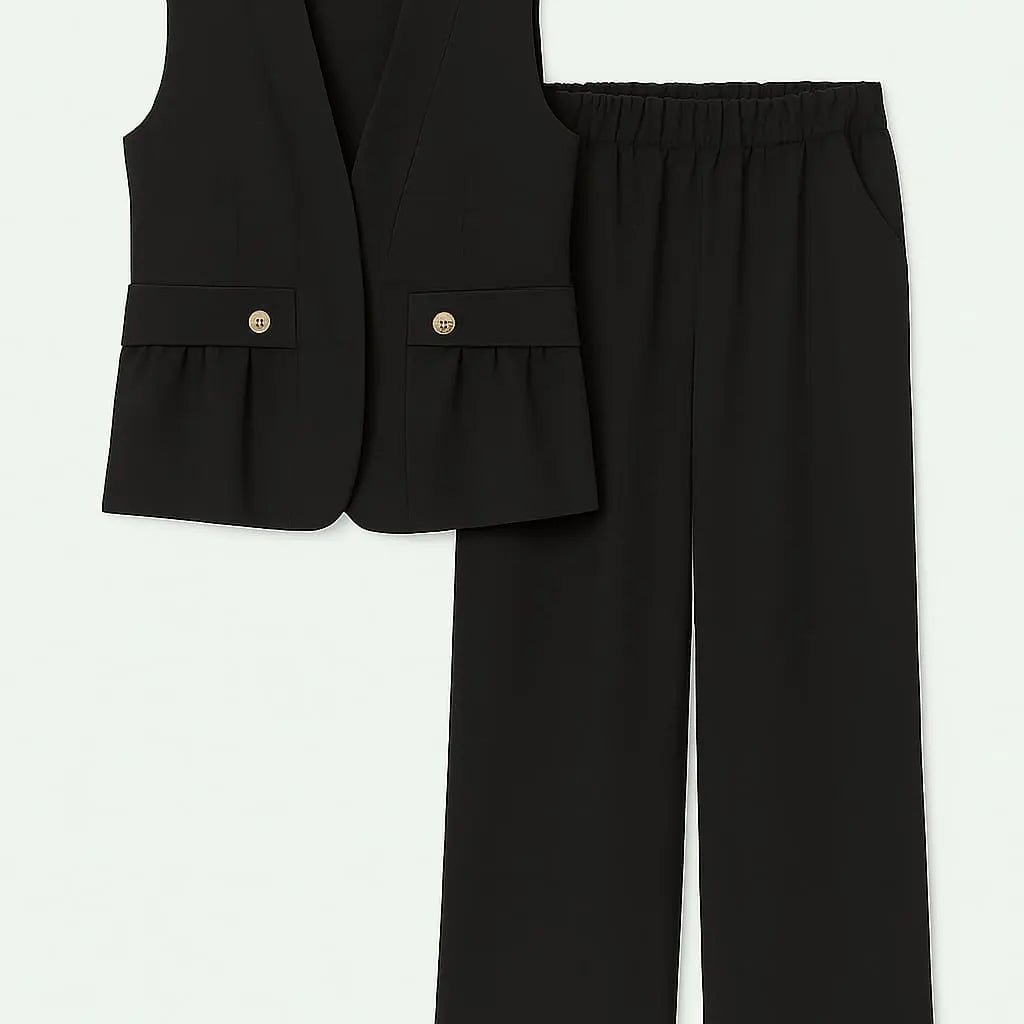 Completo essenziale e versatile composto da gilet lungo sartoriale senza maniche e pantalone ampio con fascia elastica in vita. Il gilet presenta pattine e bottoni decorativi, può essere indossato sia singolarmente che con camicia o t-shirt in coordinato. Il pantalone, invece, garantisce comfort e libertà di movimento grazie alla gamba dritta e alla vita elasticizzata estendibile fino alla taglia 54. Outfit ideale per un impegno elegante ma disinvolto, perfetto da giorno o da sera.