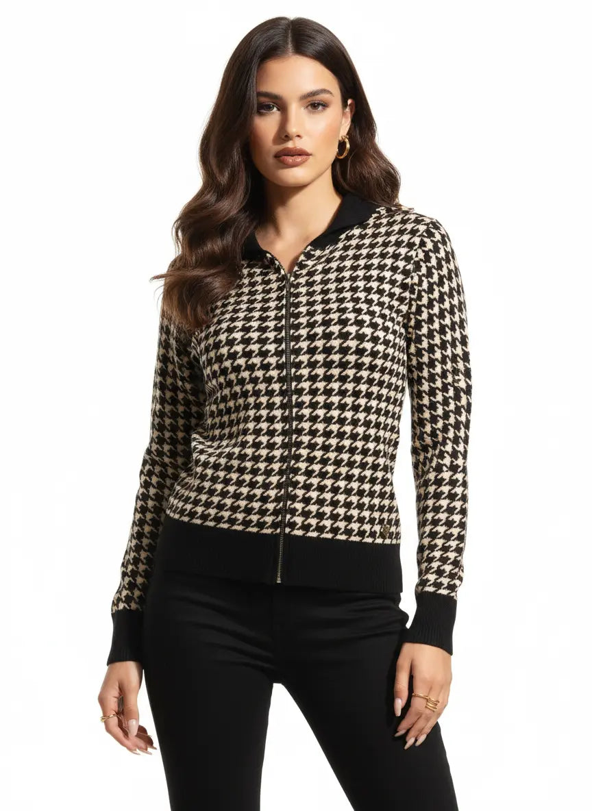 Un capo che unisce lo stile senza tempo del pied-de-poule alla praticità della felpa con zip. Il cappuccio in contrasto, i dettagli neri e la silhouette femminile lo rendono perfetto per look chic ma dinamici. 🖤🤍✨