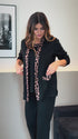 Questo finto twin set nero è impreziosito da profili e inserti animalier sul collo, sui bordi frontali e sulle tasche, per un look moderno e deciso.