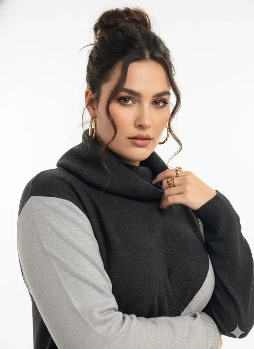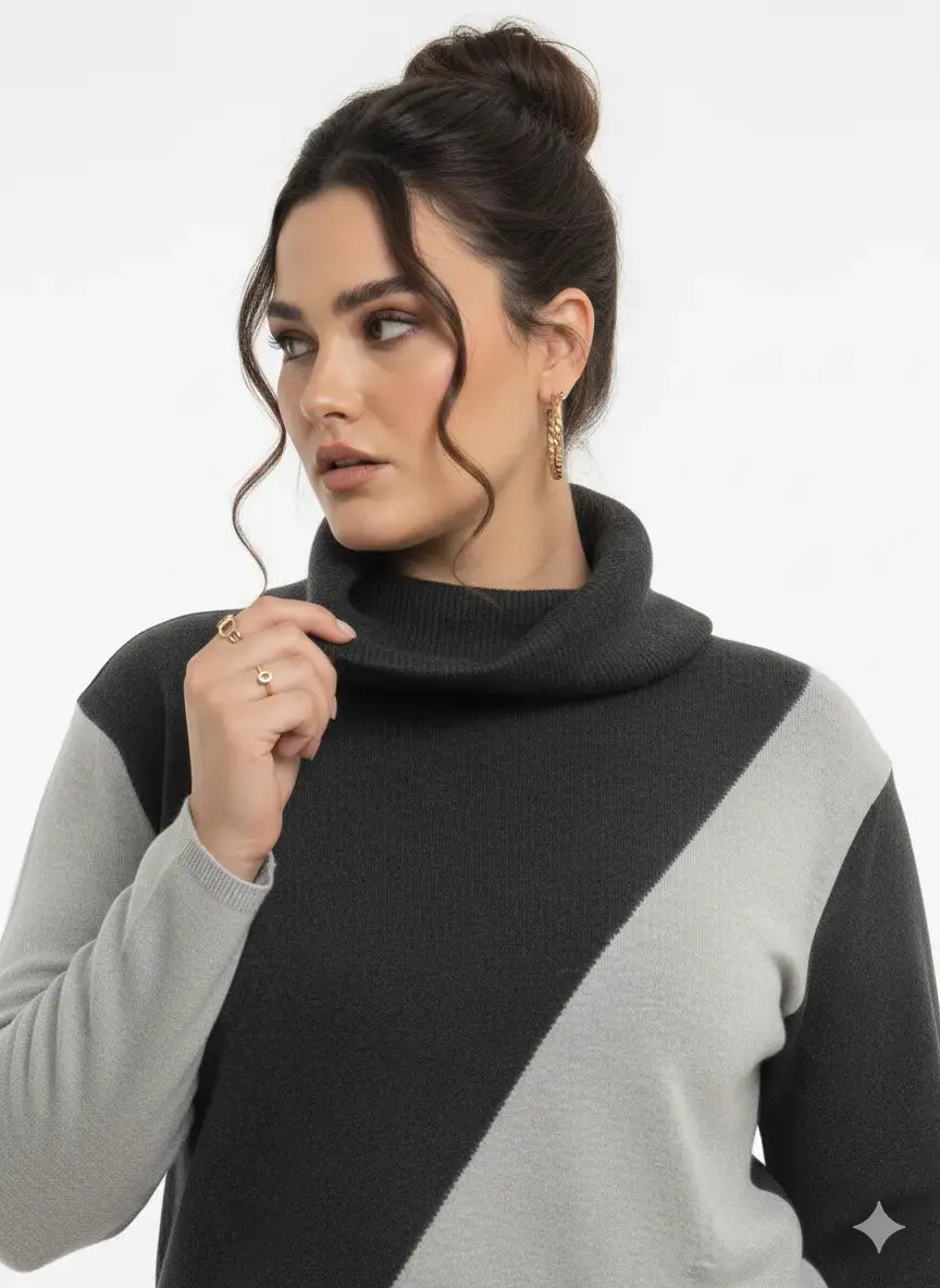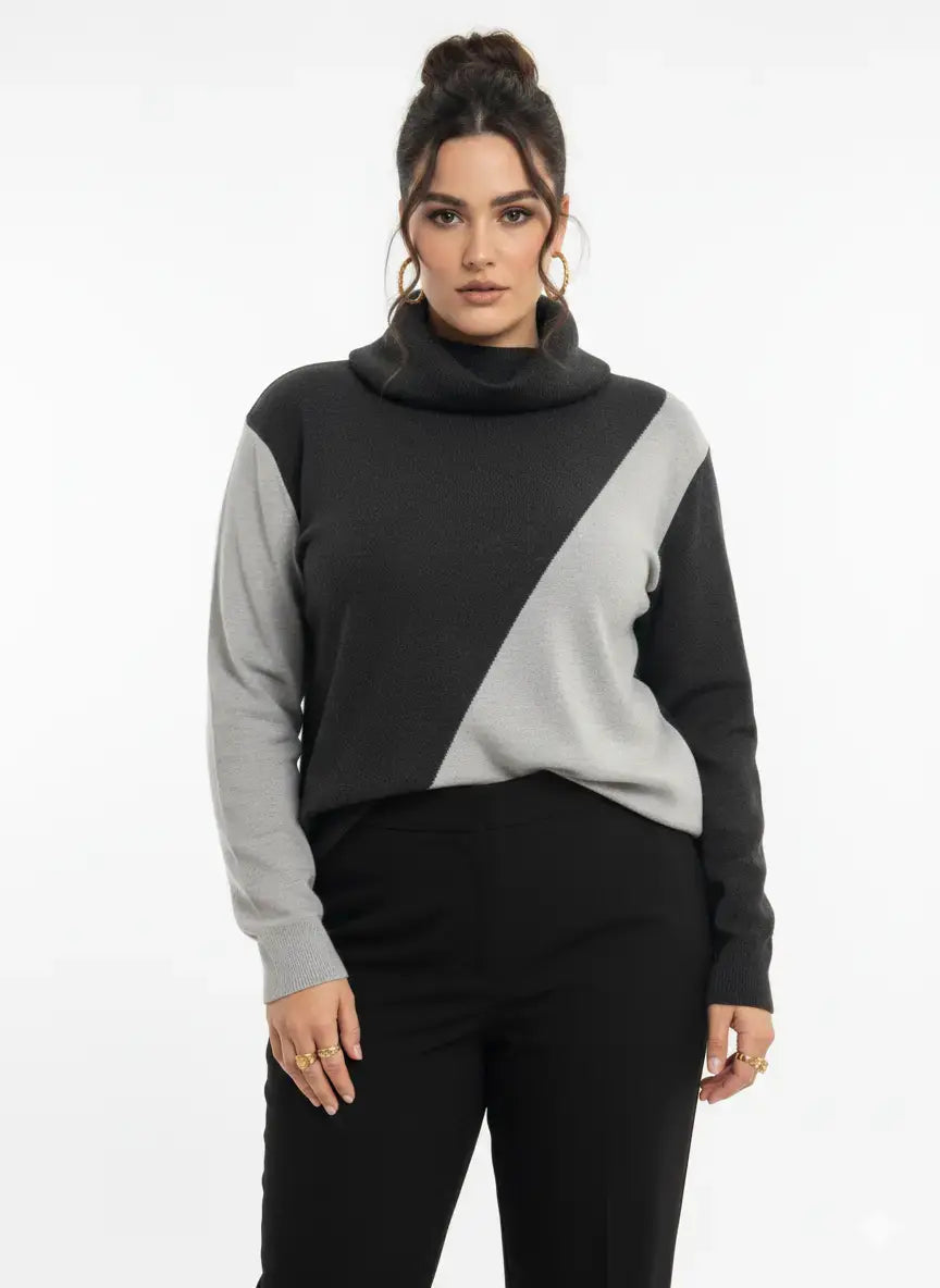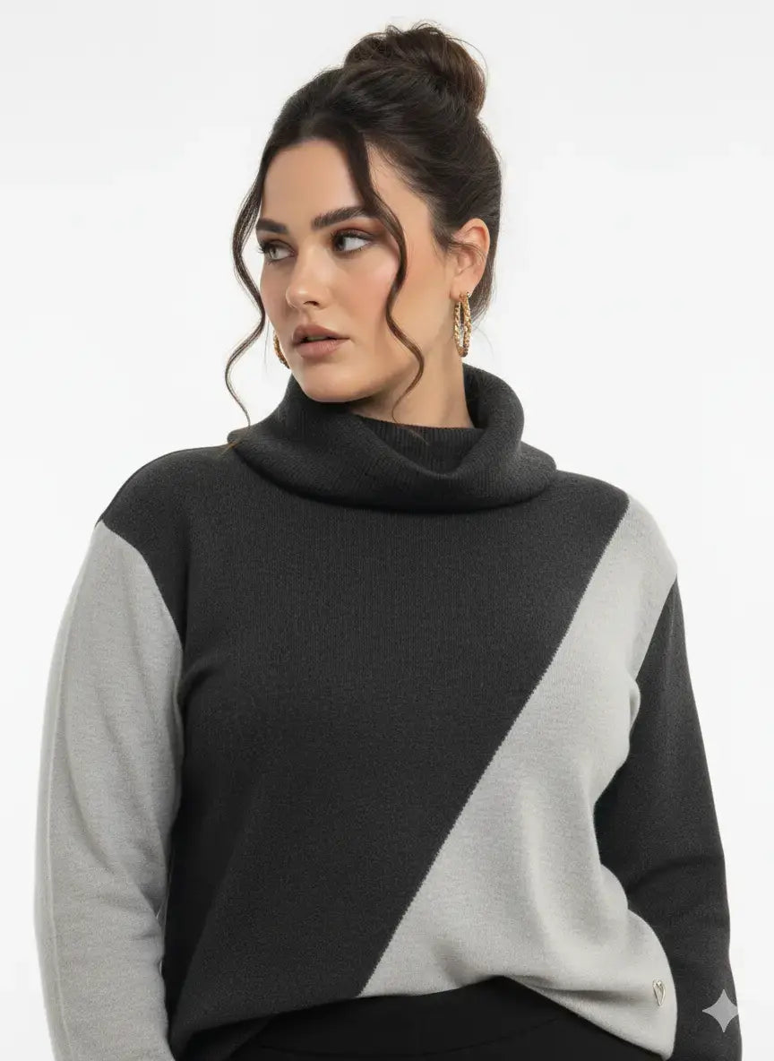 Una maglia moderna e versatile che unisce comfort e stile grazie al suo design a blocchi di colore e al collo alto removibile. Perfetta per chi ama distinguersi con eleganza senza rinunciare alla praticità.