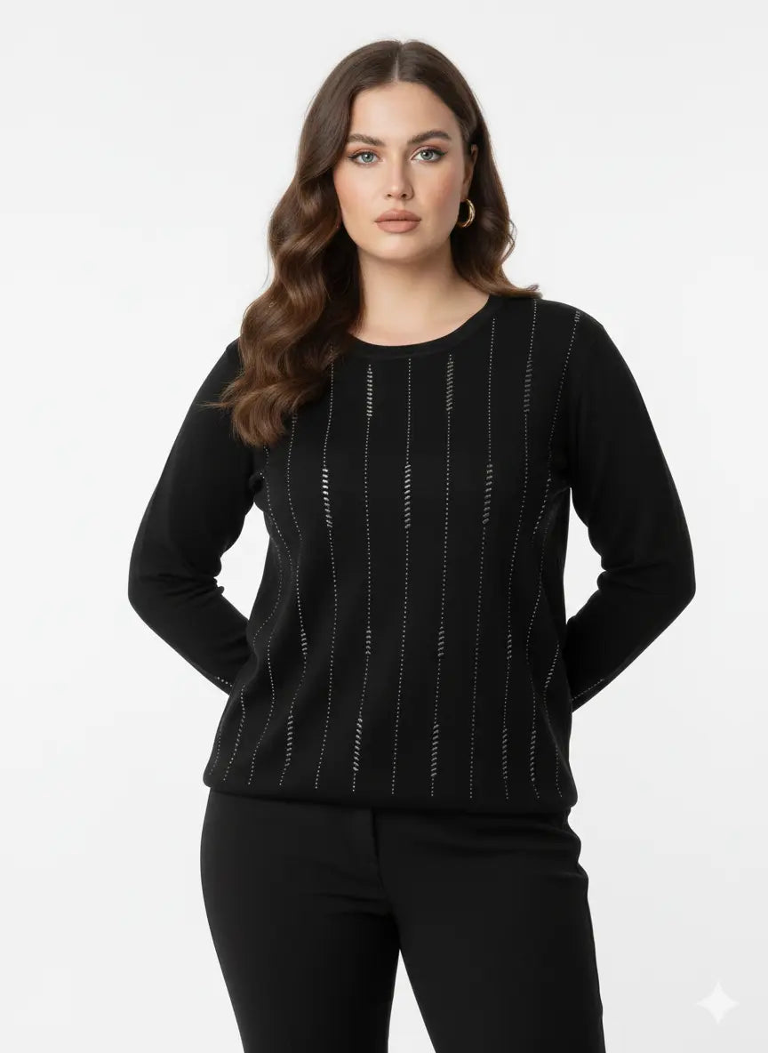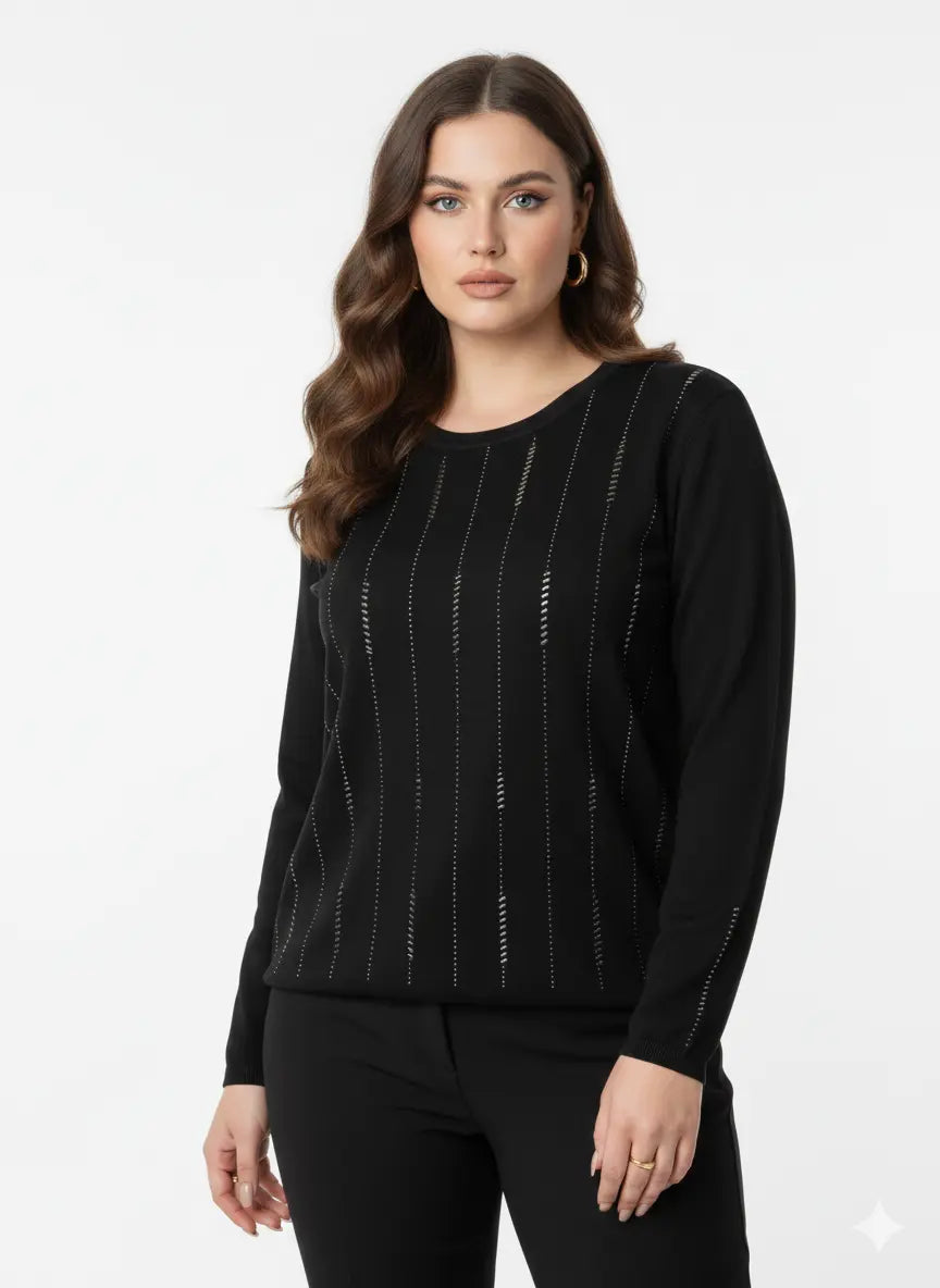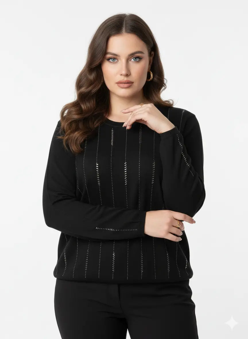 Un capo d'abbigliamento che combina la comodità della maglia con un tocco di glamour scintillante. Questo maglione è caratterizzato da un motivo a righe verticali con inserti metallici, perfetto per illuminare il tuo look con discreta eleganza.