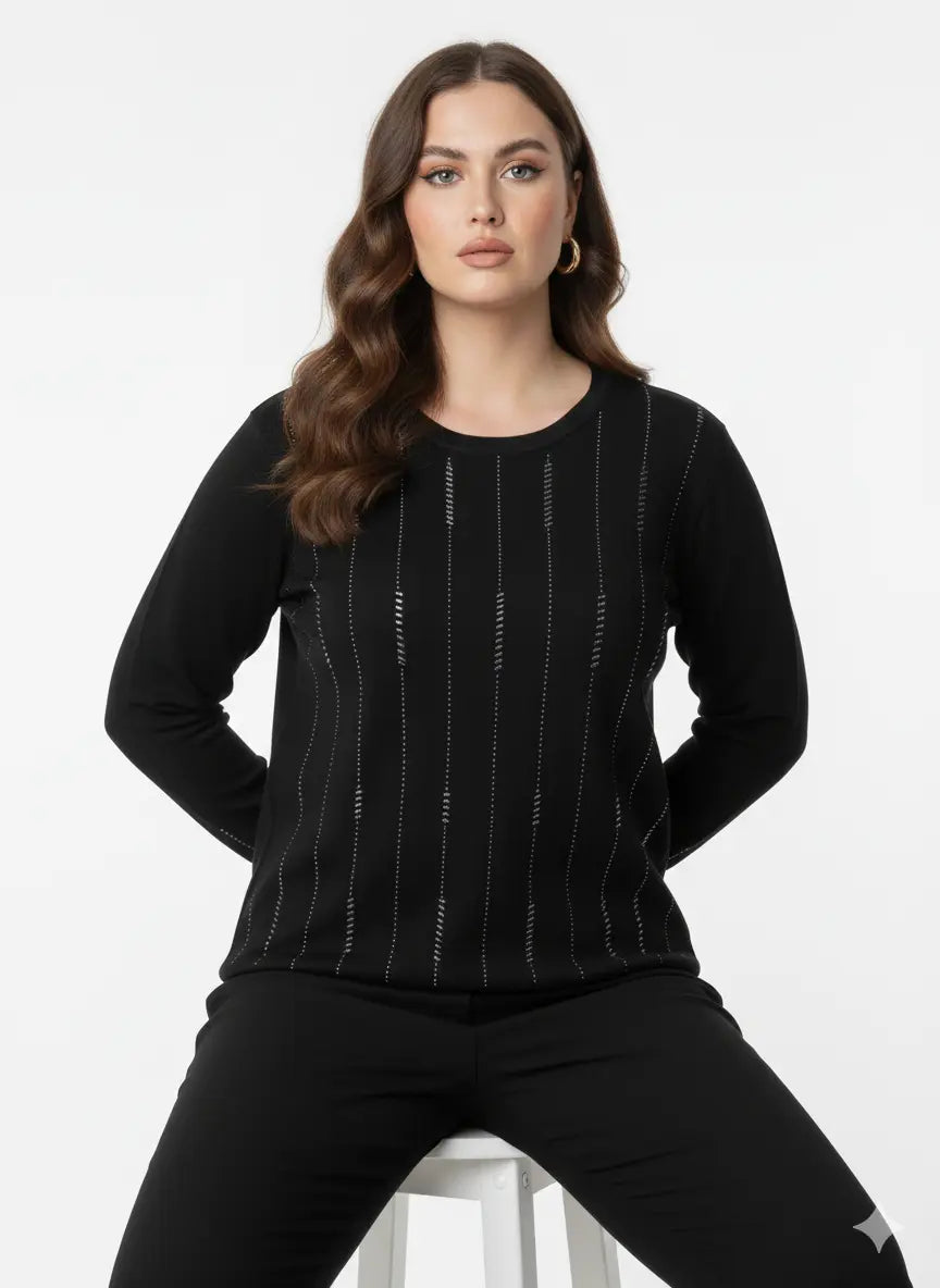 Effetto Luminoso: Le striature verticali metalliche catturano la luce e slanciano la figura con un effetto sparkle moderno e chic. 🌟
