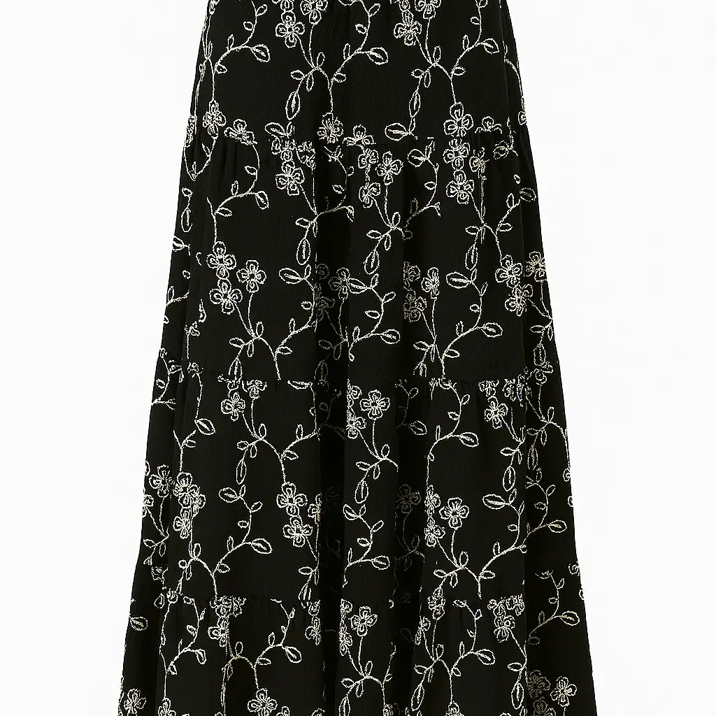 Dona un tocco boho-chic ai tuoi outfit estivi con questa splendida gonna lunga nera ricamata. Il modello è realizzato in un tessuto leggero e fresco, perfetto per la bella stagione, e arricchito da delicati ricami floreali color sabbia che si sviluppano su tutta la lunghezza. La linea svasata con balze dona movimento al capo, mentre il bustino elasticizzato assicura massimo comfort e una vestibilità versatile per ogni silhouette.