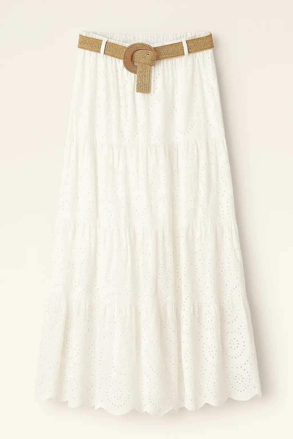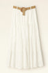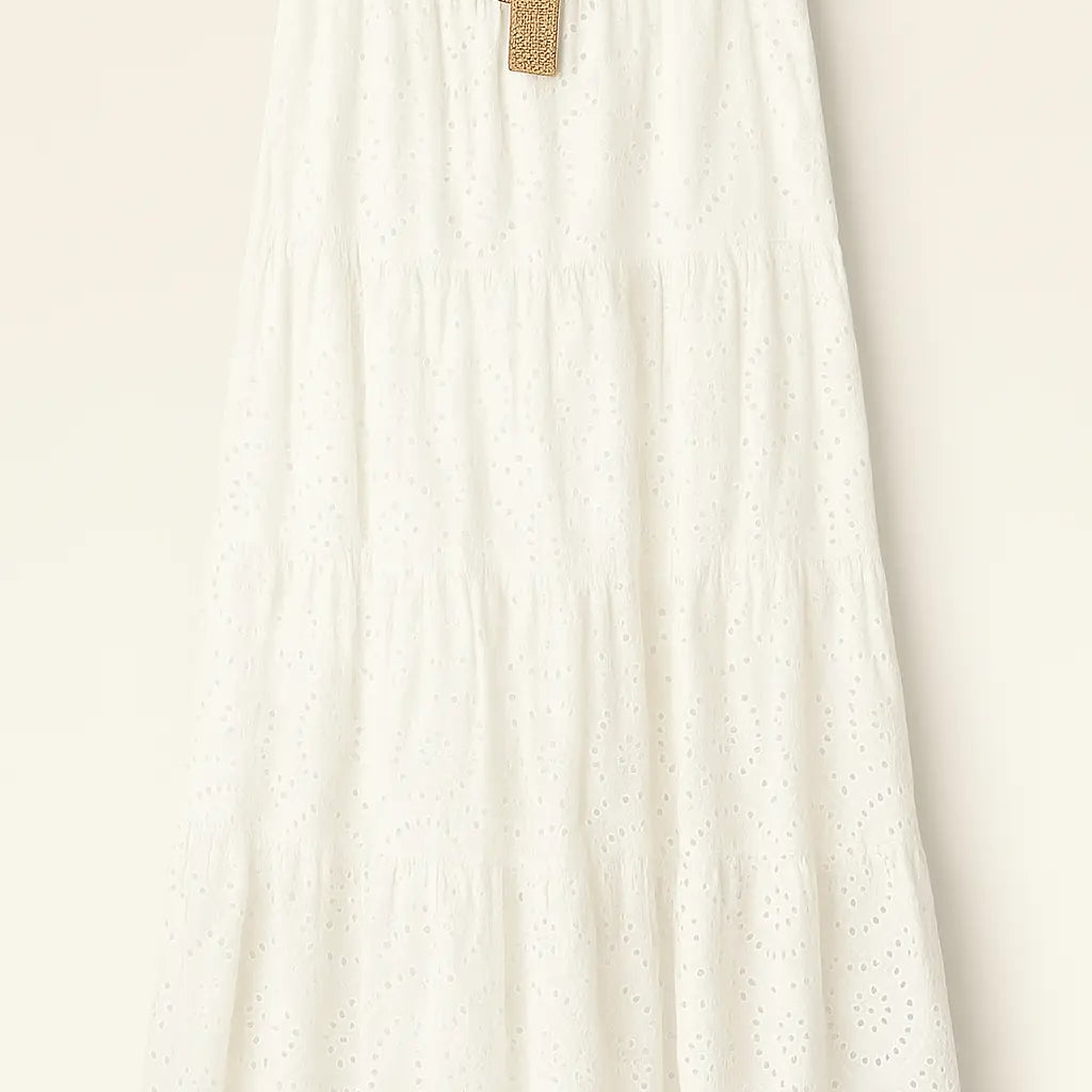 Gonna lunga in puro stile boho chic, realizzata in leggero tessuto sangallo bianco con motivo ricamato traforato. Il bustino elastico si adatta comodamente alle forme, offrendo una vestibilità regolare in taglia unica. Completa di cintura in rafia intrecciata con fibbia rotonda per definire il punto vita con naturale eleganza.