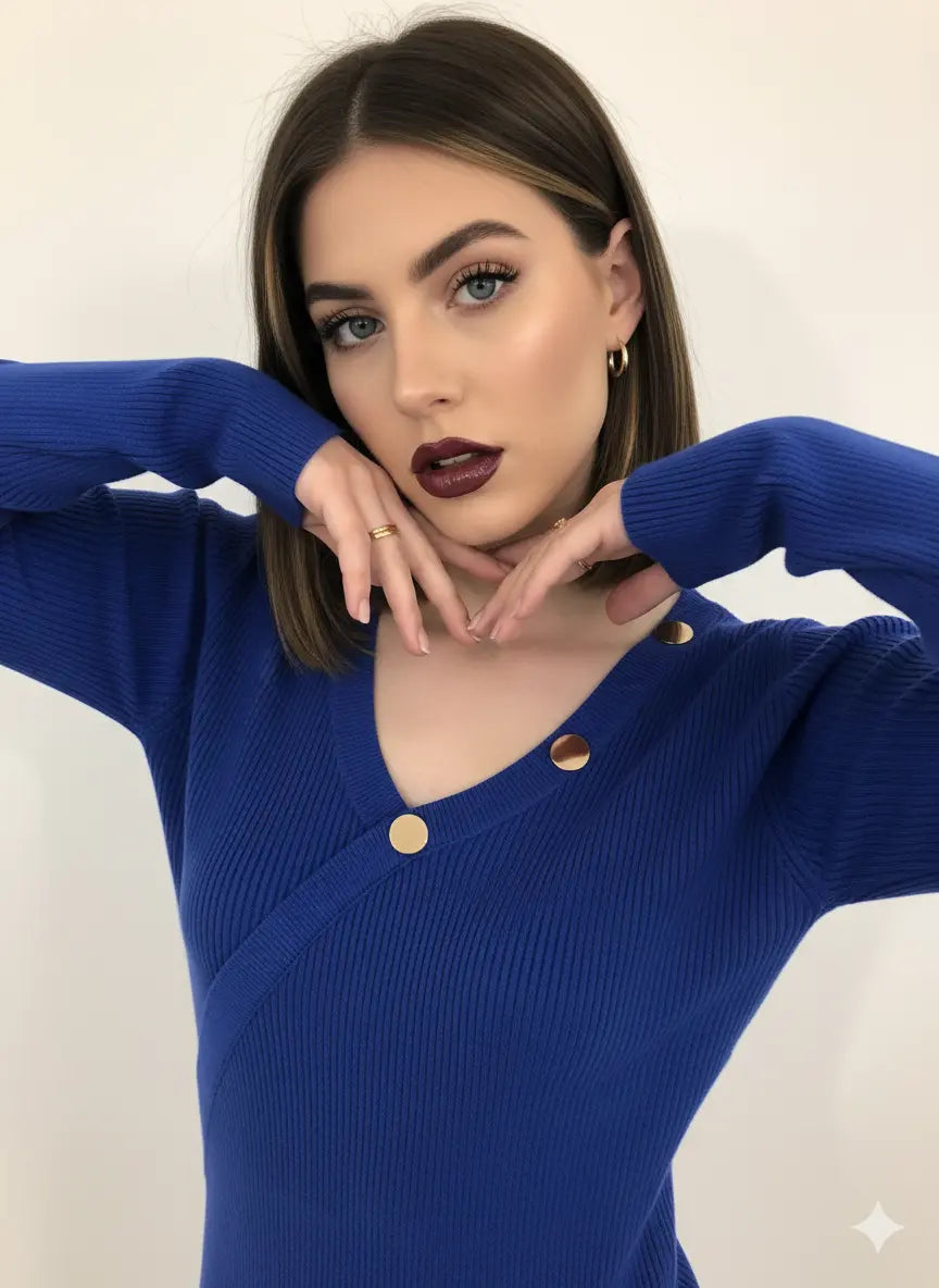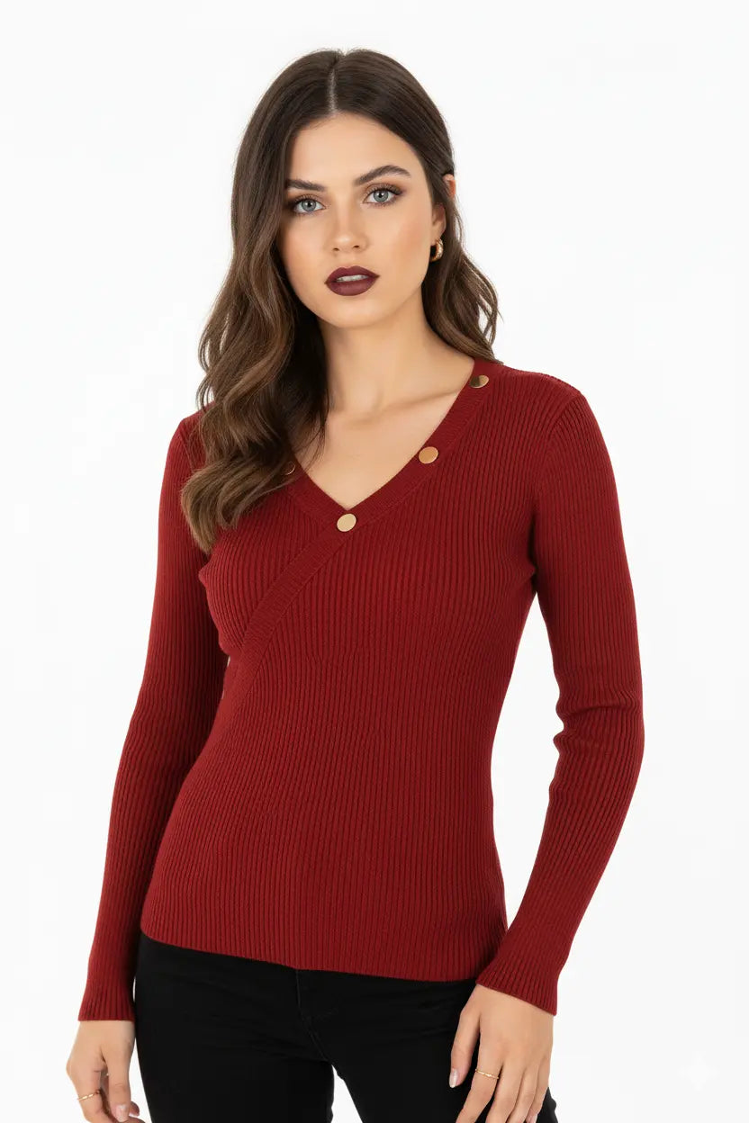 Questa maglia a costine, dal design avvolgente, è impreziosita da bottoni decorativi dorati sullo scollo a V, che valorizzano la linea e donano un tocco sofisticato.