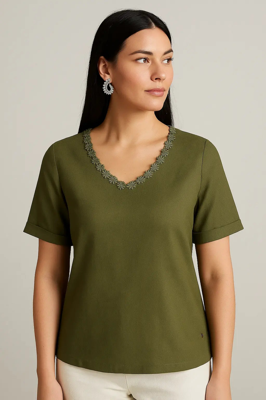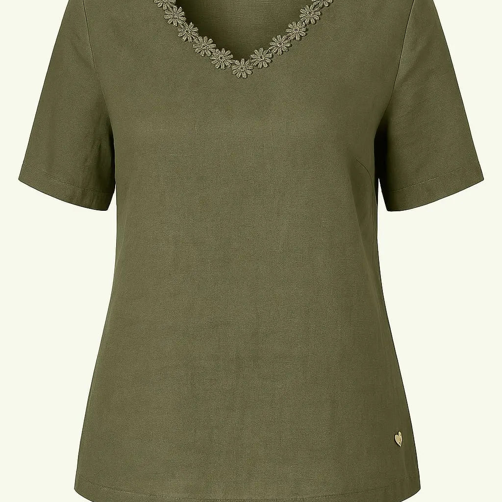 Questa maglia in lino è l'ideale per le tue vacanze estive o per un look casual di stagione. Il dettaglio della passamaneria sullo scollo a V aggiunge un tocco di stile e la rende un alleato di moda. Realizzata con materiali di alta qualità, ti garantirà un comfort leggero e fresco.