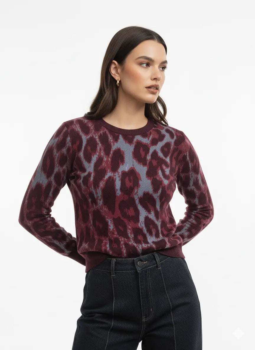 Un capo che non passa inosservato: questa maglia a maniche lunghe con stampa animalier nei toni del bordeaux e grigio dona un tocco deciso e ricercato ad ogni outfit. Perfetta per chi ama uno stile audace ma elegante. 🐾❤️🩶✨