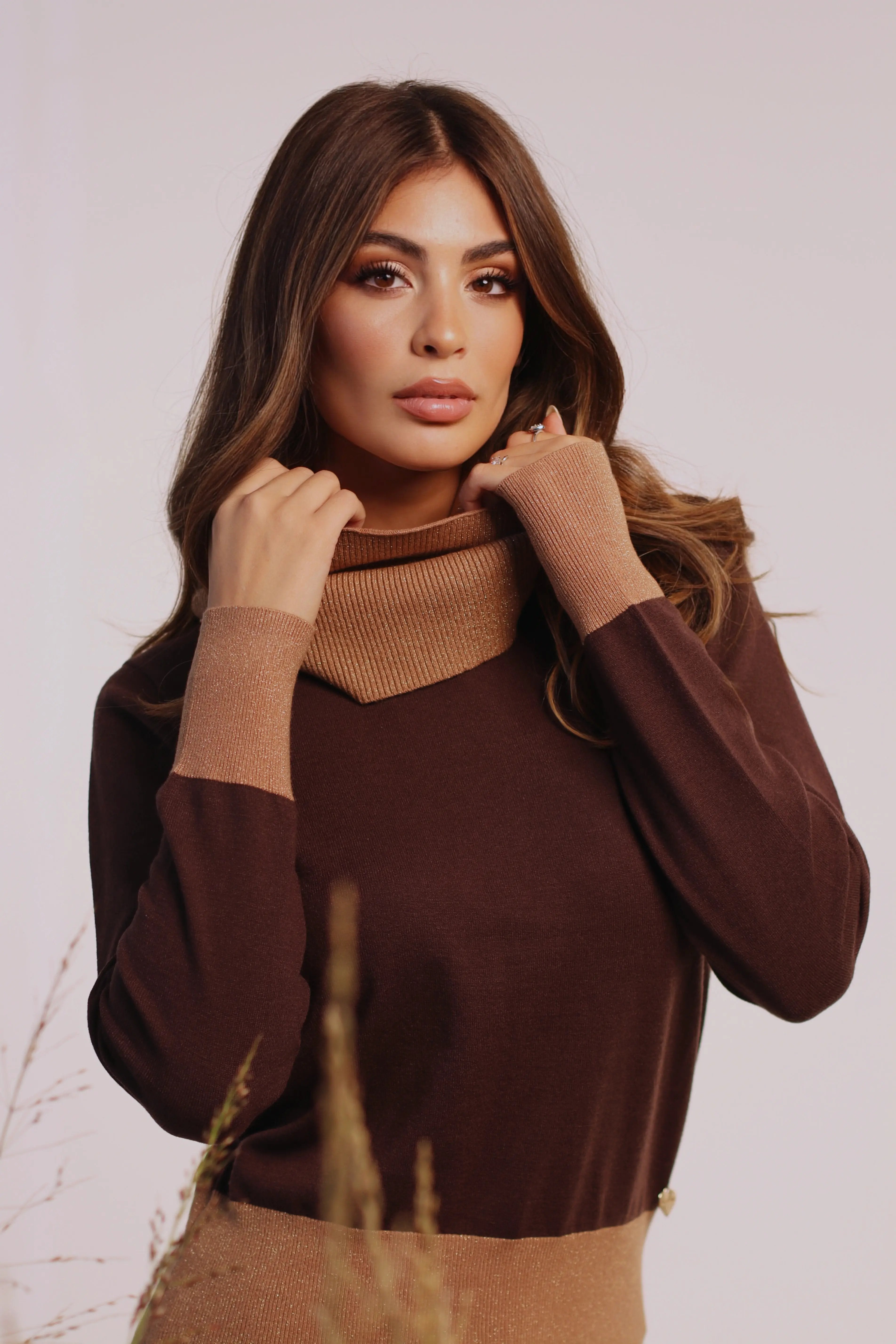 Questa maglia bicolore gioca sui contrasti di tonalità calde e luminose, impreziosita da inserti in lurex brillante che donano un tocco glam discreto.