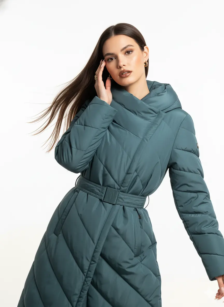 Realizzato in tessuto tecnico leggero e caldo, questo modello lungo presenta una trapuntatura diagonale, una cintura in vita che valorizza la silhouette e un collo avvolgente che protegge dal freddo con stile.