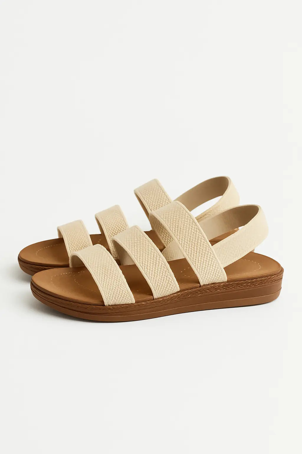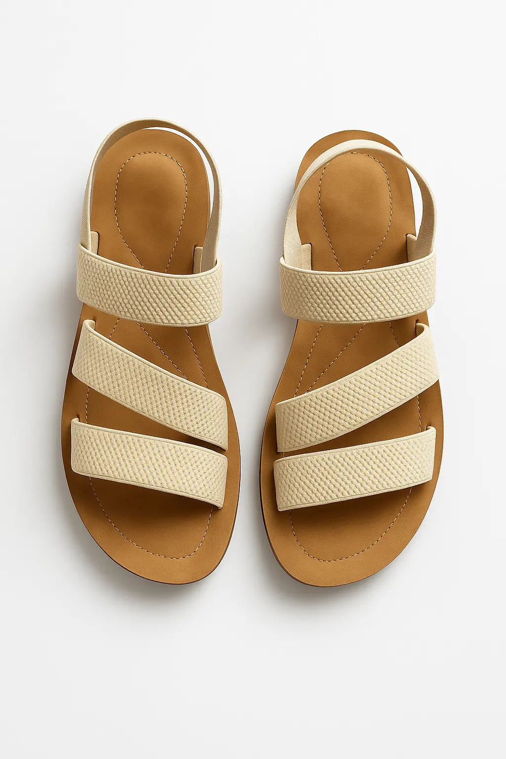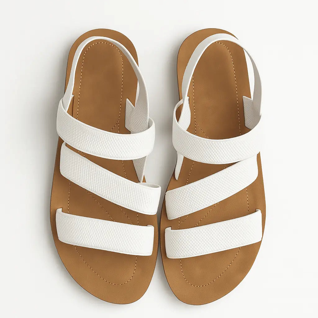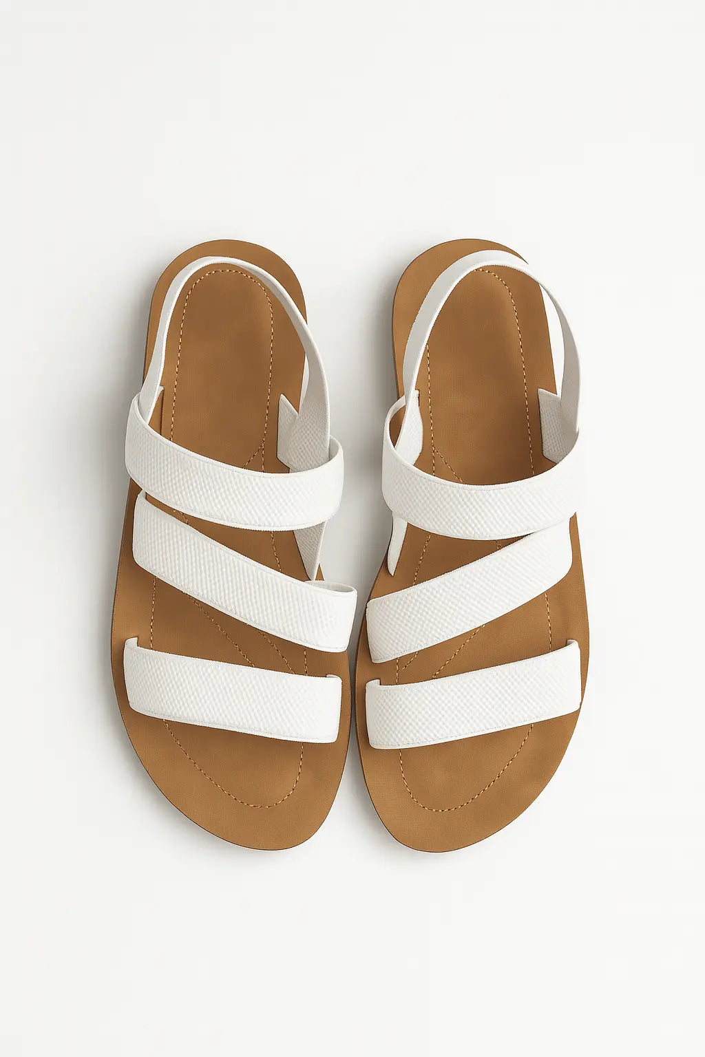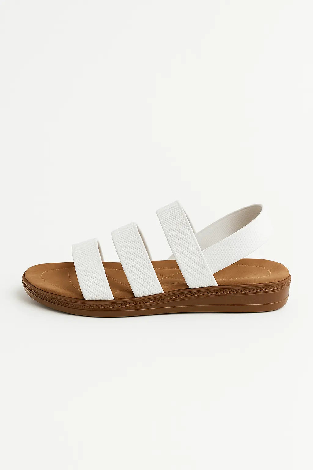 Versatili e ultraleggeri, questi sandali flat con fasce elastiche bianche sono perfetti per accompagnarti nelle giornate estive all’insegna del comfort e dello stile. Il design a tre fasce incrociate avvolge il piede in modo stabile, mentre il cinturino posteriore garantisce una calzata sicura. La suola in effetto cuoio aggiunge un tocco naturale e sofisticato, ideale per look casual e vacanzieri.