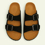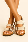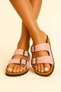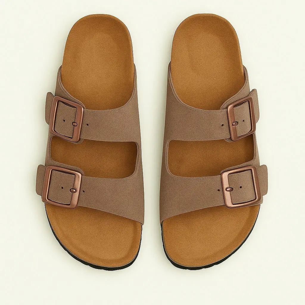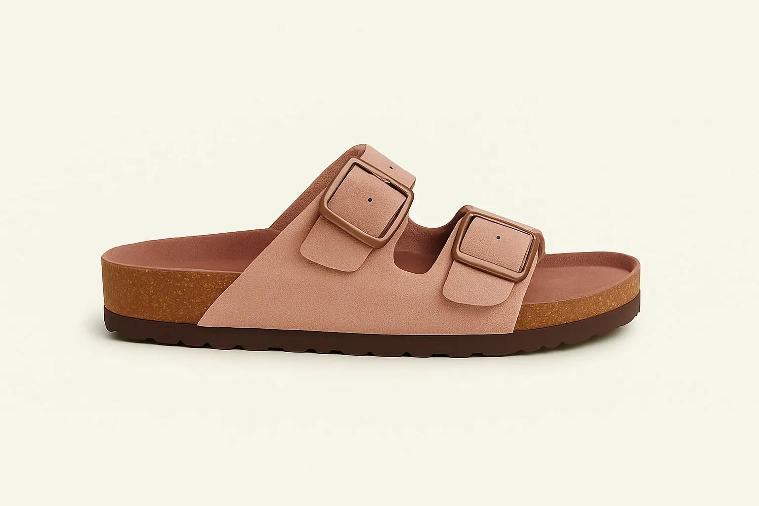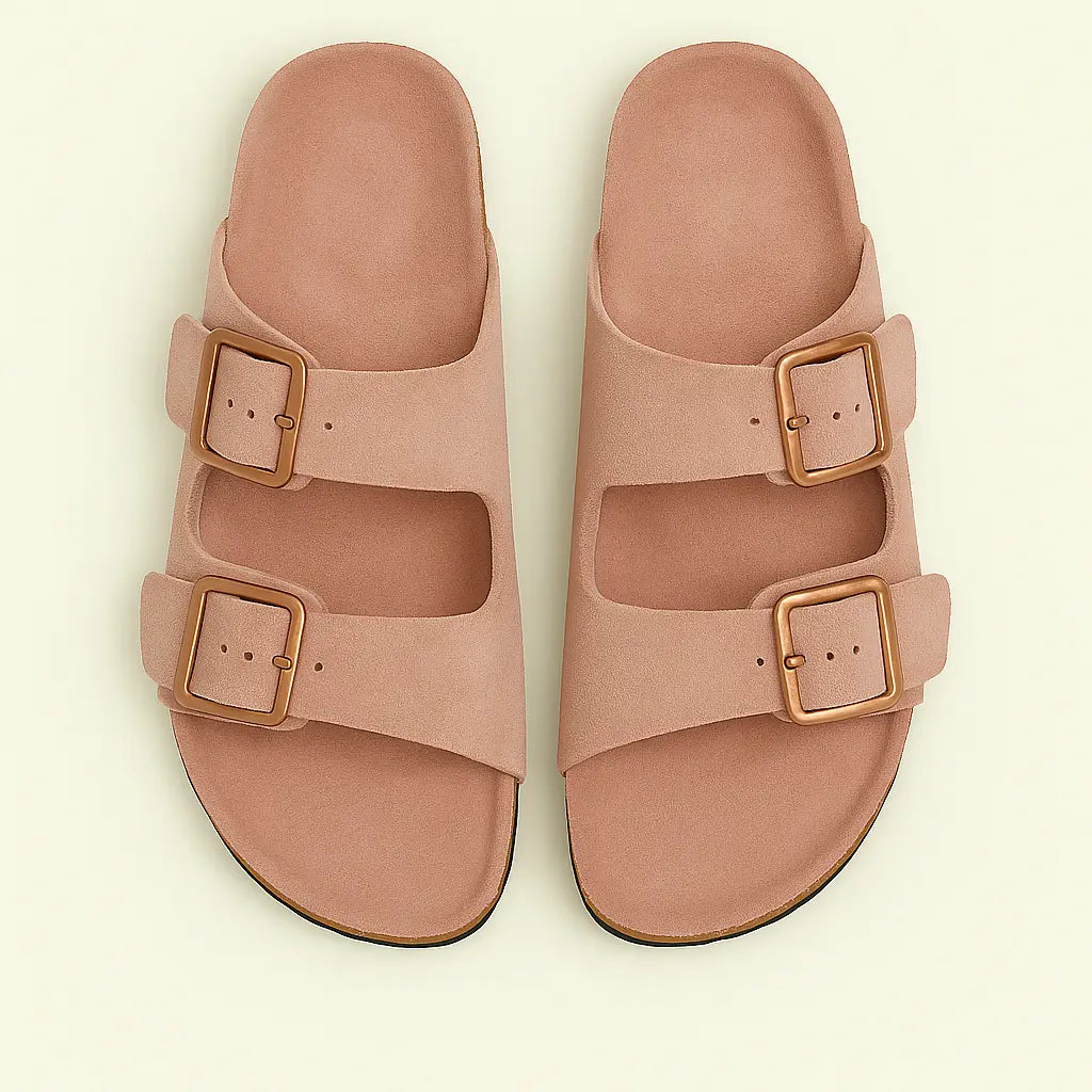 Le fasce in suede effetto velluto avvolgono delicatamente il piede, mentre le fibbie regolabili in metallo rosato donano un tocco prezioso.