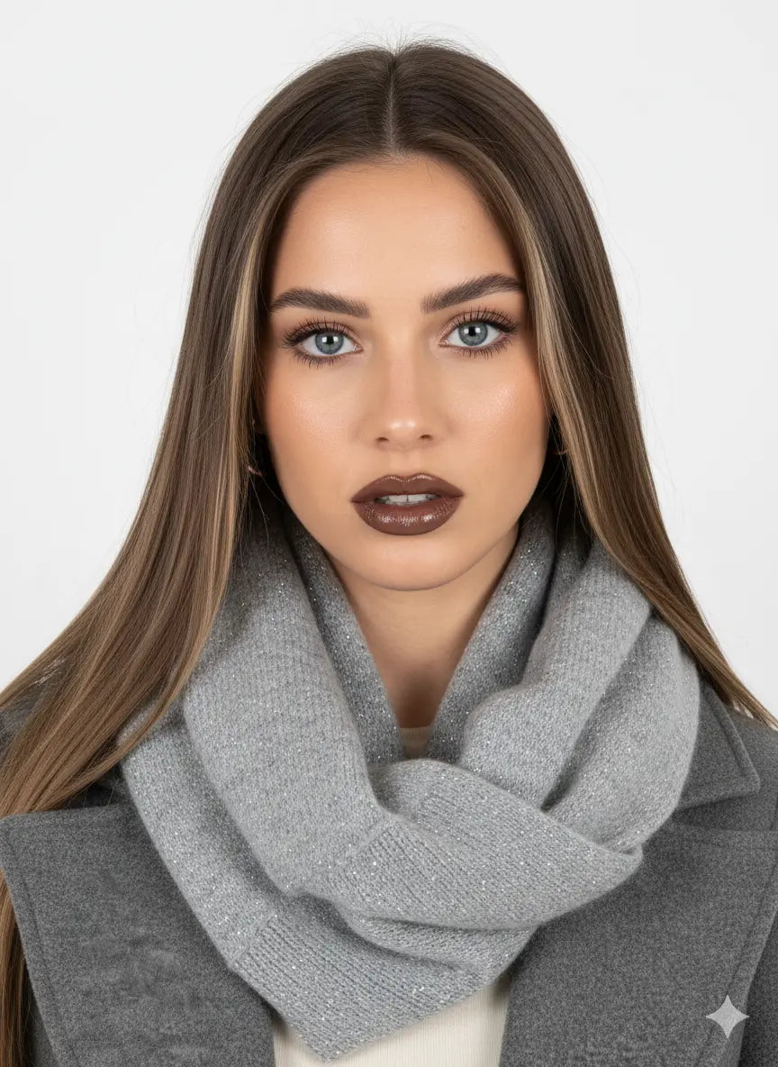 Sciarpa in maglia grigia, morbida e avvolgente, arricchita da micro paillettes tono su tono che regalano un tocco luminoso e raffinato. Un accessorio elegante e versatile, perfetto per completare i tuoi outfit invernali con calore e stile glamour.