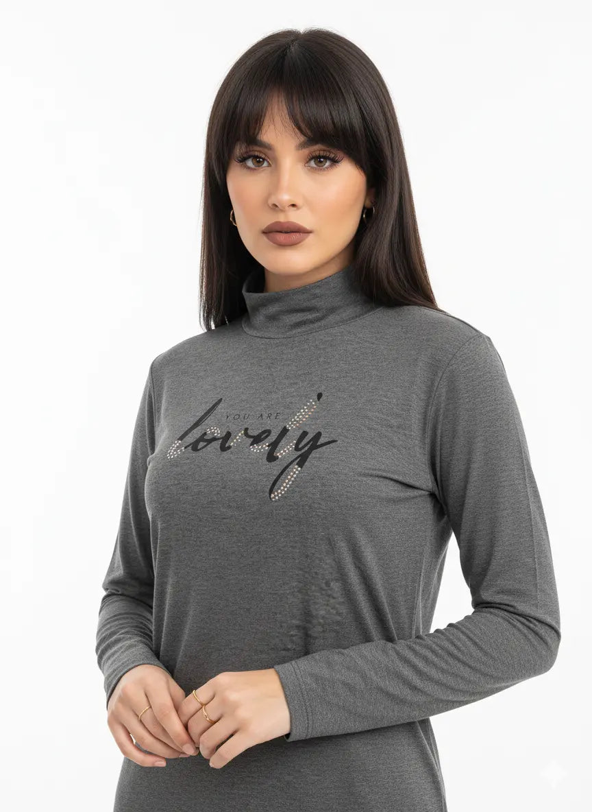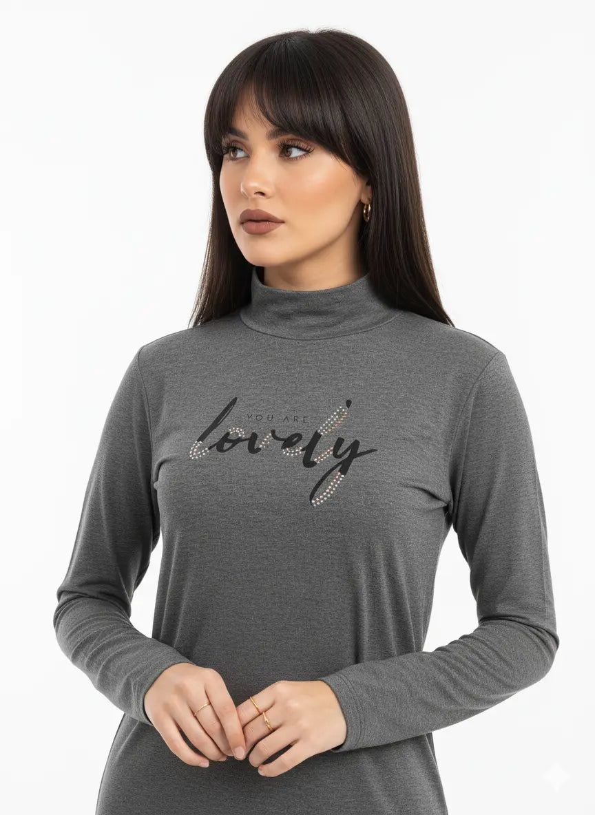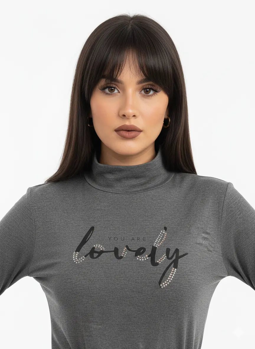 Un capo basic con un tocco glamour: questa maglia dolcevita in morbido tessuto elasticizzato è arricchita da una stampa frontale con scritta “You Are Lovely” impreziosita da strass luminosi che donano luce e femminilità. Perfetta da indossare da sola o sotto giacche e cardigan, è un must-have versatile per ogni guardaroba.
