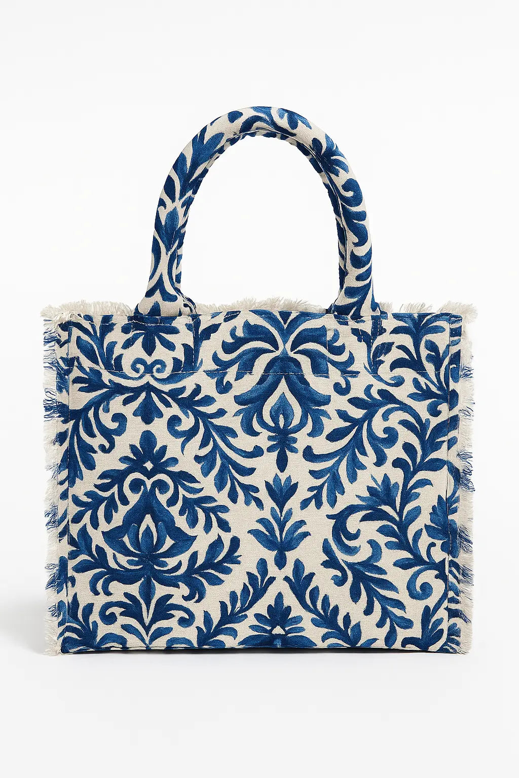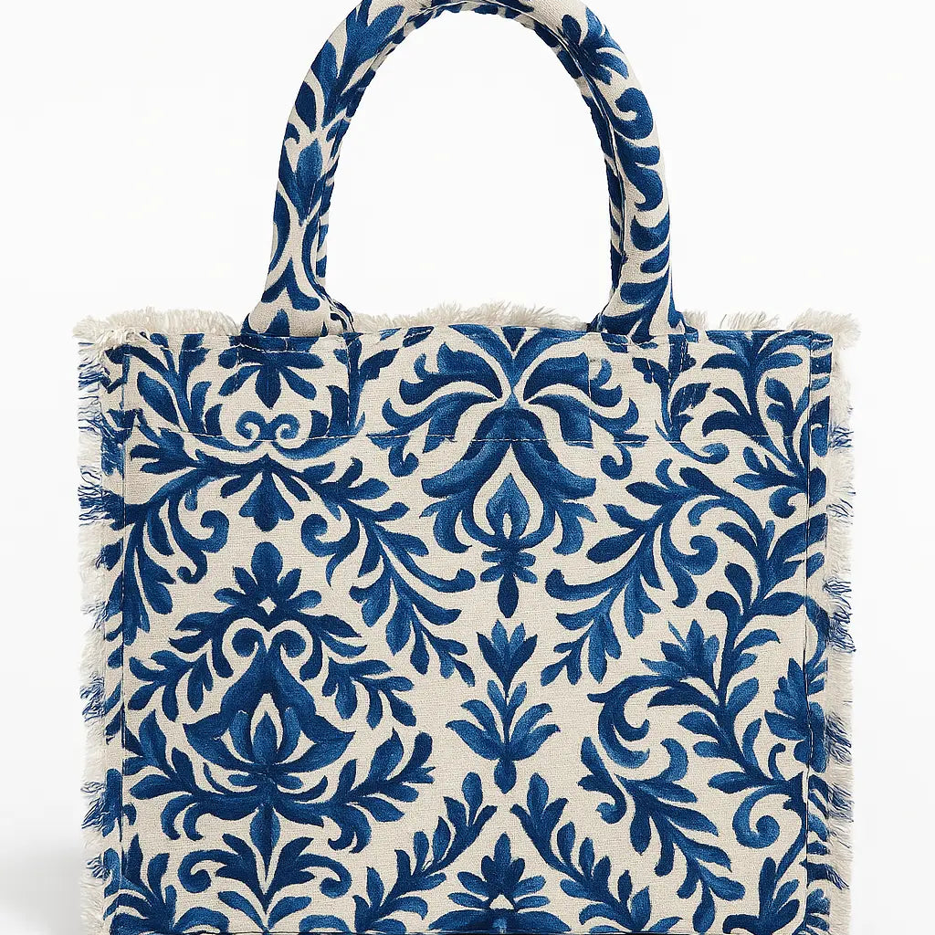 Questa tote bag è la perfetta espressione di uno stile mediterraneo vivace e raffinato. Realizzata in tessuto di cotone resistente, presenta una stampa all-over ispirata alle iconiche maioliche siciliane, declinate in eleganti tonalità blu su fondo écru. I manici imbottiti e rivestiti nello stesso tessuto assicurano un comodo trasporto a mano o a spalla. I bordi sfrangiati aggiungono un tocco boho chic che la rende ideale sia per la città che per le vacanze.