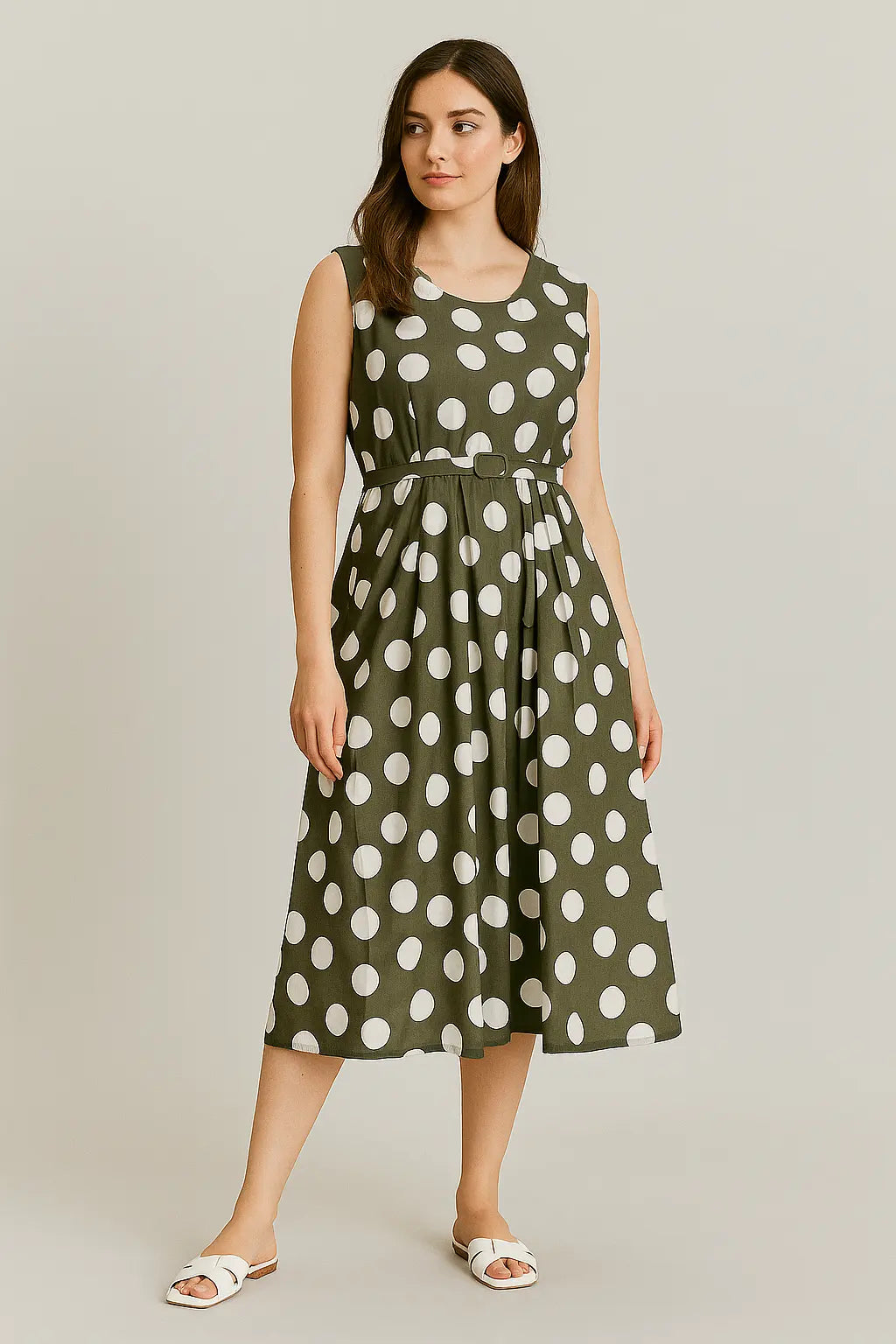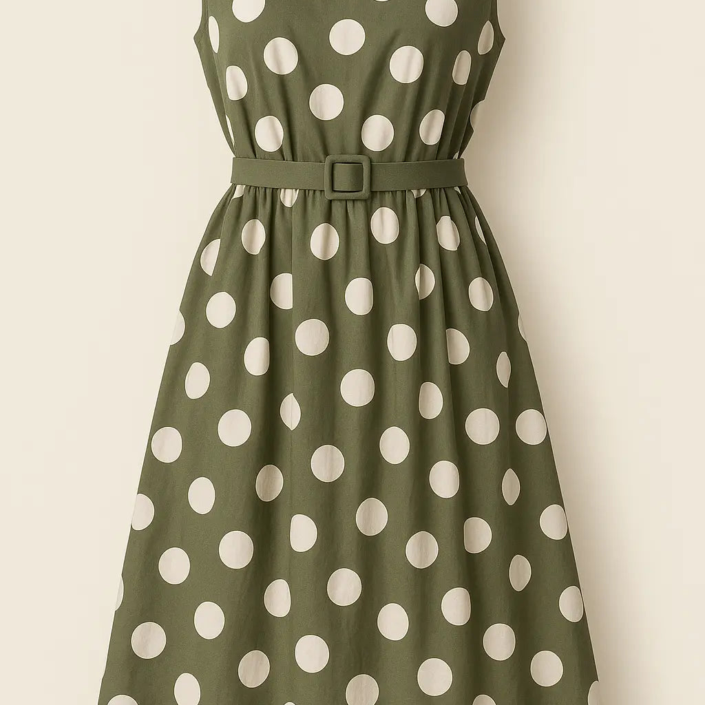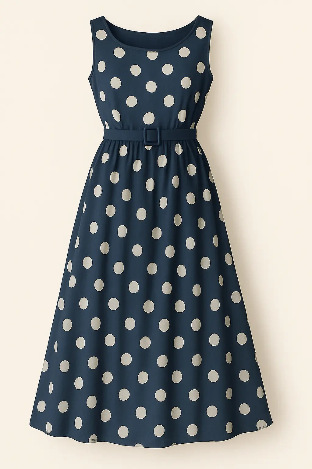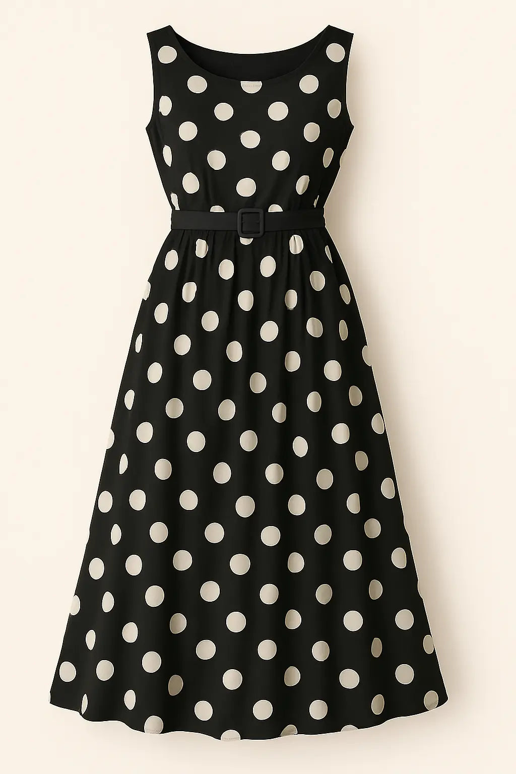 Rivivi il fascino retrò con questo elegante abito lungo a pois. Il motivo a maxi pois bianchi su base nera dona carattere e raffinatezza, mentre il taglio fluido e la cintura abbinata in vita esaltano la silhouette con naturalezza. Perfetto da indossare sia con sandali bassi per un look quotidiano, sia con tacchi per un’occasione speciale.