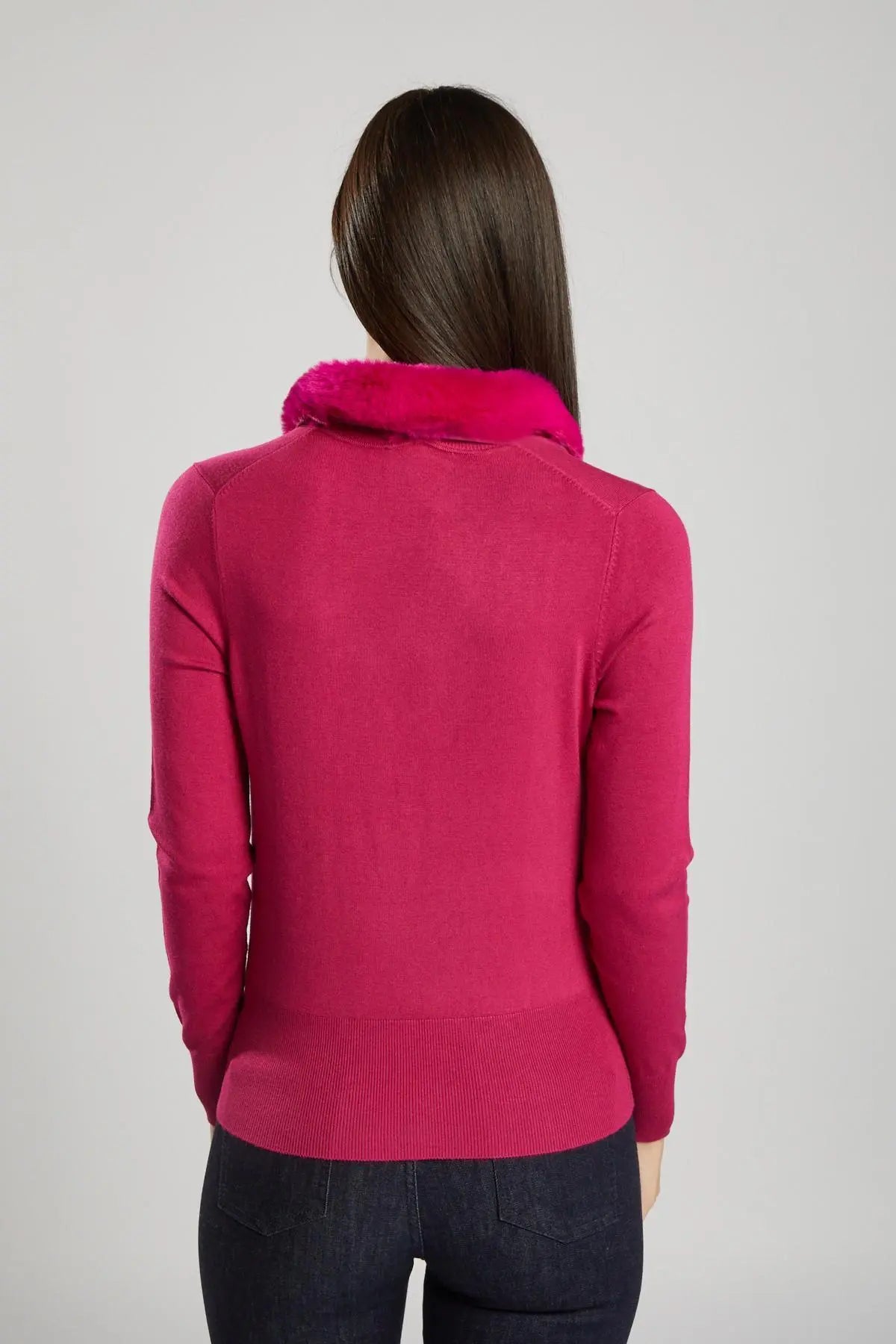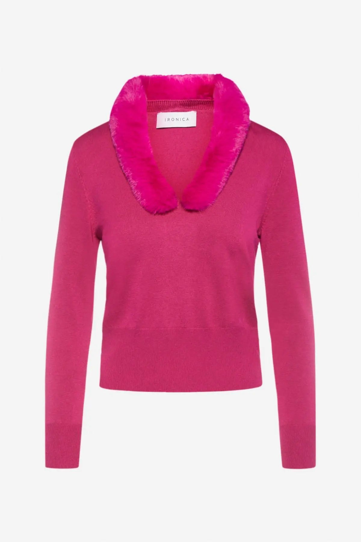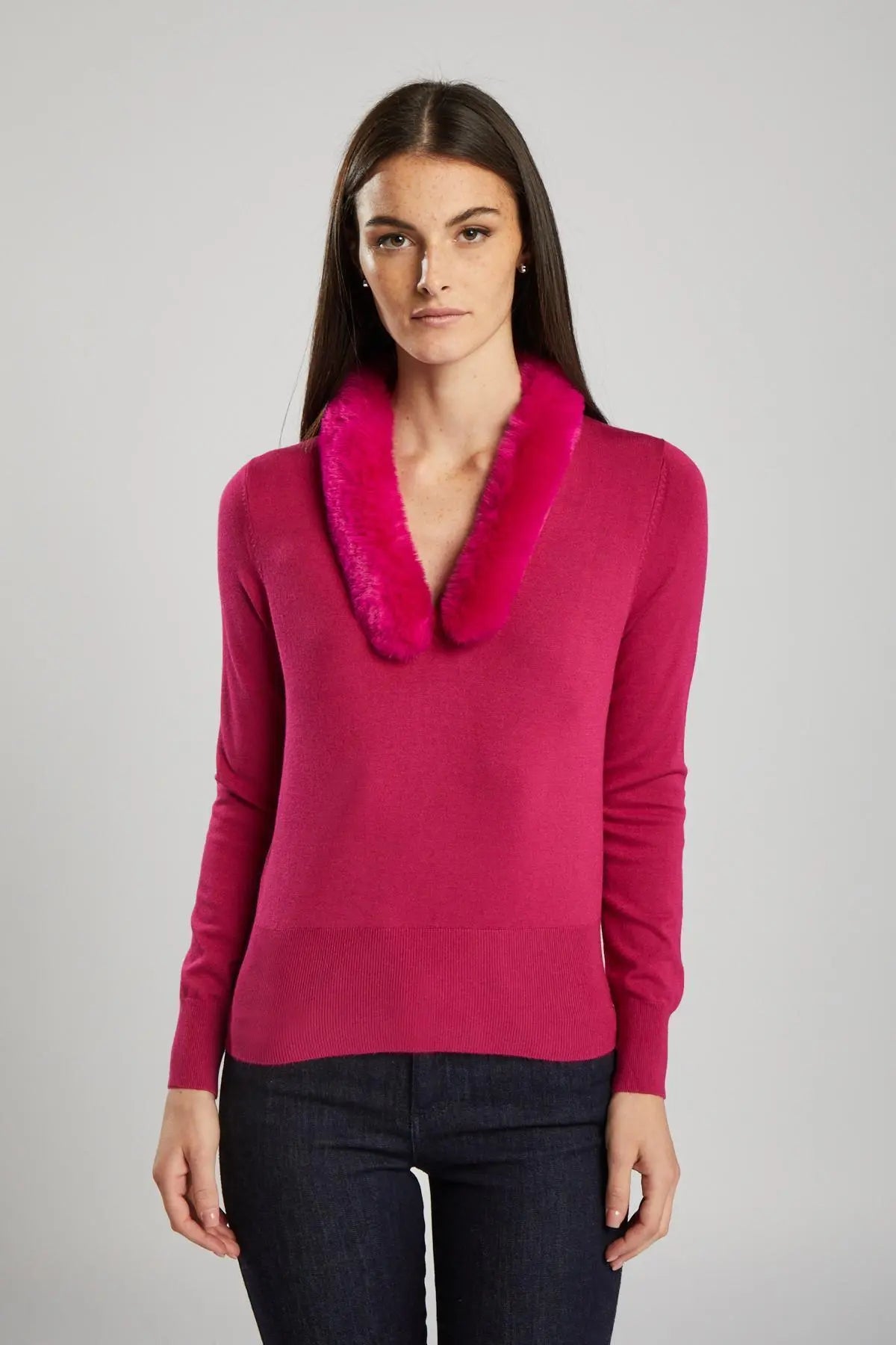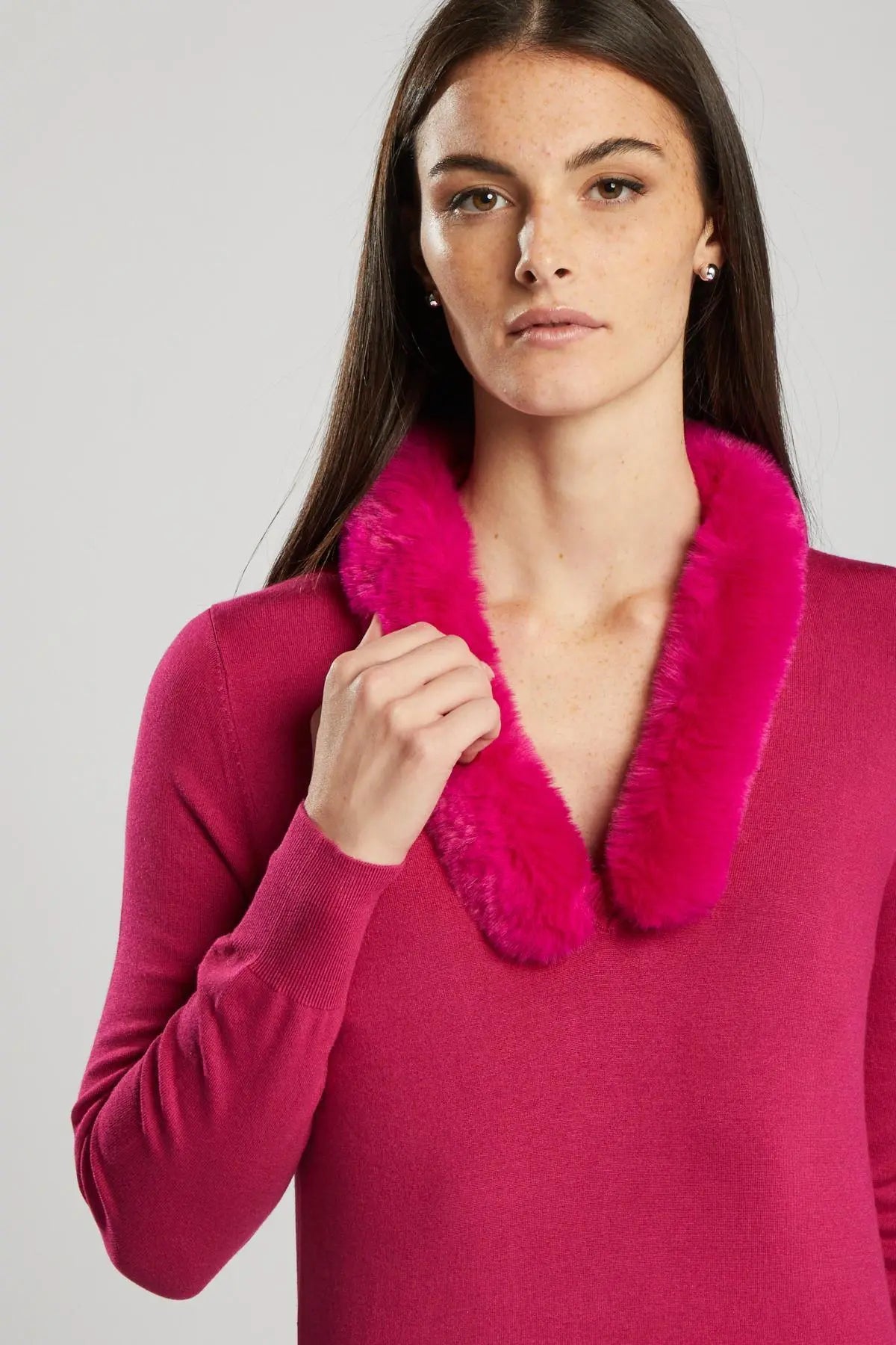 Maglia con scollo a v in pelliccia sintetica e maniche lunghe, finiture a coste.