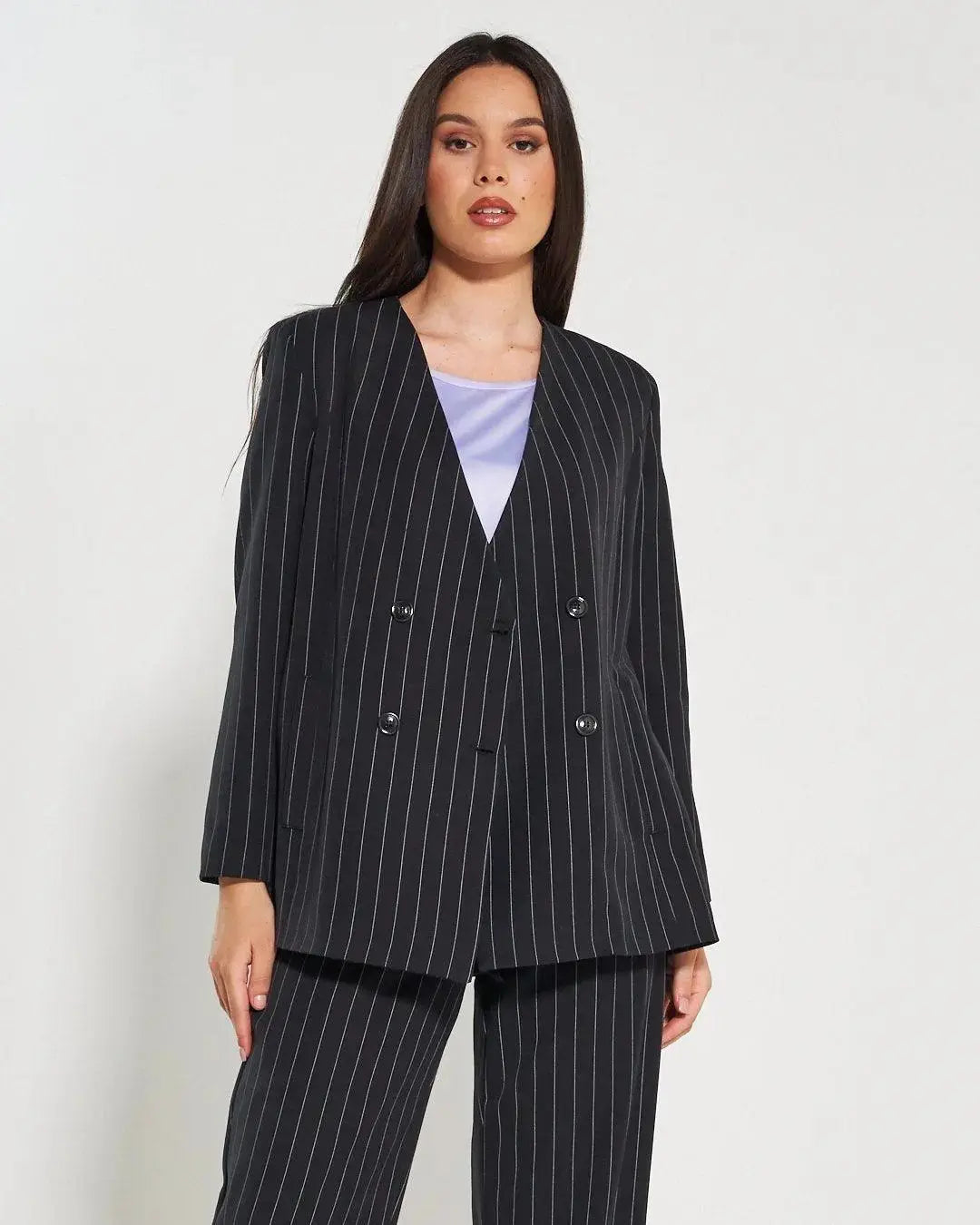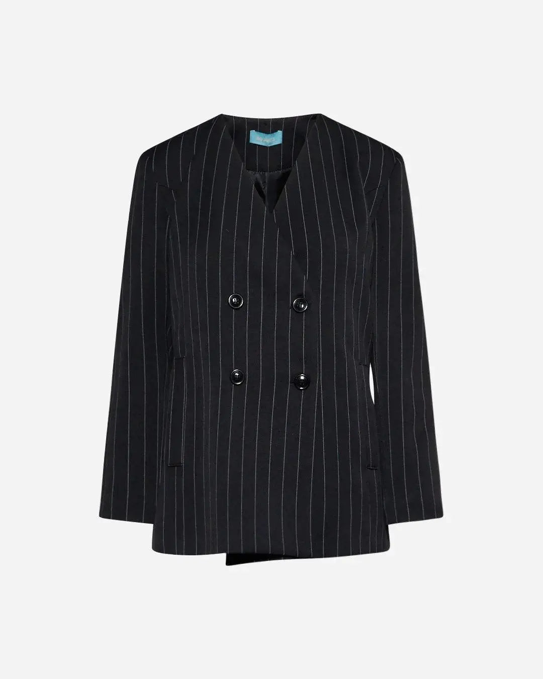 Giacca gessata modello doppio petto con manica lunga e bottoni in tono; tasche a filetto vere sul davanti . La linea semidritta della giacca permette di adattarsi ad ogni forma del corpo. Medaglietta logo cuore posizionata dietro al collo