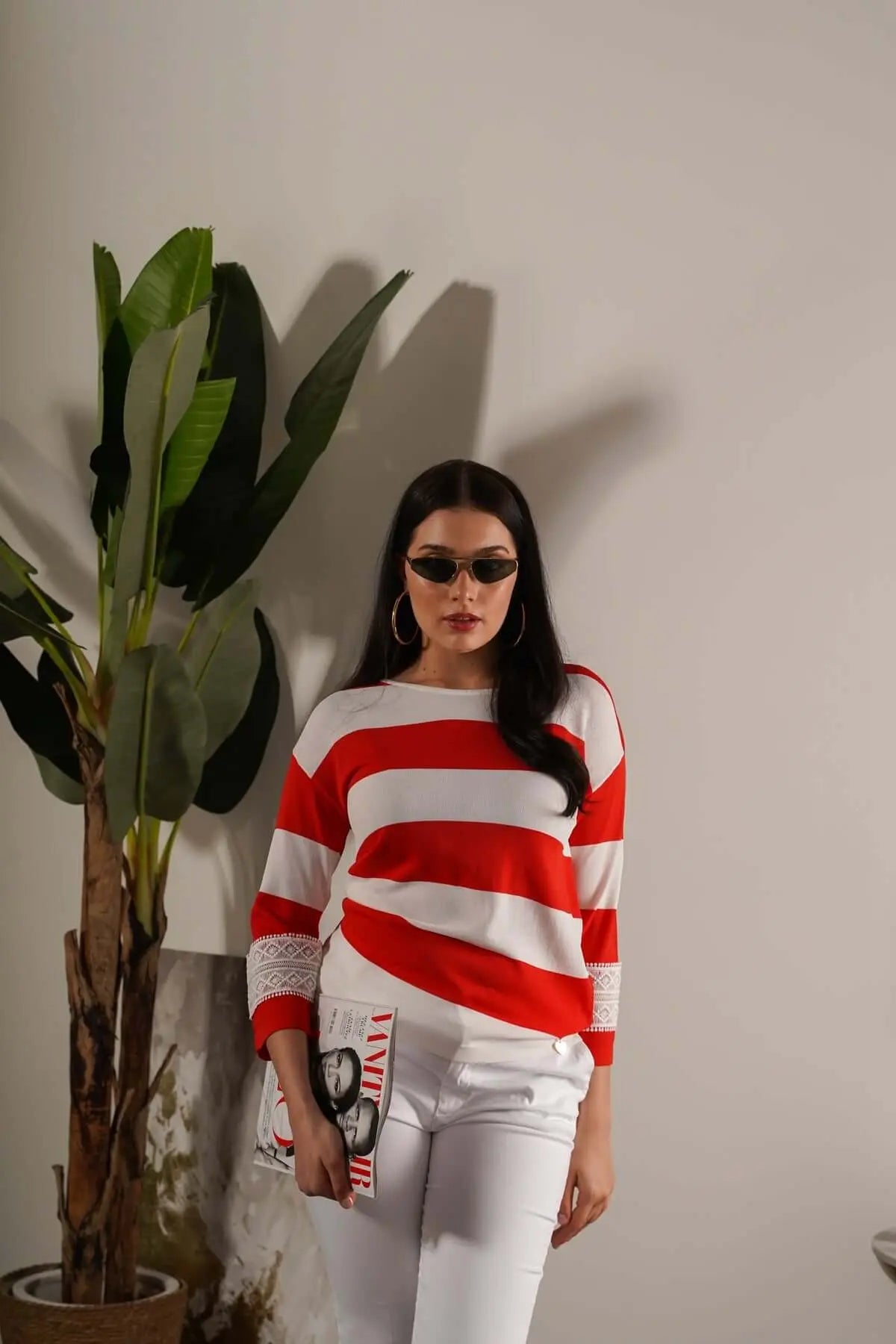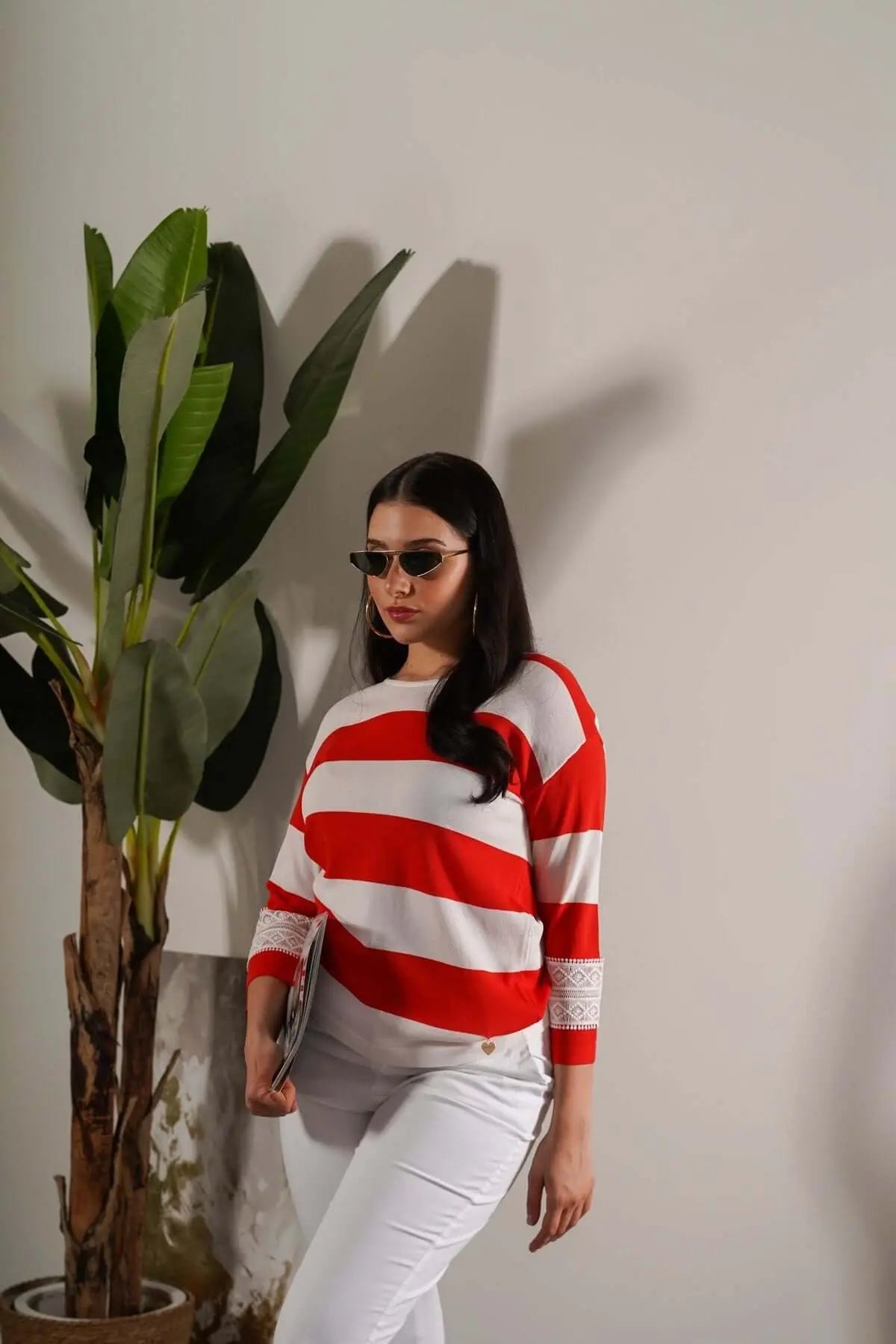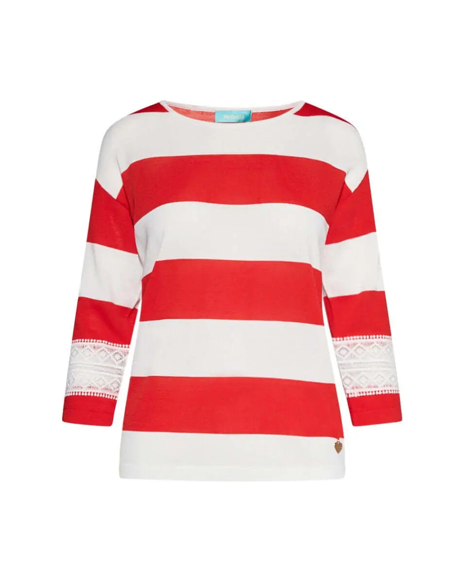 Maglia girocollo in filato a righe di misto viscosa con dettagli in pizzo PAPAVERO