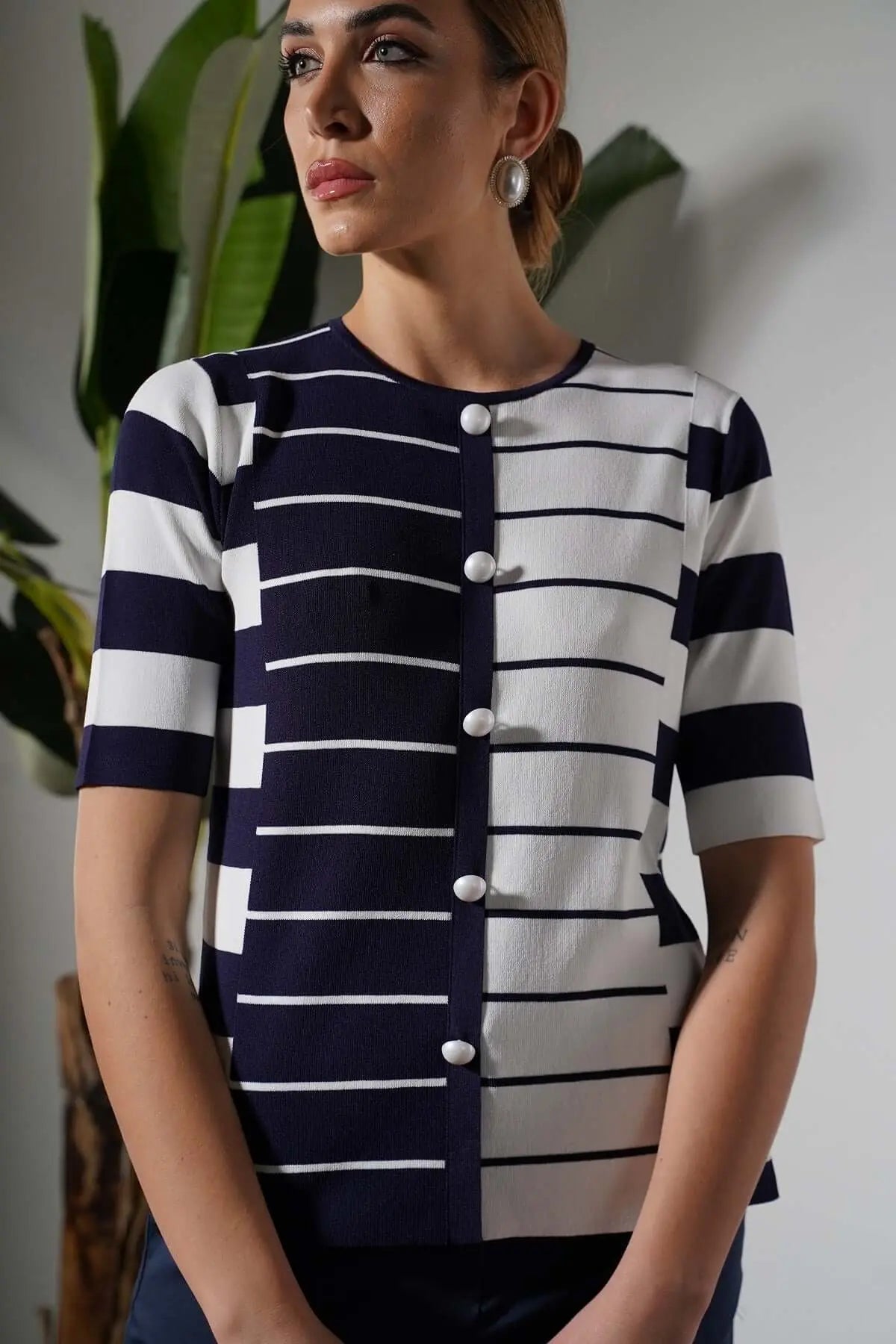 Maglia girocollo bi-colore in filato di misto viscosa a righe BLU