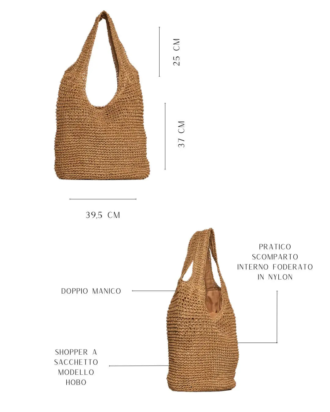 Borsa shopper a sacchetto modello hobo in rafia, con doppio manico e pratico scomparto interno foderato in nylon. Lunghezza: 37 cm, Larghezza: 39,5 cm, Luce manico: 25 cm.