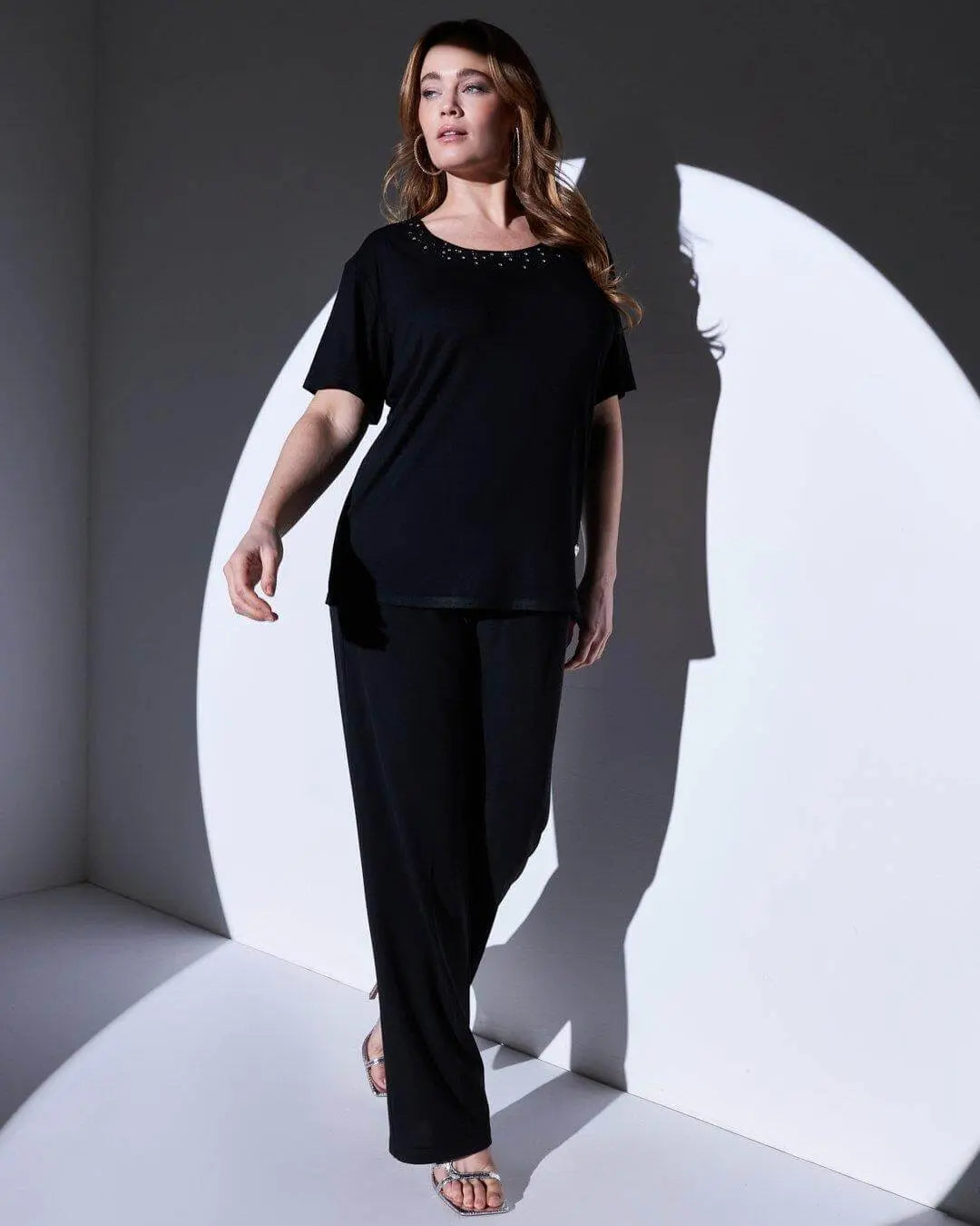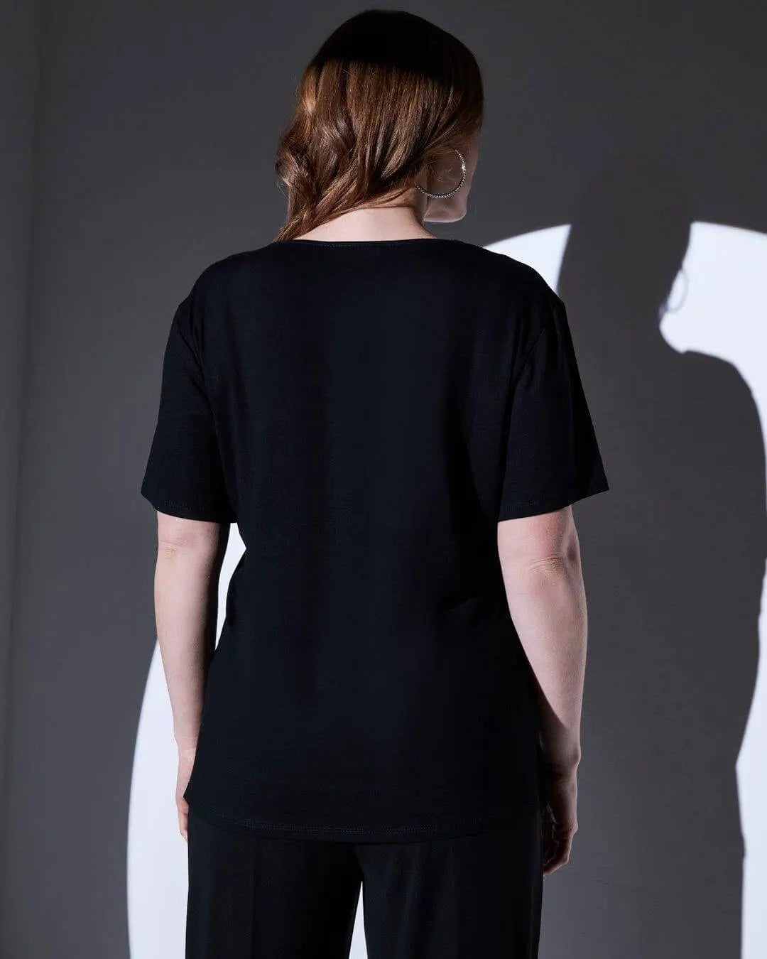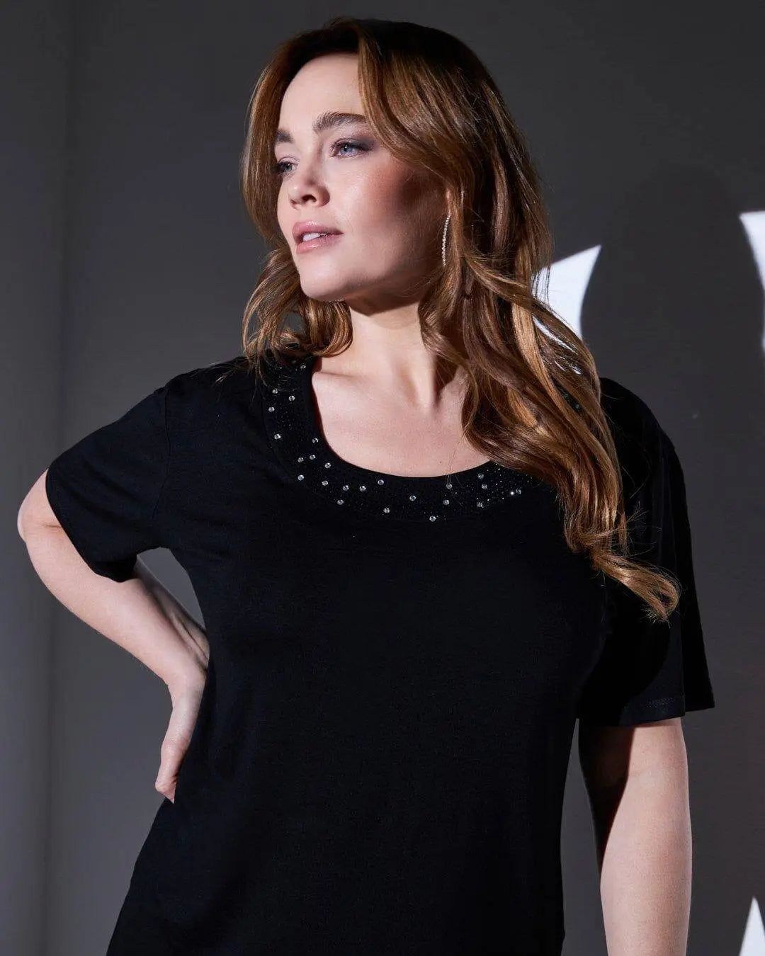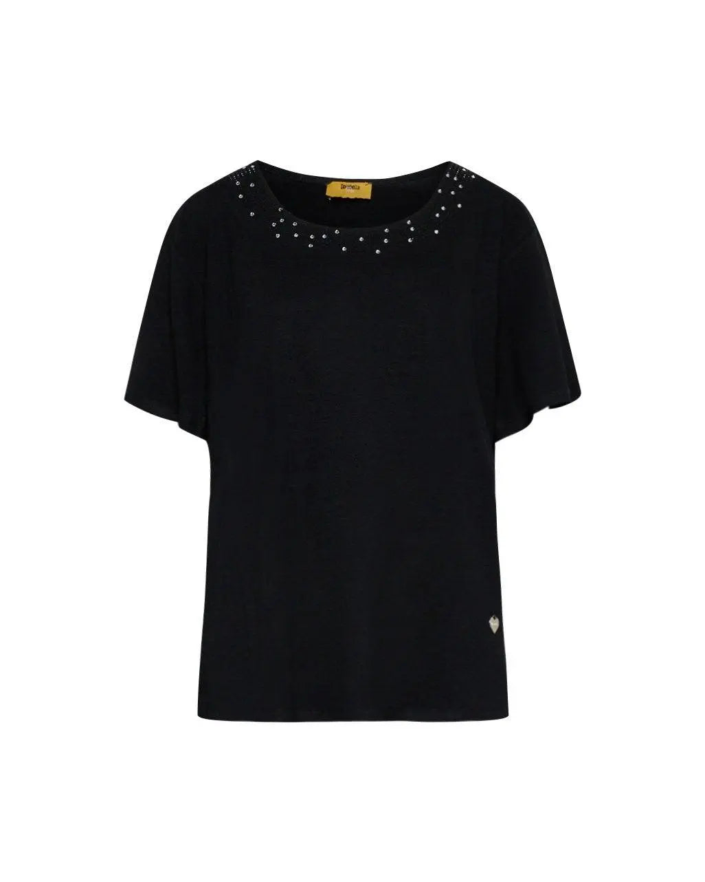 T-shirt in jersey di viscosa elasticizzata con applicazioni di strass BLACK