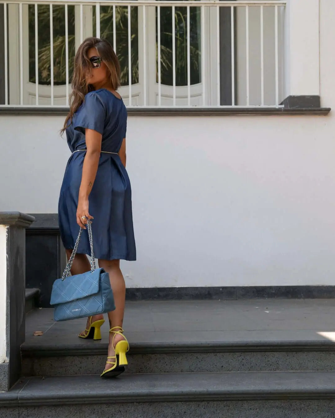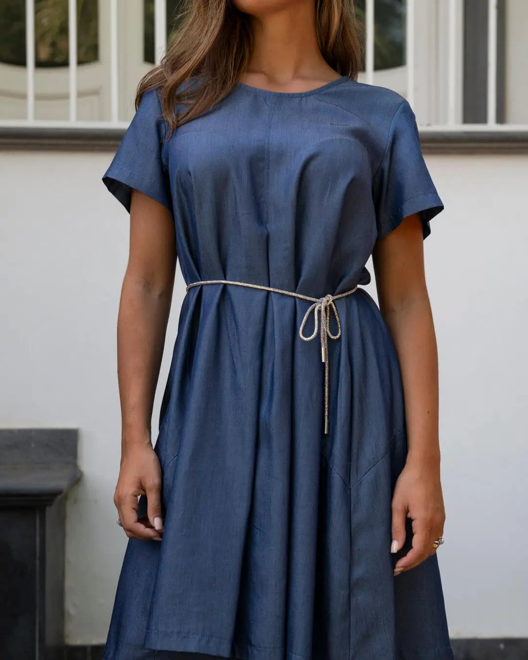 Abito a maniche corte in viscosa e lino con baciapiega e tasche DENIM