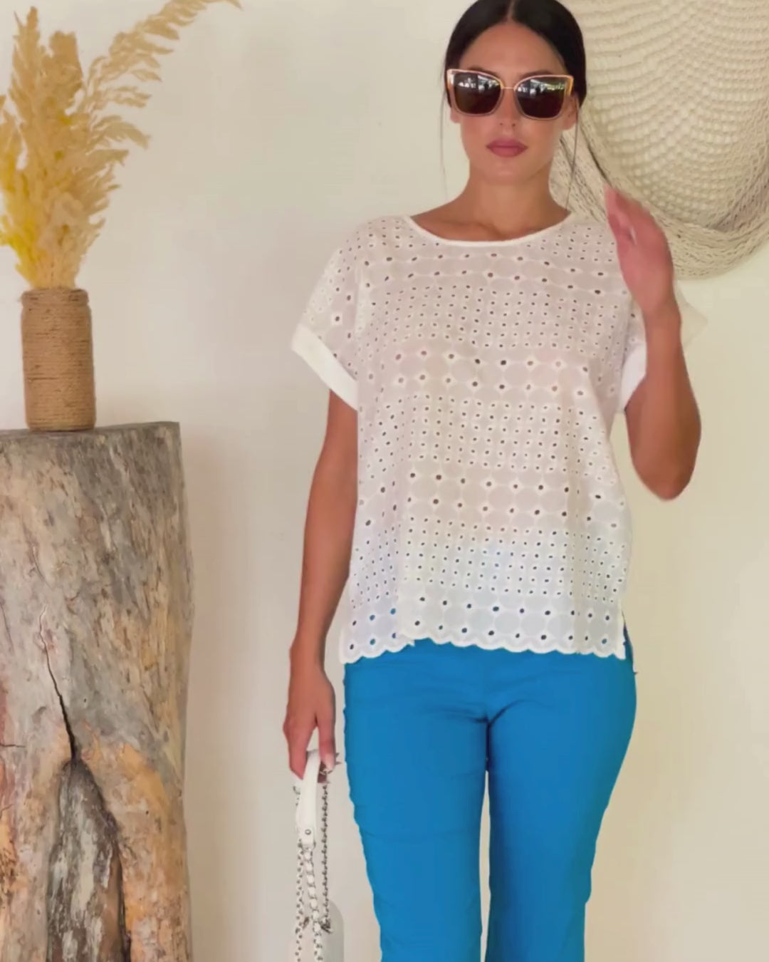 Blusa in pizzo San Gallo a mezza manica e risvolto BIANCO
