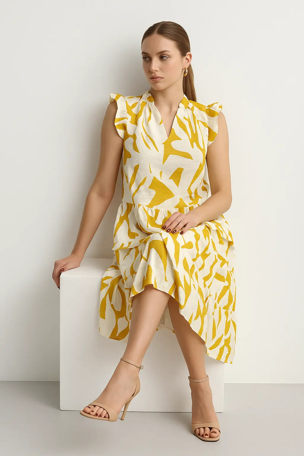 Scopri l'eleganza chic di questo abito femminile con balze e rouche alle maniche. Realizzato in morbida viscosa a fantasia, il suo design svolazzante ti farà brillare nei tuoi look estivi. Aggiungi un tocco luminoso alle tue giornate di stagione con questo abito unico.